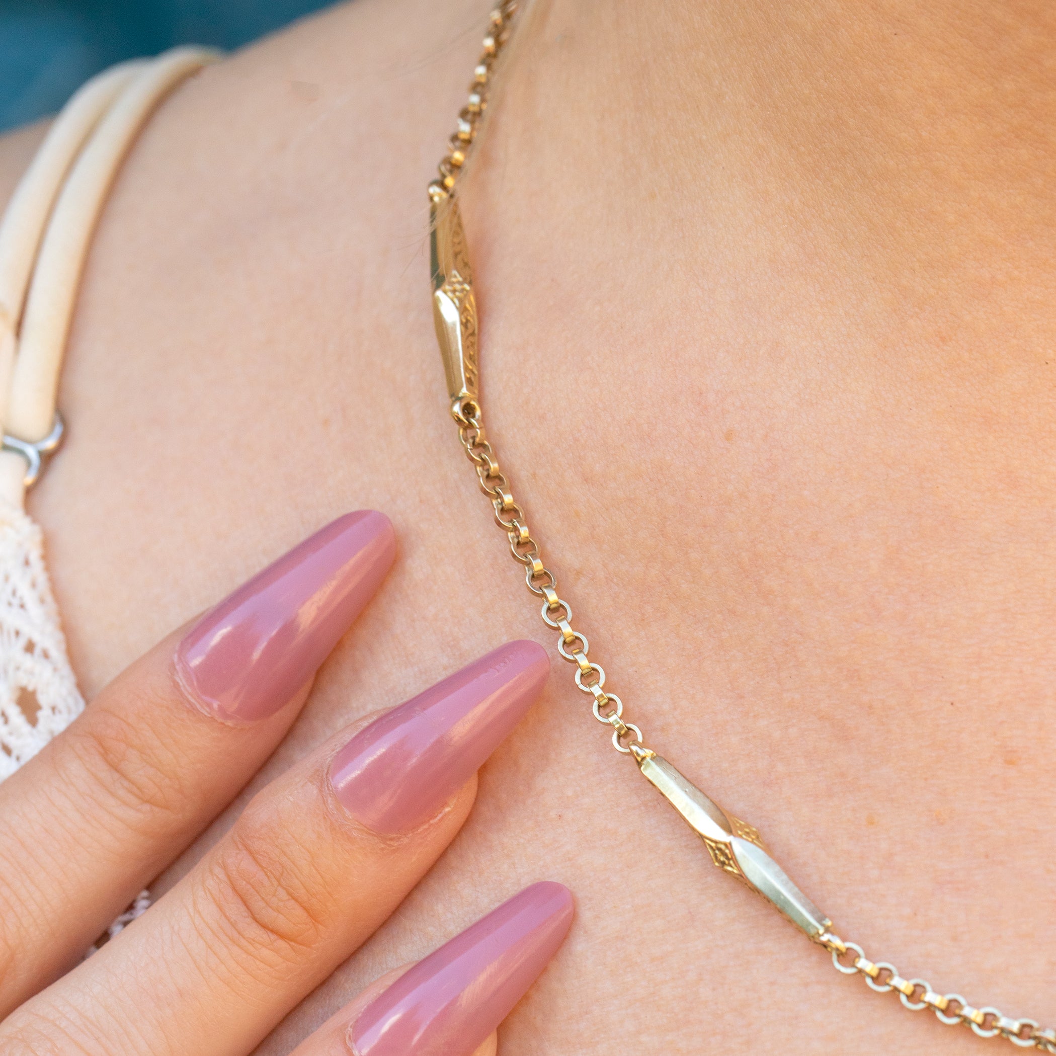 If you're a lover of exquisite and resplendent jewels, this antique 9ct Gold fancy engraved link chain is a must-have addition to your collection! Crafted with meticulous attention to detail, this splendorous Victorian chain has uniquely formed links boasting decorative floral engravings connected by lengths of chunky belcher links creating 19" of pure luxury.
