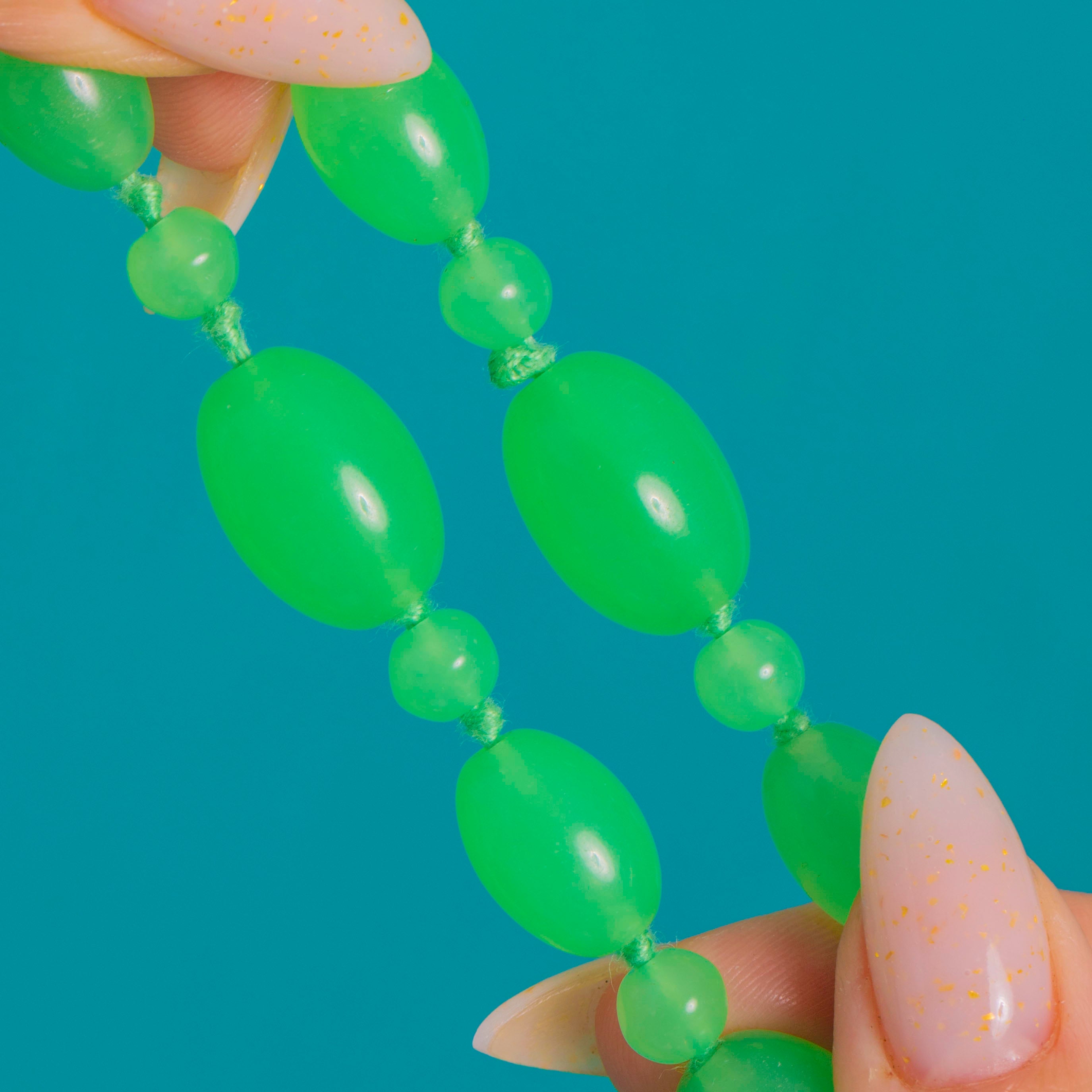 A luscious strand of bright jade-green Uranium Glass beads from the Art Deco era, hand-knotted on complementary green cord for beautiful drape and movement. The design alternates smooth oval beads with smaller round spacers, creating a rhythmic, elegant silhouette that sits effortlessly below the collarbone.