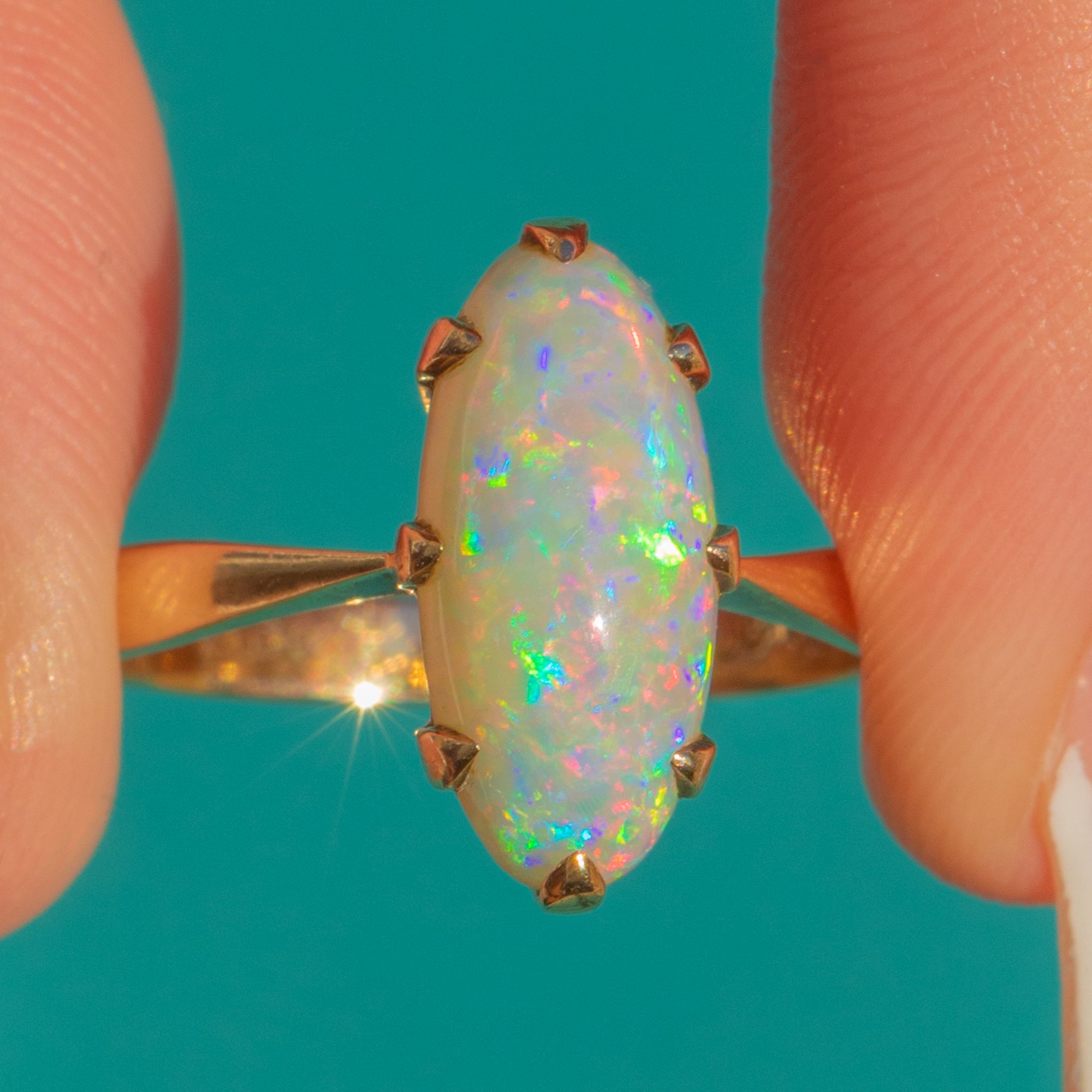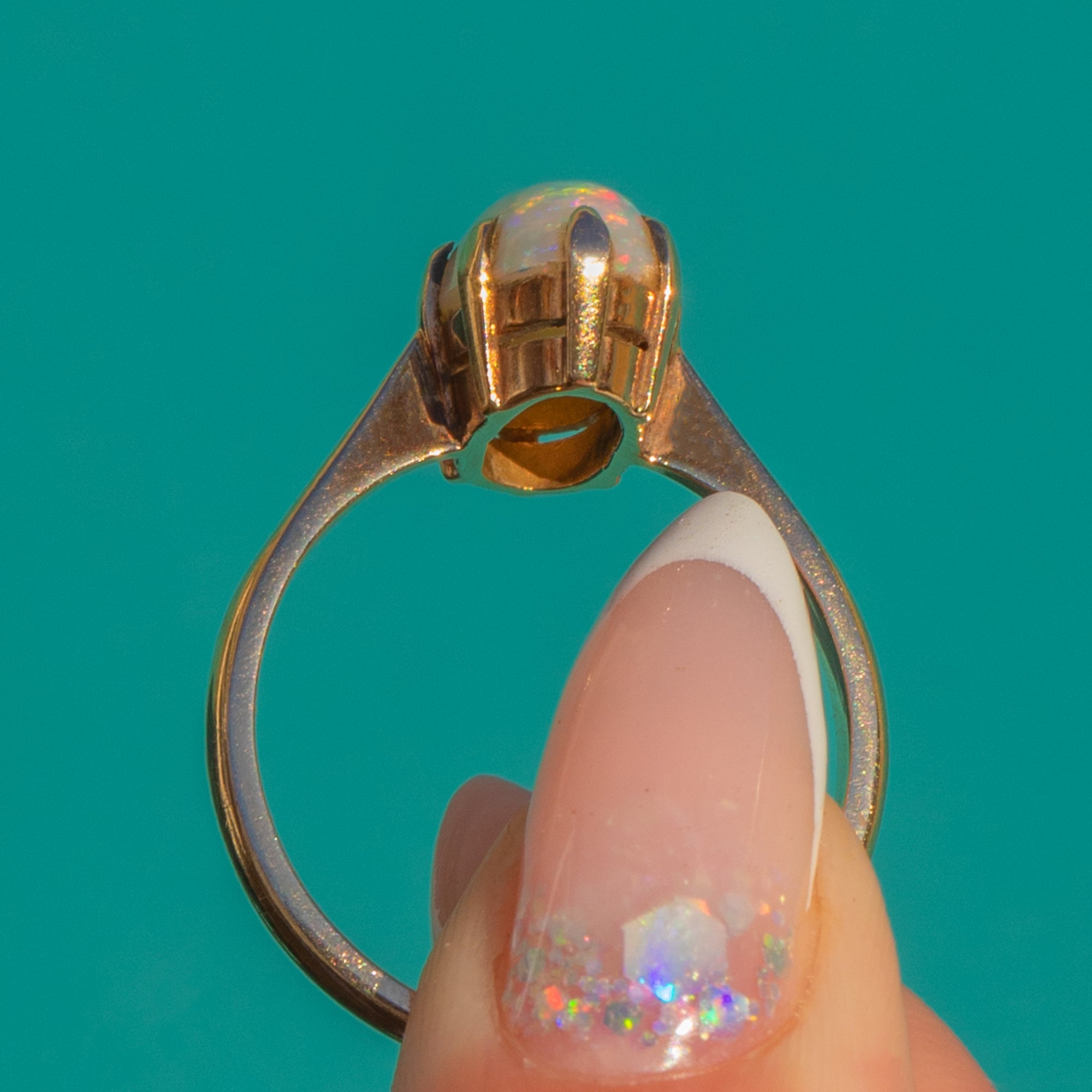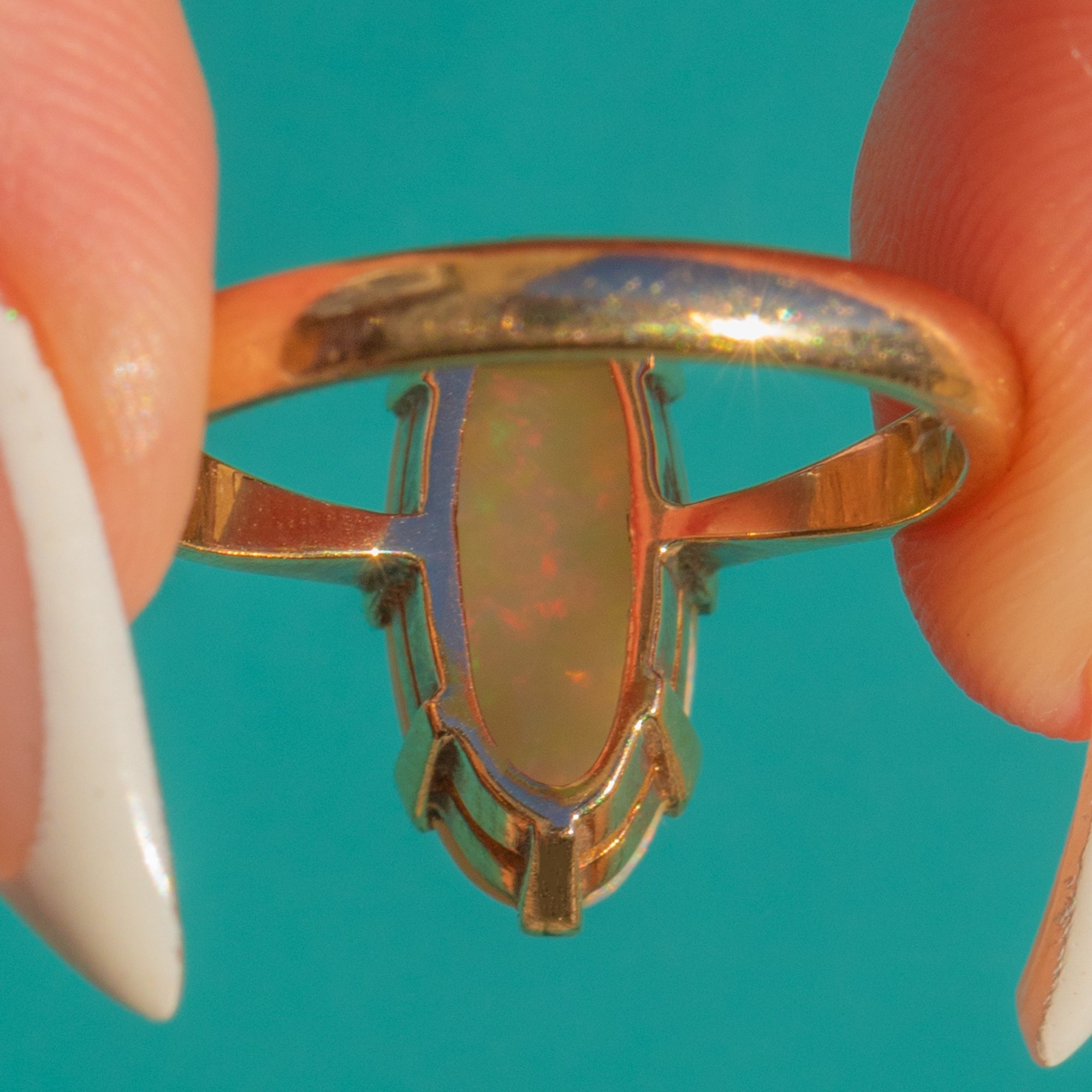 Gefertigt aus massivem 9ct Gold mit klaren antiken Punzen, wirkt der Ring sowohl robust als auch stilvoll. Der Opal ist glänzend, auffällig und wunderschön gefasst, sodass er aus jedem Blickwinkel ein faszinierendes Farbspiel bietet.