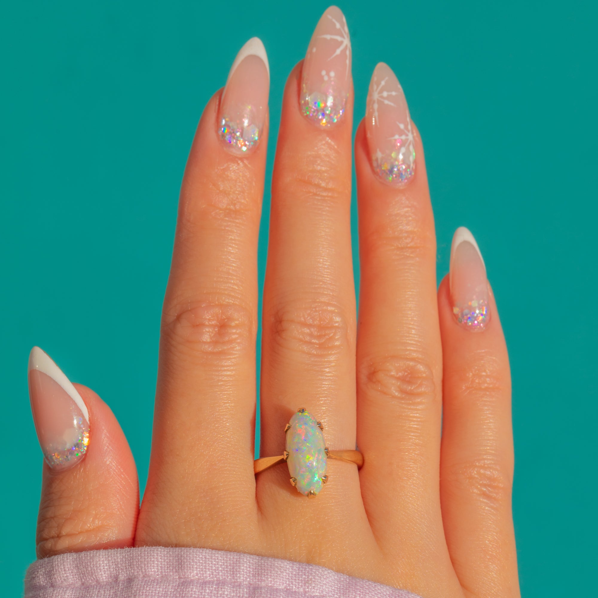 EXZELLENT: Das Opal-Cabochon ist hochglänzend, ohne Absplitterungen, Risse oder Gebrauchsspuren, und zeigt lebendige Farbschimmer. Die Fassung ist sicher, die Schultern sind klar konturiert und zeigen nur minimale altersbedingte Spuren.