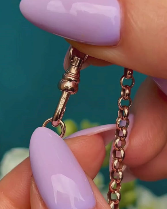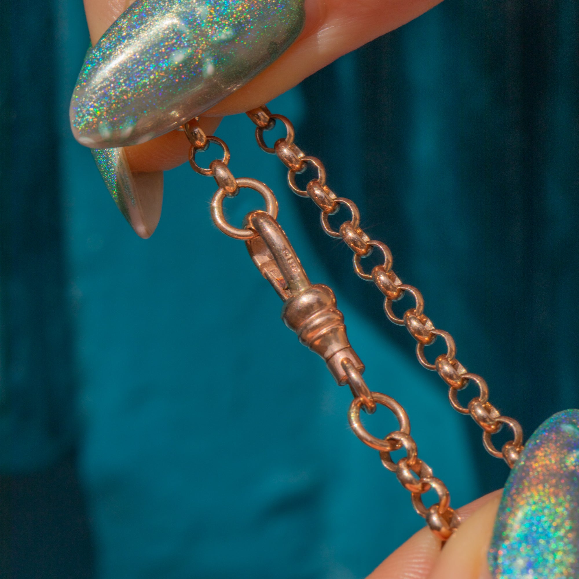 EXCELLENT. This 20" antique 9ct rose Gold belcher chain is in impeccable condition! The links are all firmly affixed with a consistent rosy hue throughout. The dog clip has wonderful spring back allowing you to wear this Victorian belcher chain with absolute confidence!