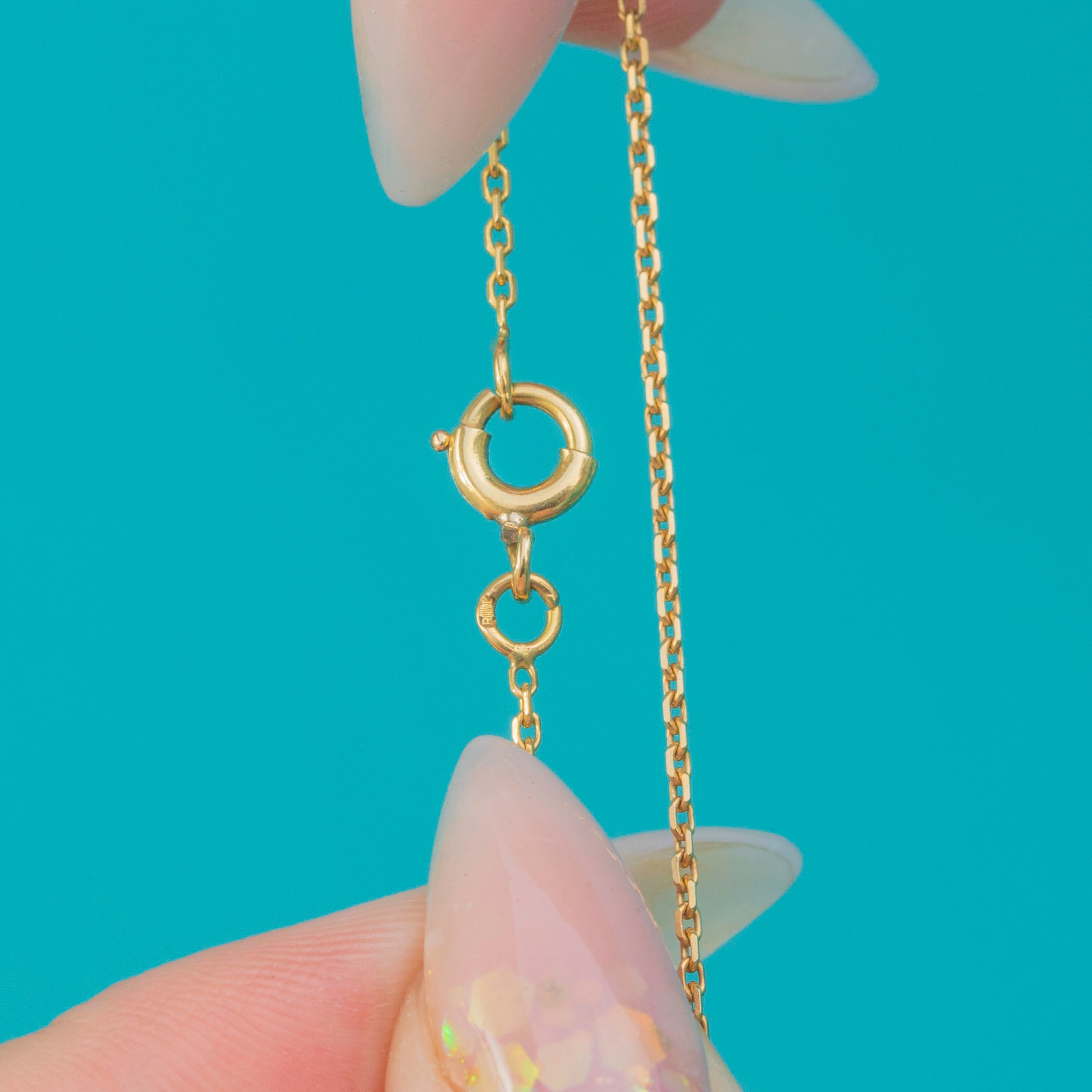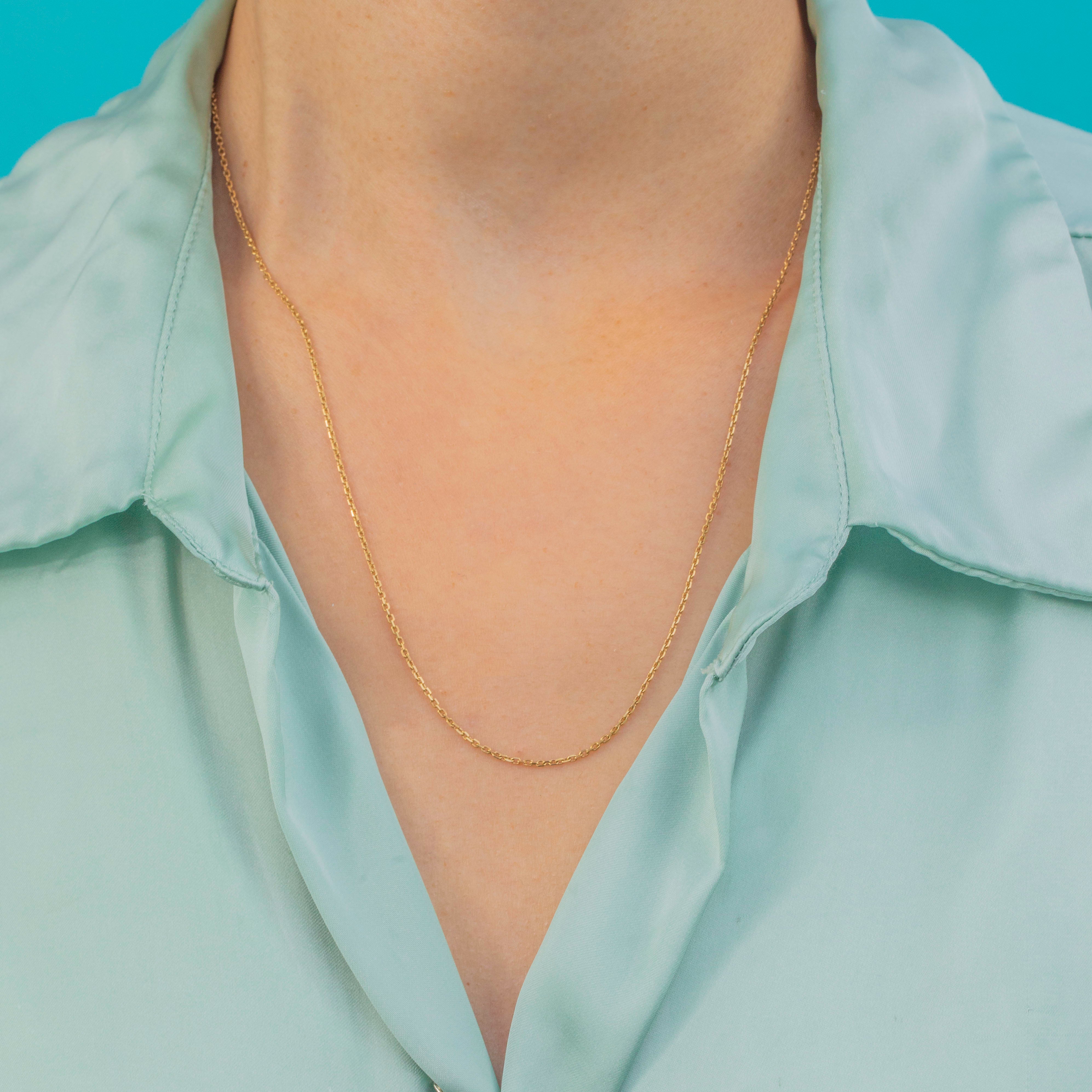 An elegant Edwardian chain crafted in rich 18ct Gold. Measuring 20" long, it features fine 1.25mm links, making it perfect for pairing with a delicate pendant or wearing as a refined standalone chain. Its subtle proportions and warm Gold tone make it an ideal everyday antique piece.