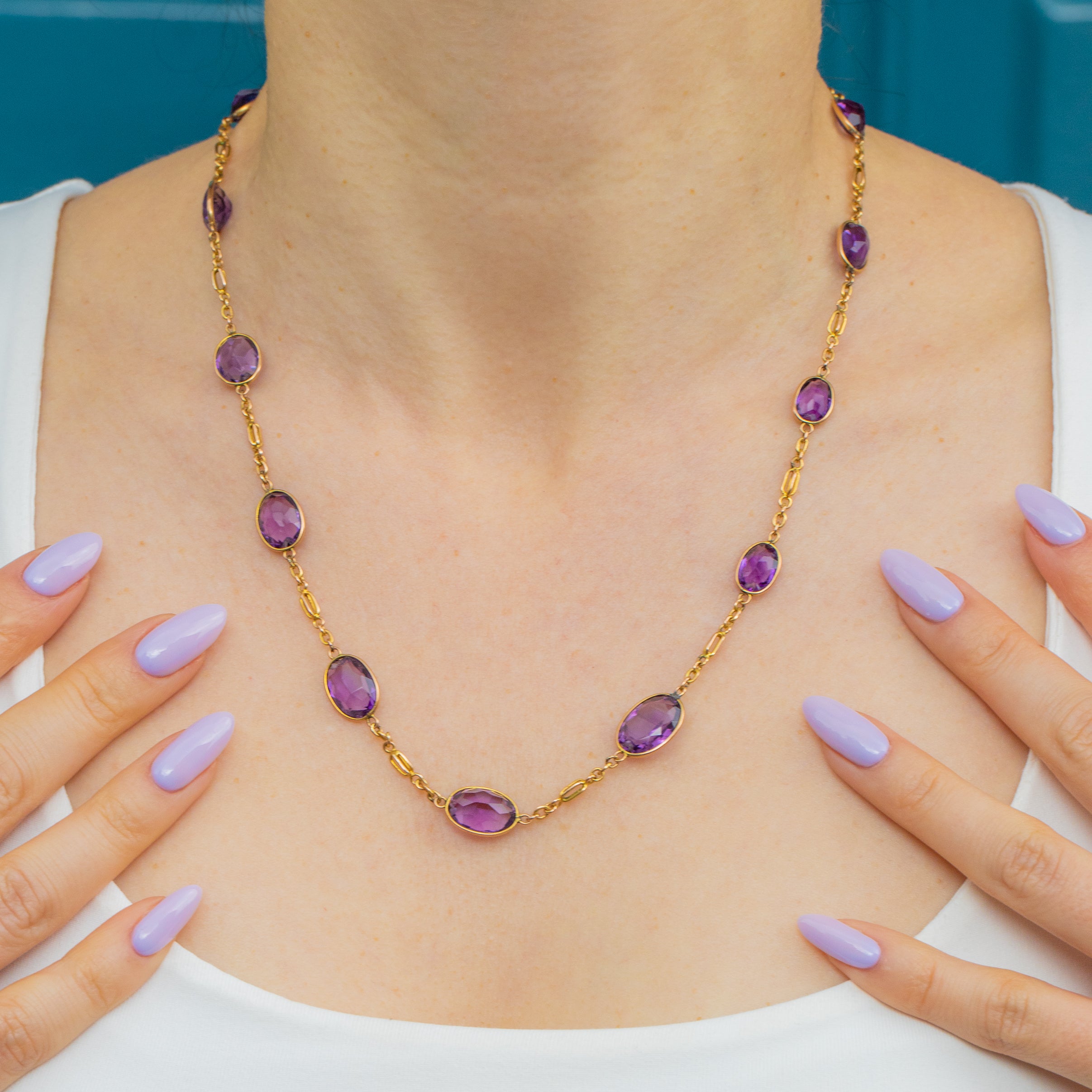 Add a regal touch to any outfit with this Victorian 9ct Gold Amethyst necklace! Inlaid with 13 vibrant, violet Amethysts boasting an impressive 27.34ct, their graduating size accentuates your neckline resting just above the collarbone.