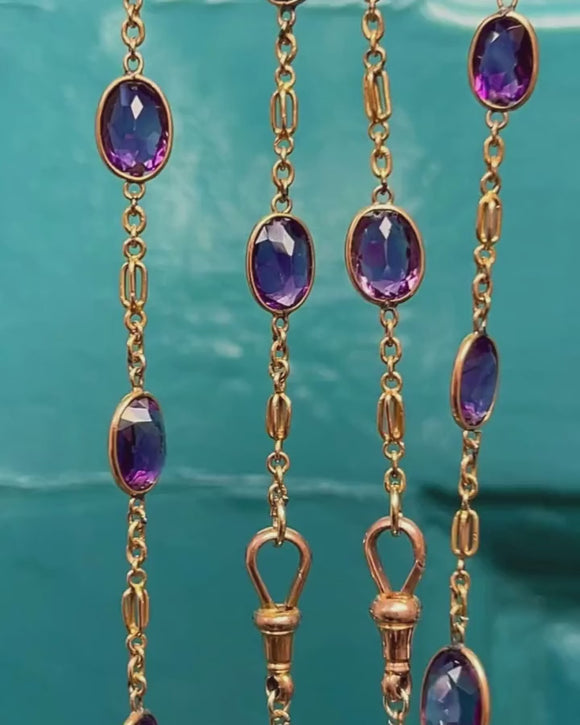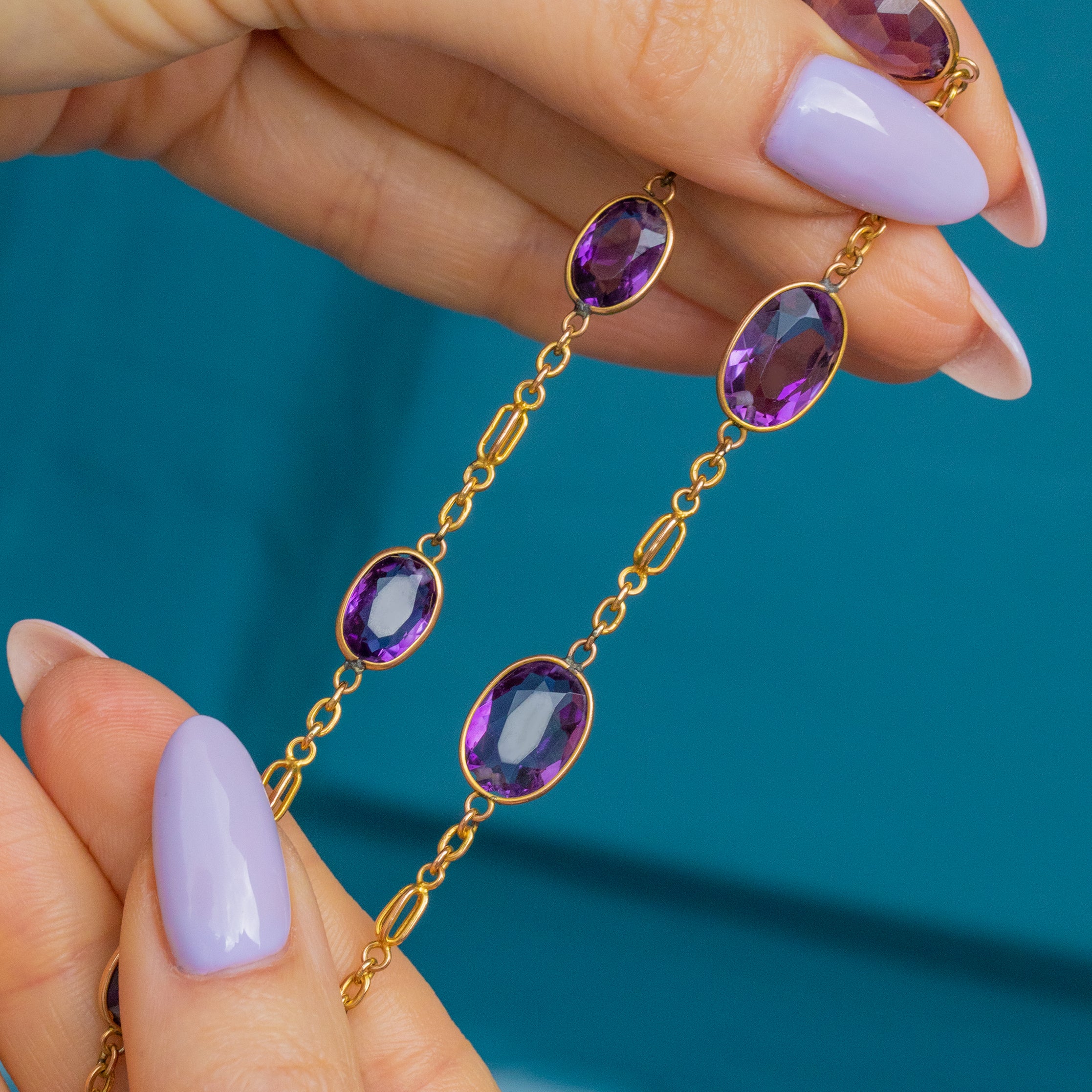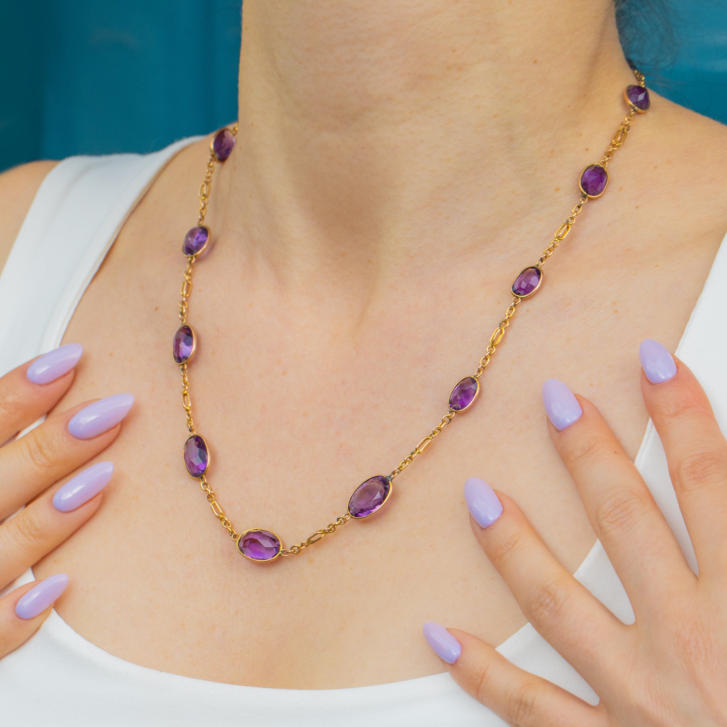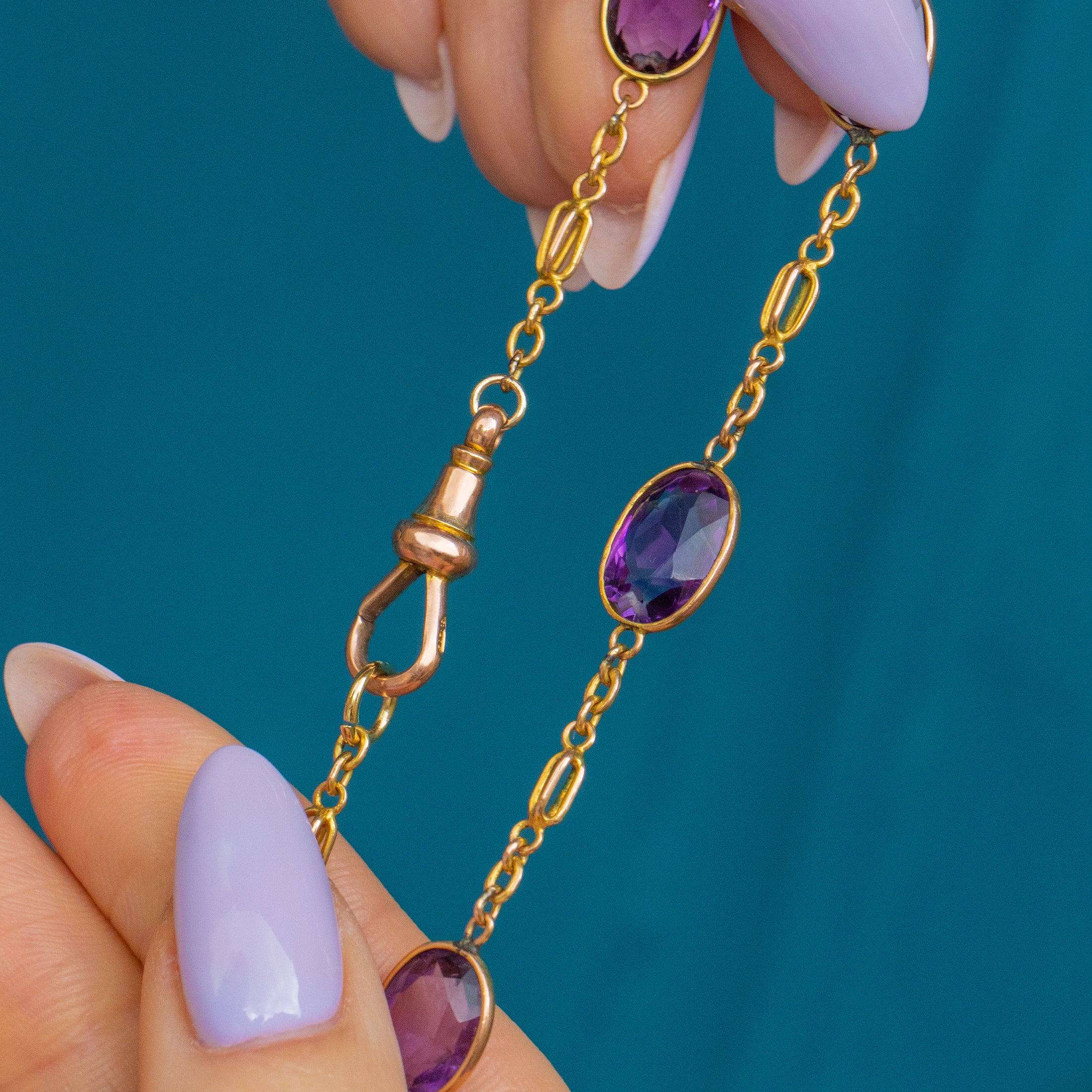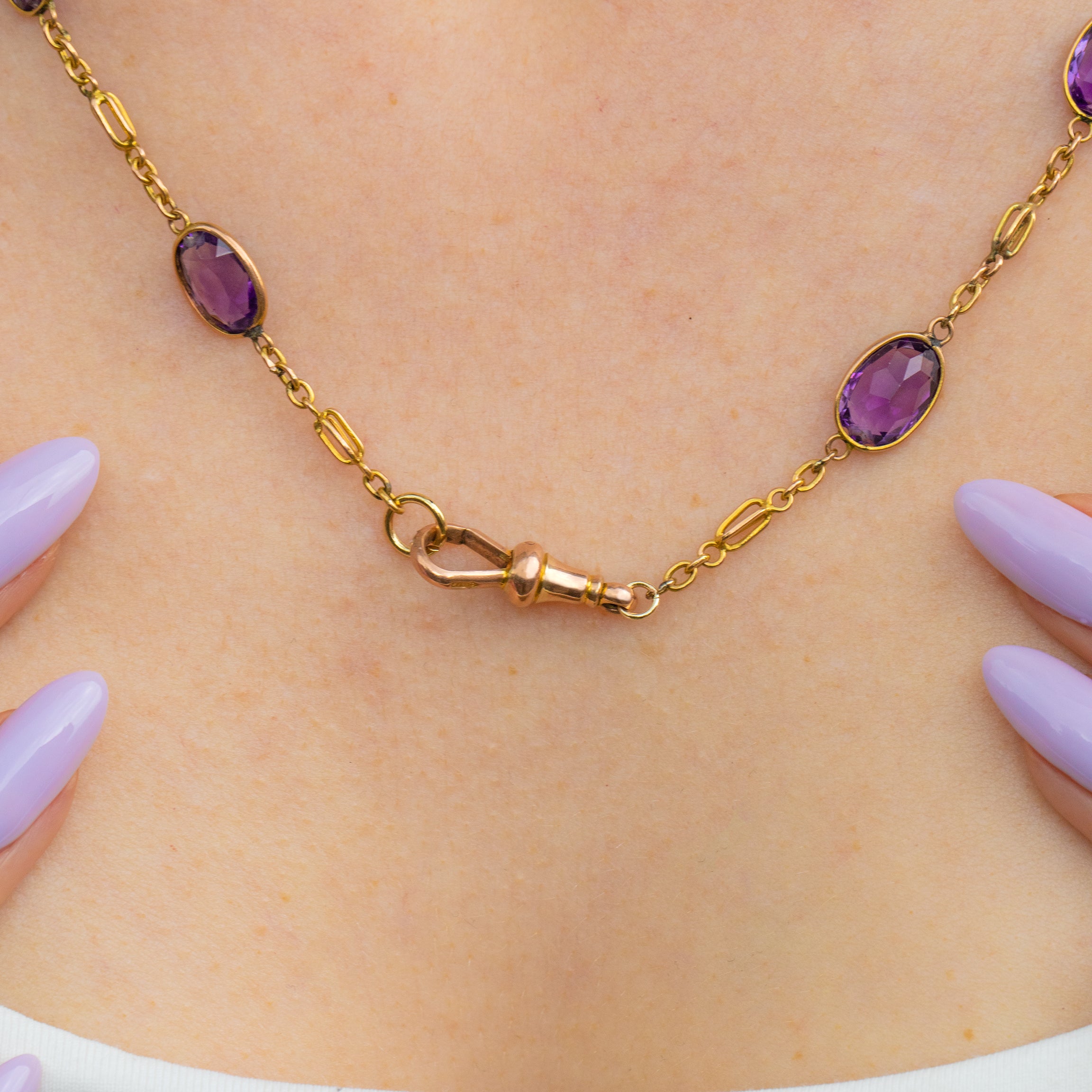 EXCELLENT. This Victorian 9ct Gold Amethyst necklace is in impeccable condition for its long life! The Amethysts are secure within their settings and are free from any chips, scratches or abrasions to their facets. Plus, and most importantly, the 9ct Gold chain is strong, with all links still intact so you can easily wear and enjoy this beautiful necklace for many more years!