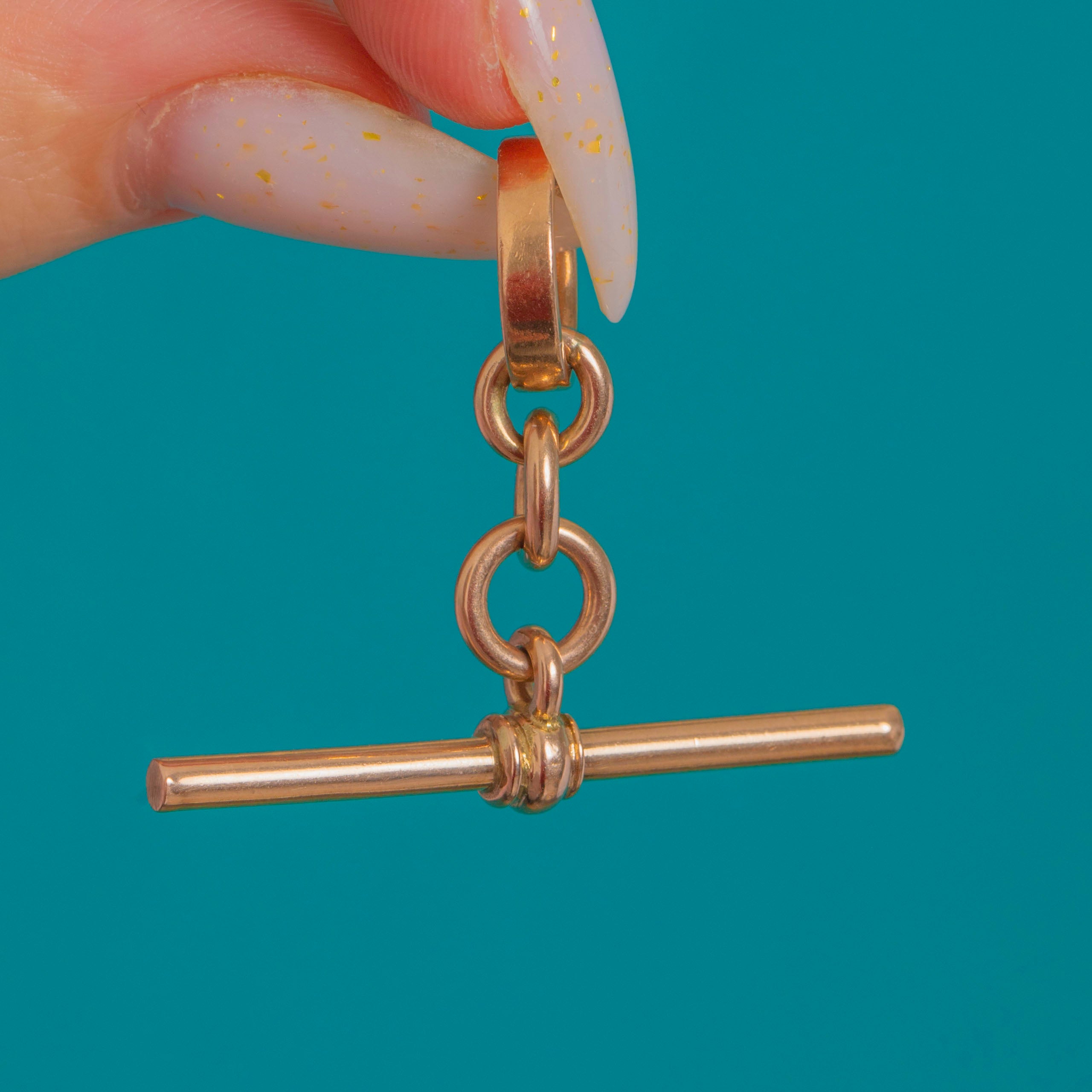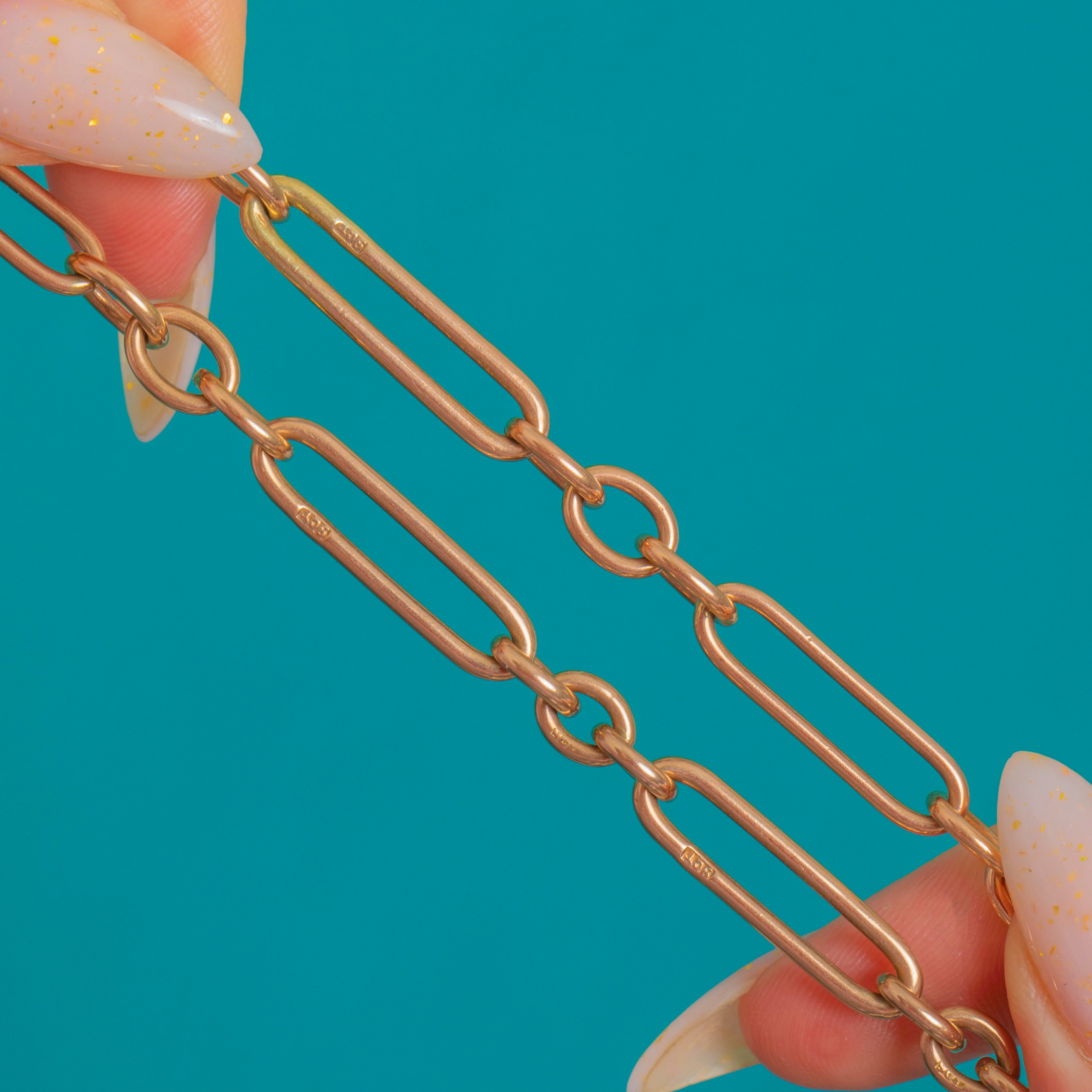 EXCELLENT: Links are crisp and well‑preserved with only light, superficial surface wear commensurate with age. The dog clip and T‑bar are secure and operate smoothly; joins are sound with subtle solder seams typical of antique manufacture. Overall beautifully cared for with no gemstones to note and no visible later repairs.