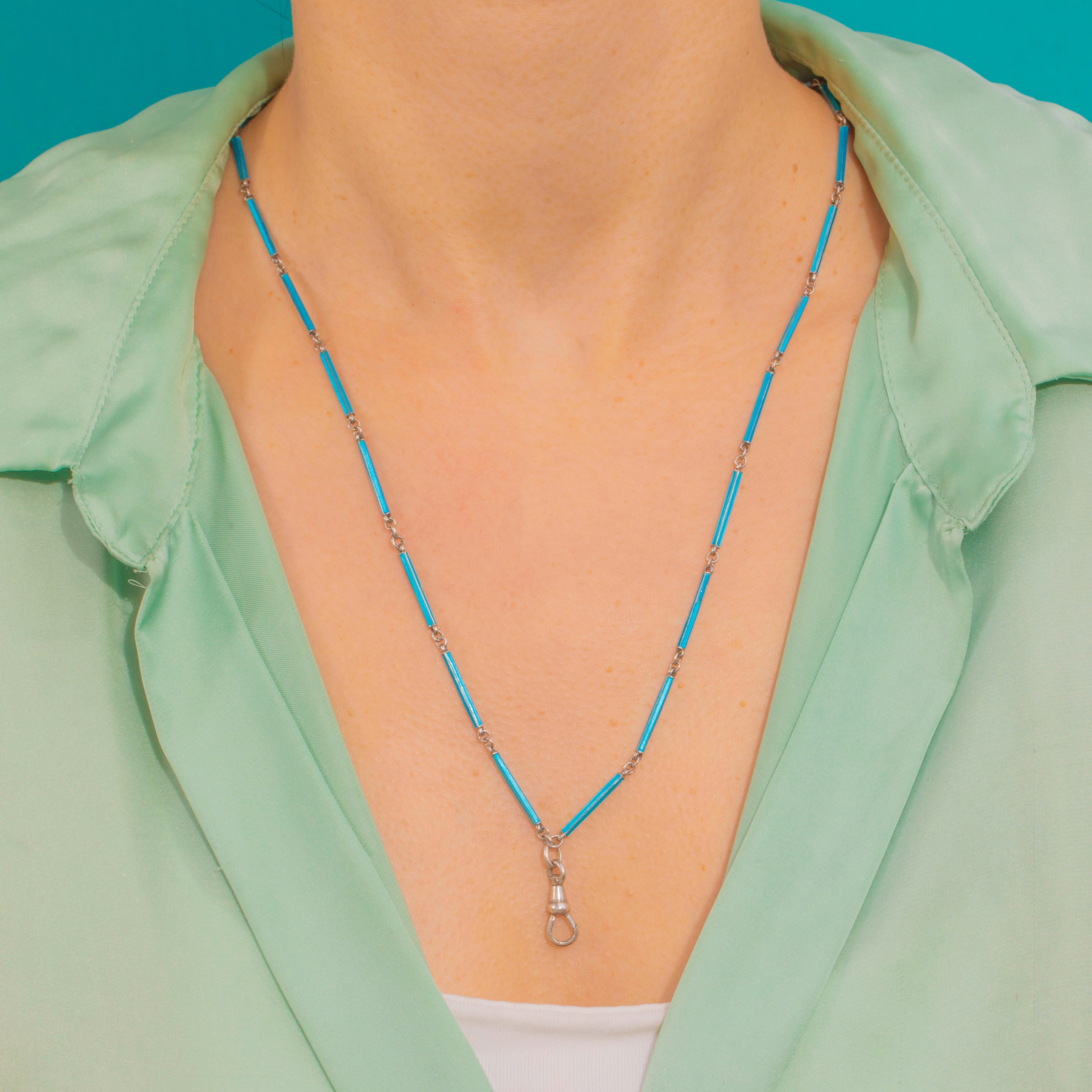 Awash in a glossy robin’s‑egg blue, this Edwardian Silver bar‑link chain is a joyful study in colour and rhythm. Slim Enamelled batons are articulated with petite links to drape with elegant fluidity, their turquoise hue lending a fresh pop to any neckline.