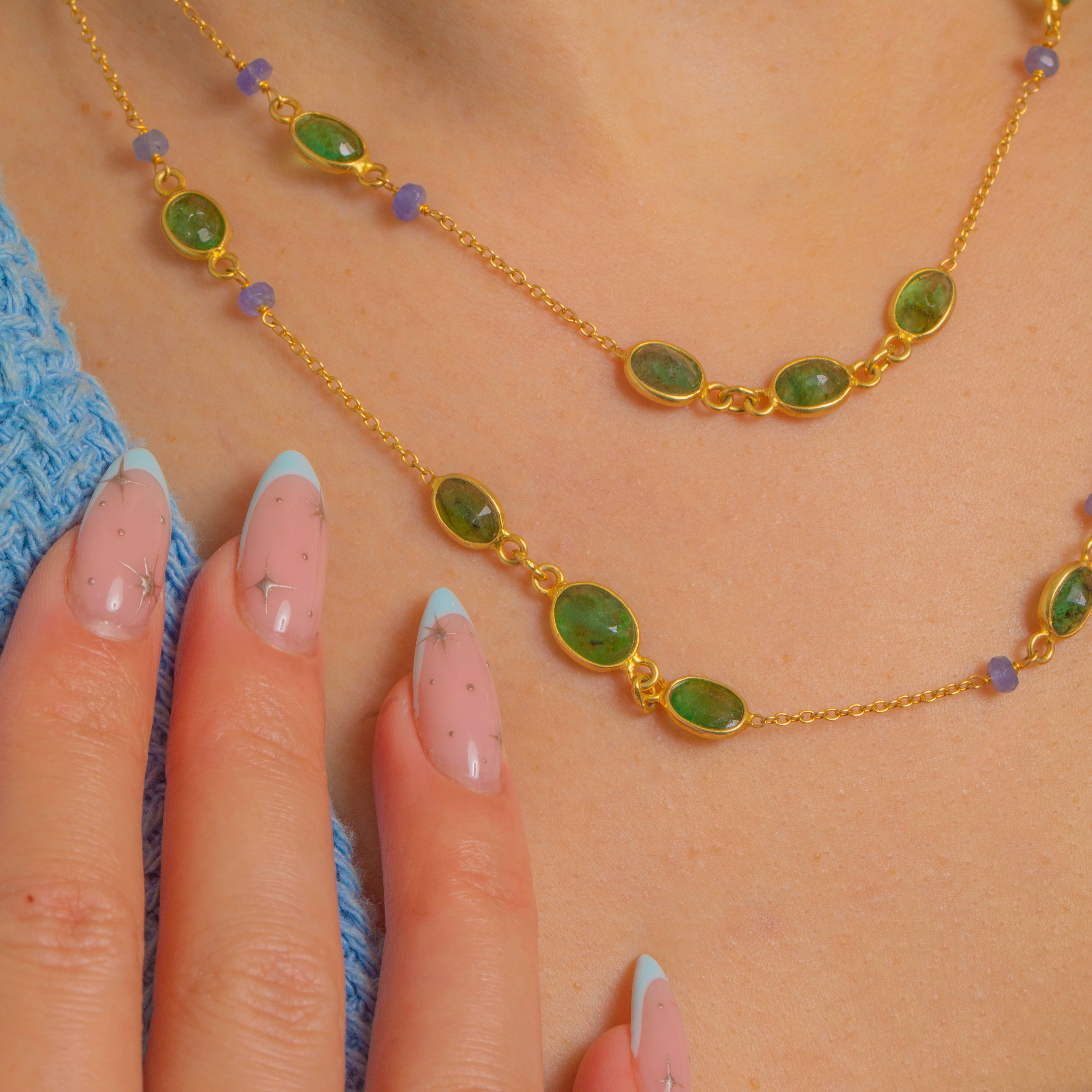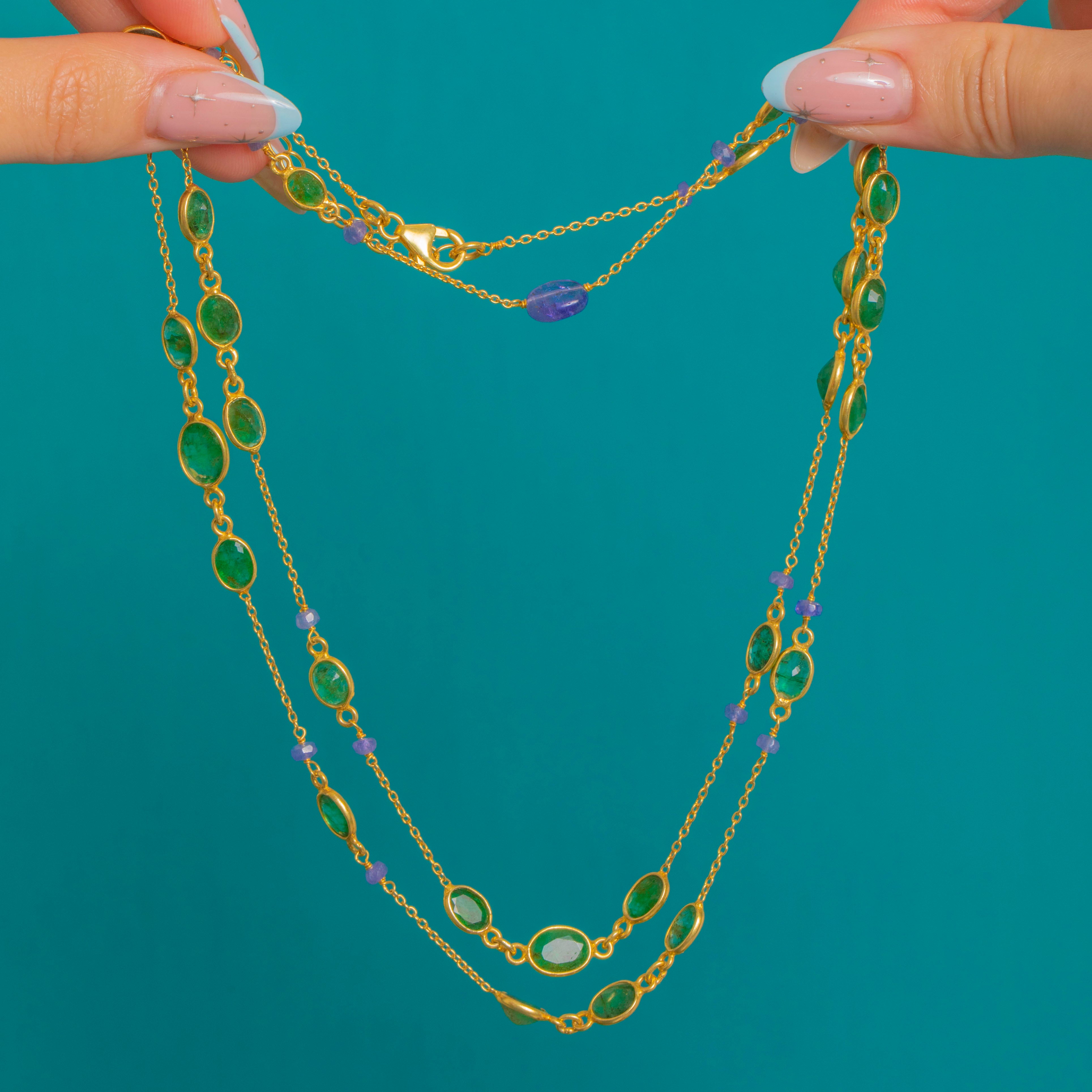 A graceful “by the yard” station necklace, glowing with verdant Emeralds and punctuated by velvety violet Iolite. The oval green gems are framed in smooth bezels and set along a fine 15ct Gold-gilded Sterling Silver chain, with petite Iolite beads and a single larger Iolite accent lending a chic pop of colour. The look is delicate, luminous and effortlessly elegant.