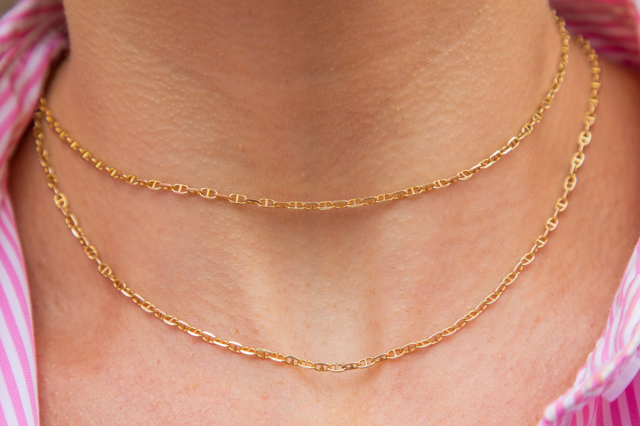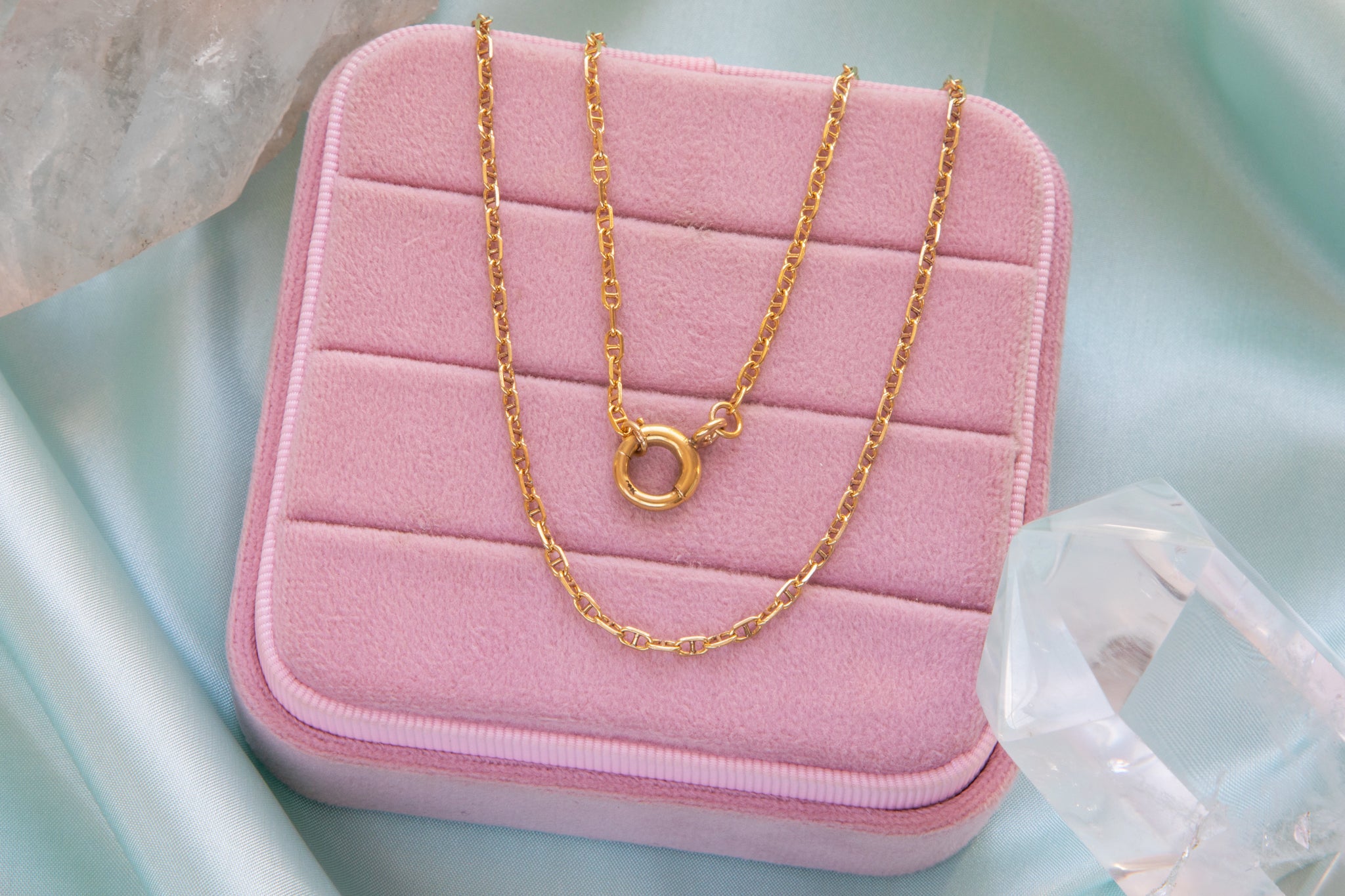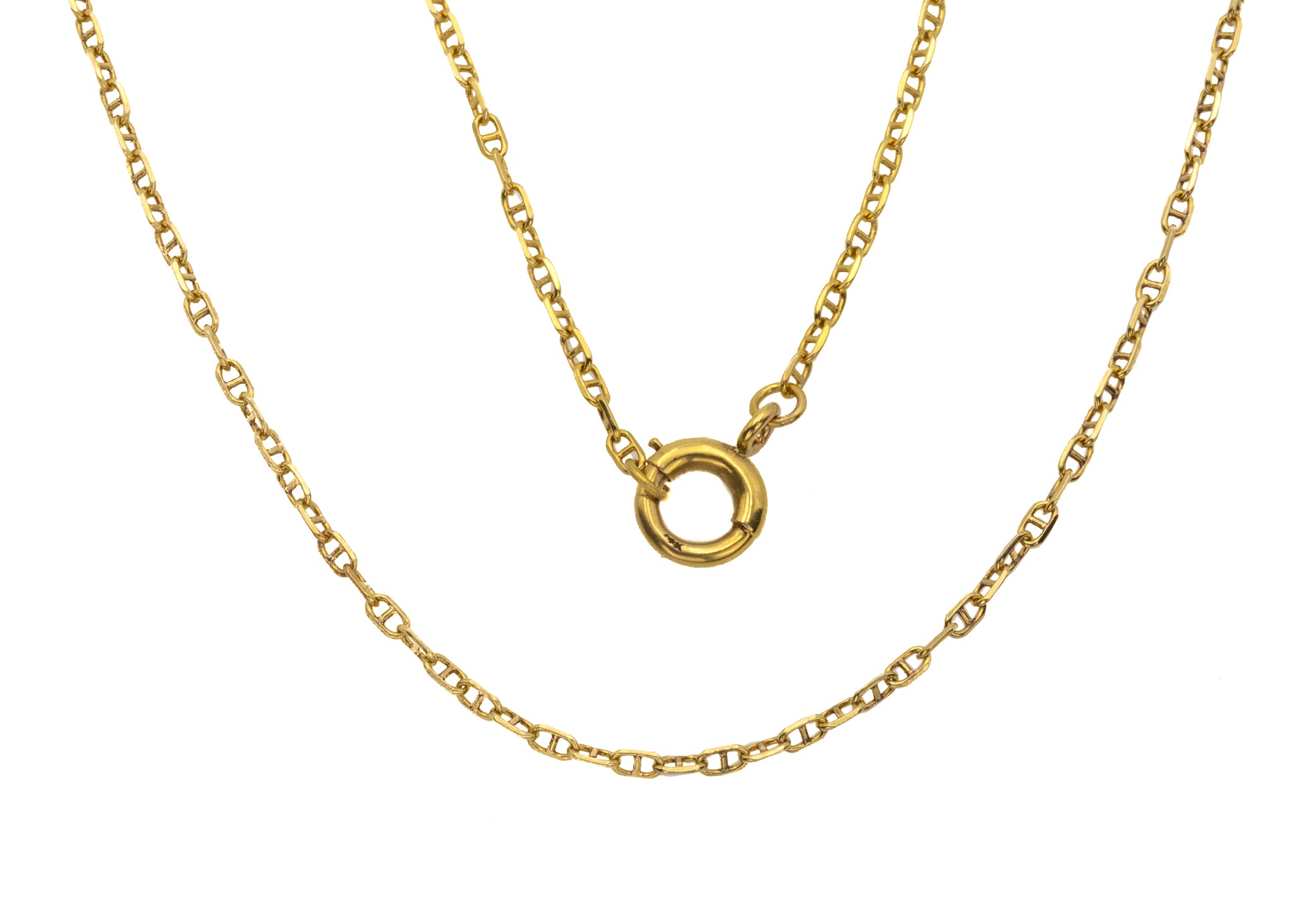 This 32" antique 14ct Gold dainty mariner-link chain necklace is truly irresistible! Her aesthetically pleasing interlocking oval links make for the most desirable chain.