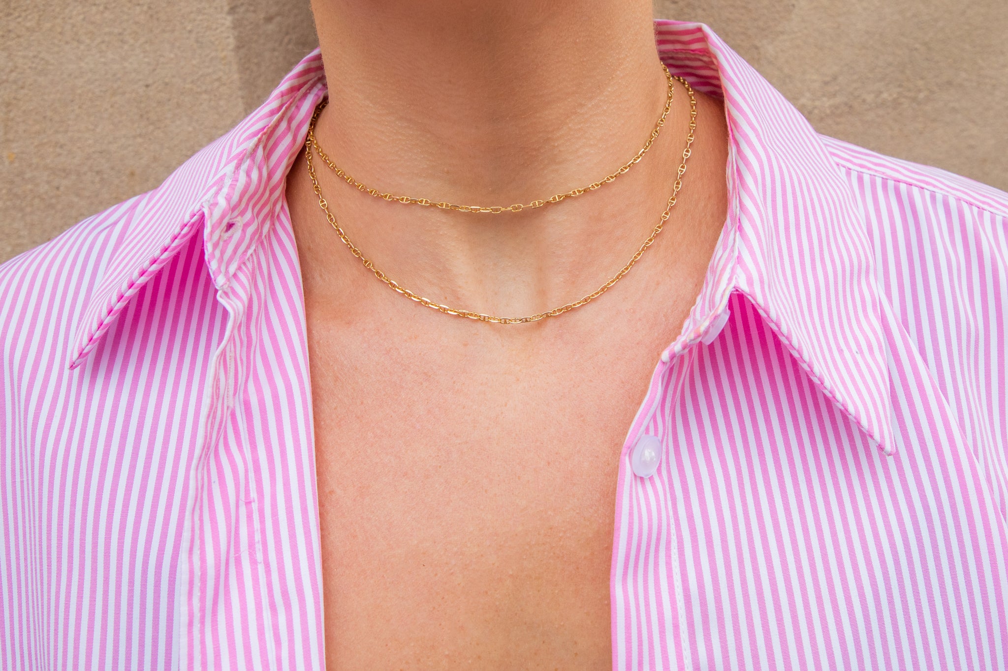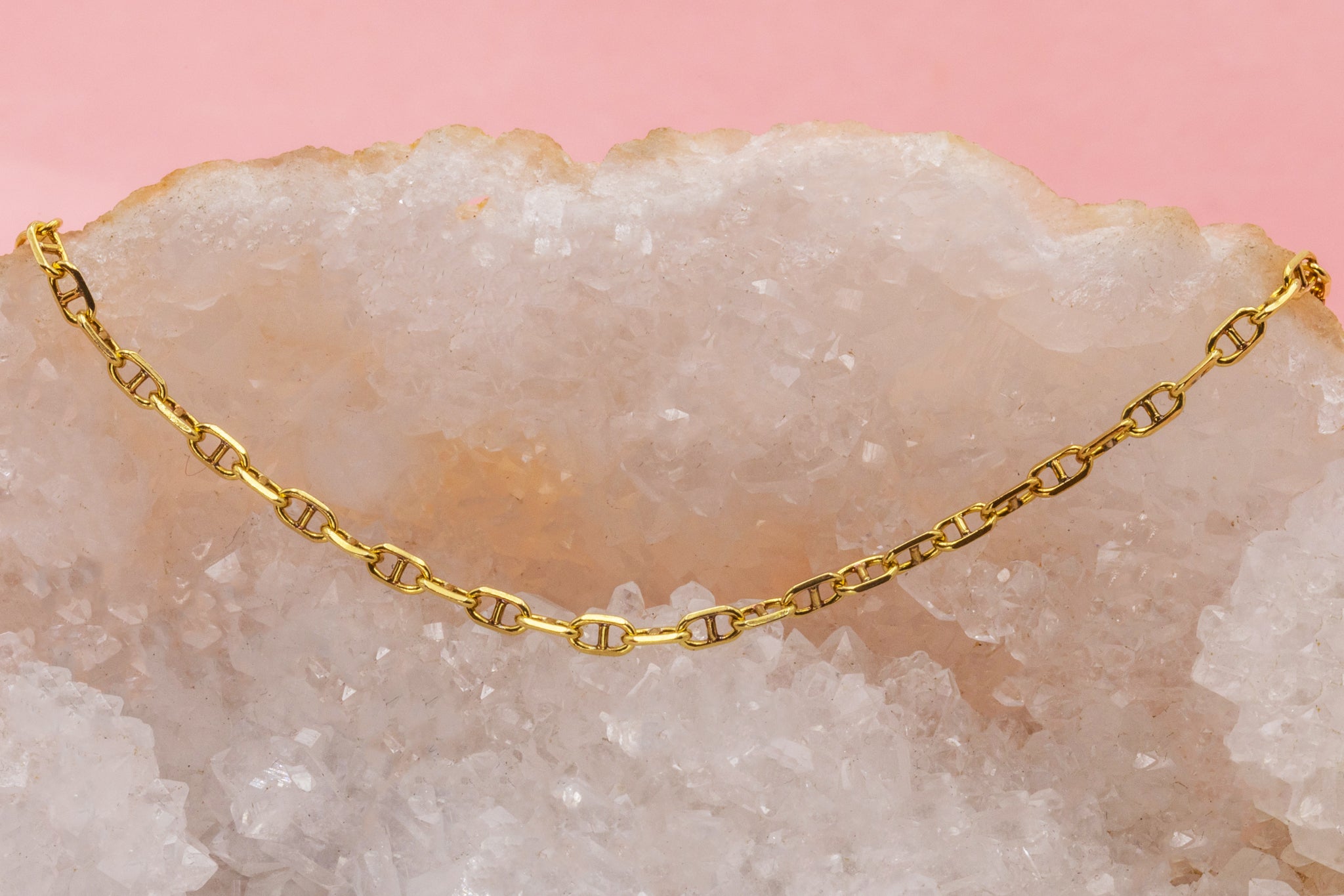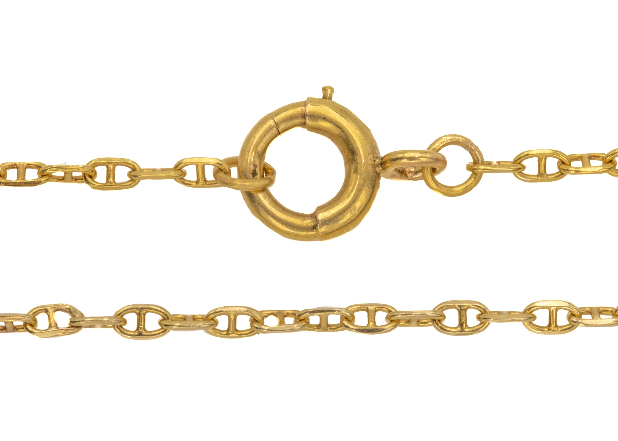 This 32" antique 14ct Gold dainty mariner-link chain necklace is truly irresistible! Her aesthetically pleasing interlocking oval links make for the most desirable chain.