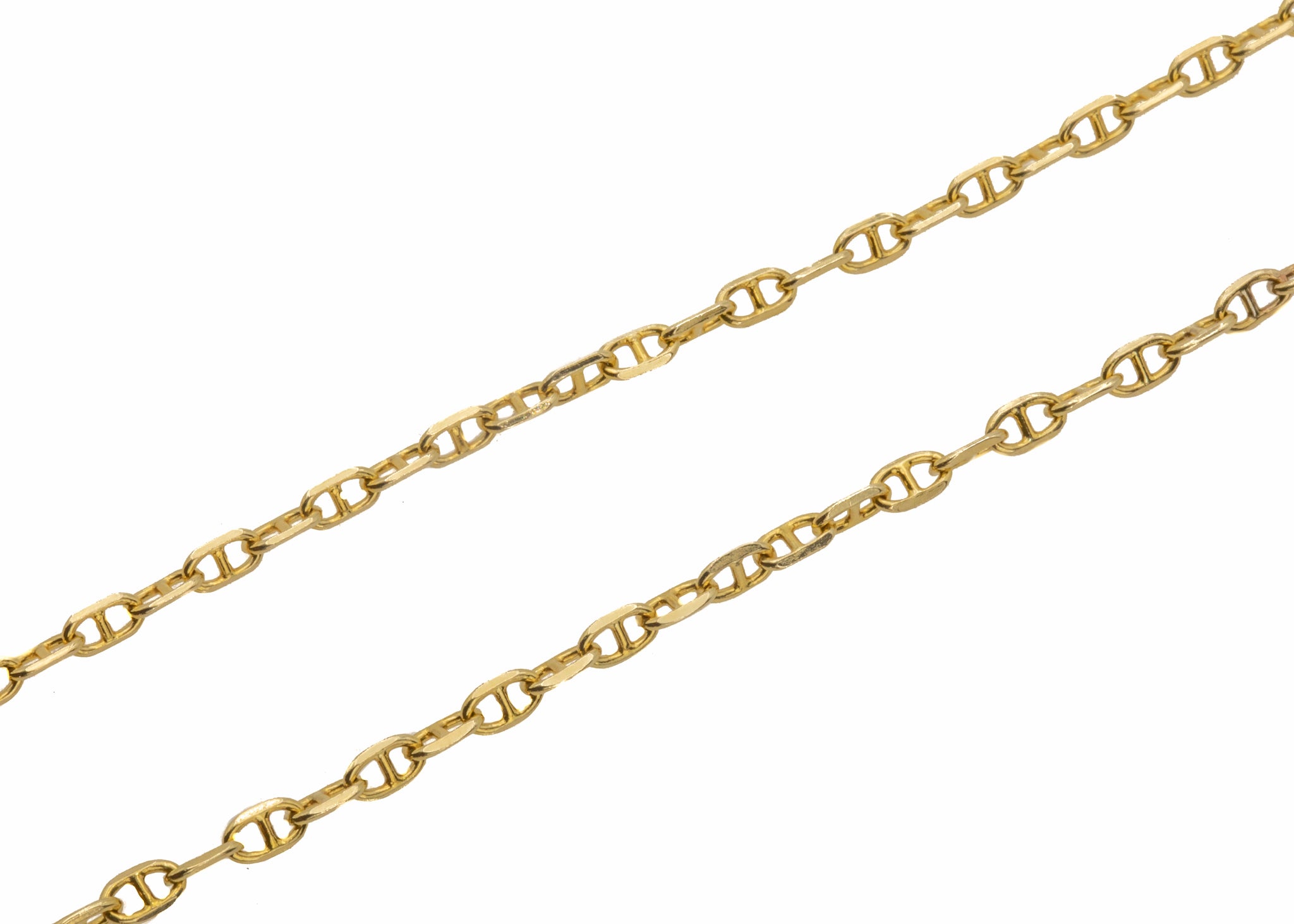 EXCELLENT: This 32" antique 14ct Gold dainty mariner-link chain necklace is in excellent condition throughout. There is little to report, her links have kept their shape remarkably, secure to one another with no damage to note. Her 14ct Gold has a sumptuous buttery hue and boasts a desirable chunky bolt ring, you won't be able to resist her!