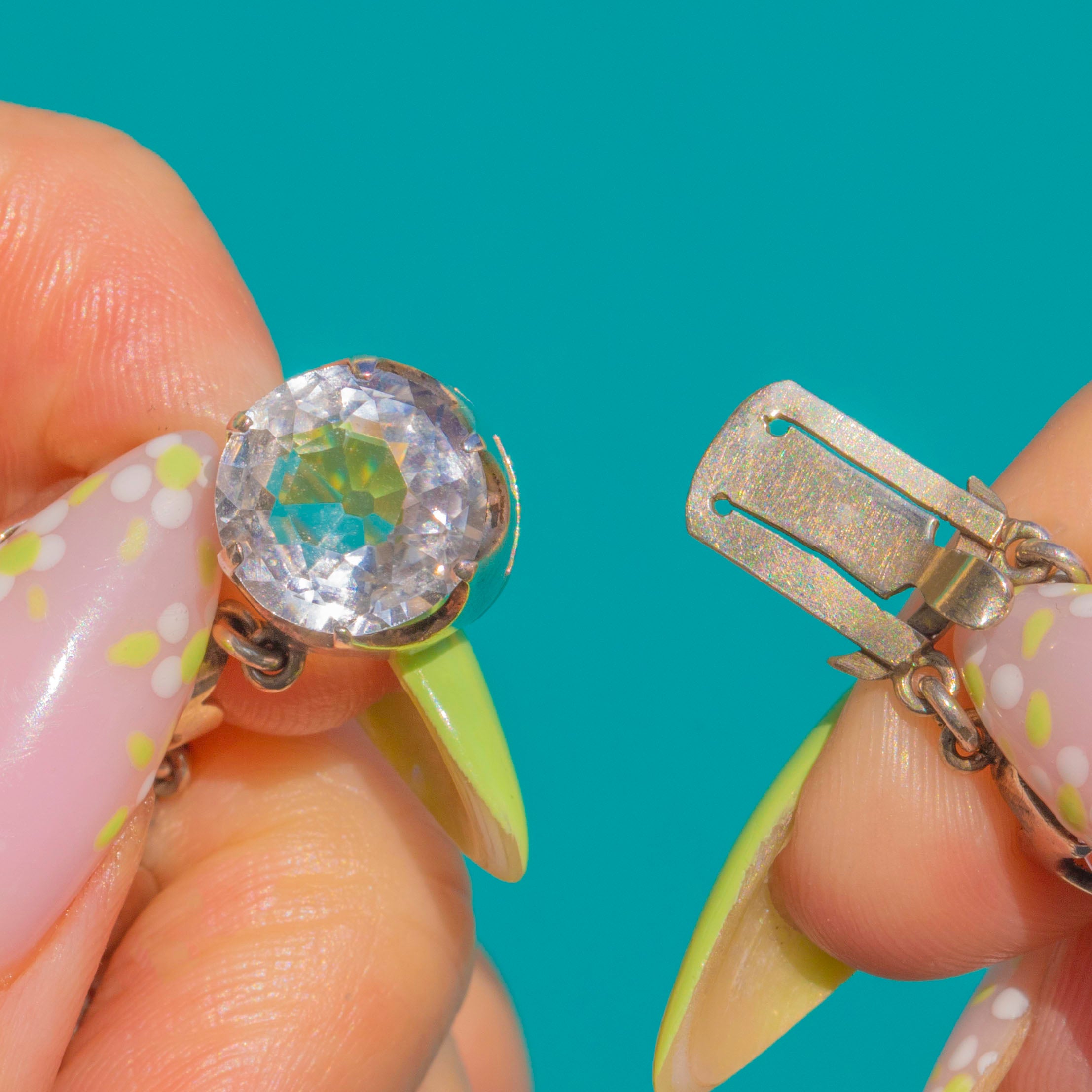 Ein strahlendes Victorian Armband aus Bergkristall, durchgehend besetzt mit abgestuften, rund facettierten Bergkristallen, die mit eisiger Brillanz funkeln. Jeder Stein ist von einer hübschen, gekrönten Zargenfassung aus Sterlingsilber umrahmt und durch feine Gelenke verbunden, sodass das Armband geschmeidig fällt und bei jeder Bewegung das Licht einfängt.