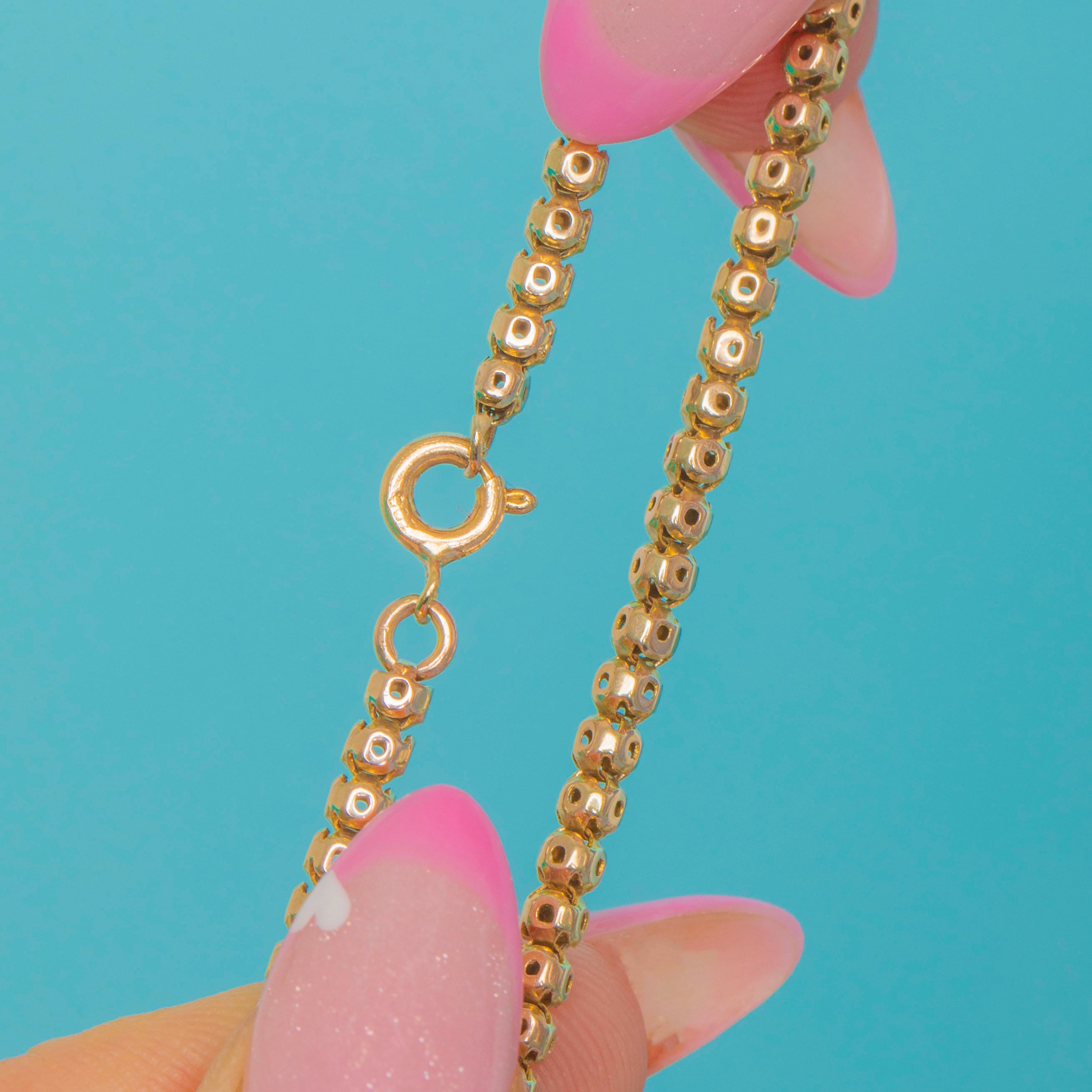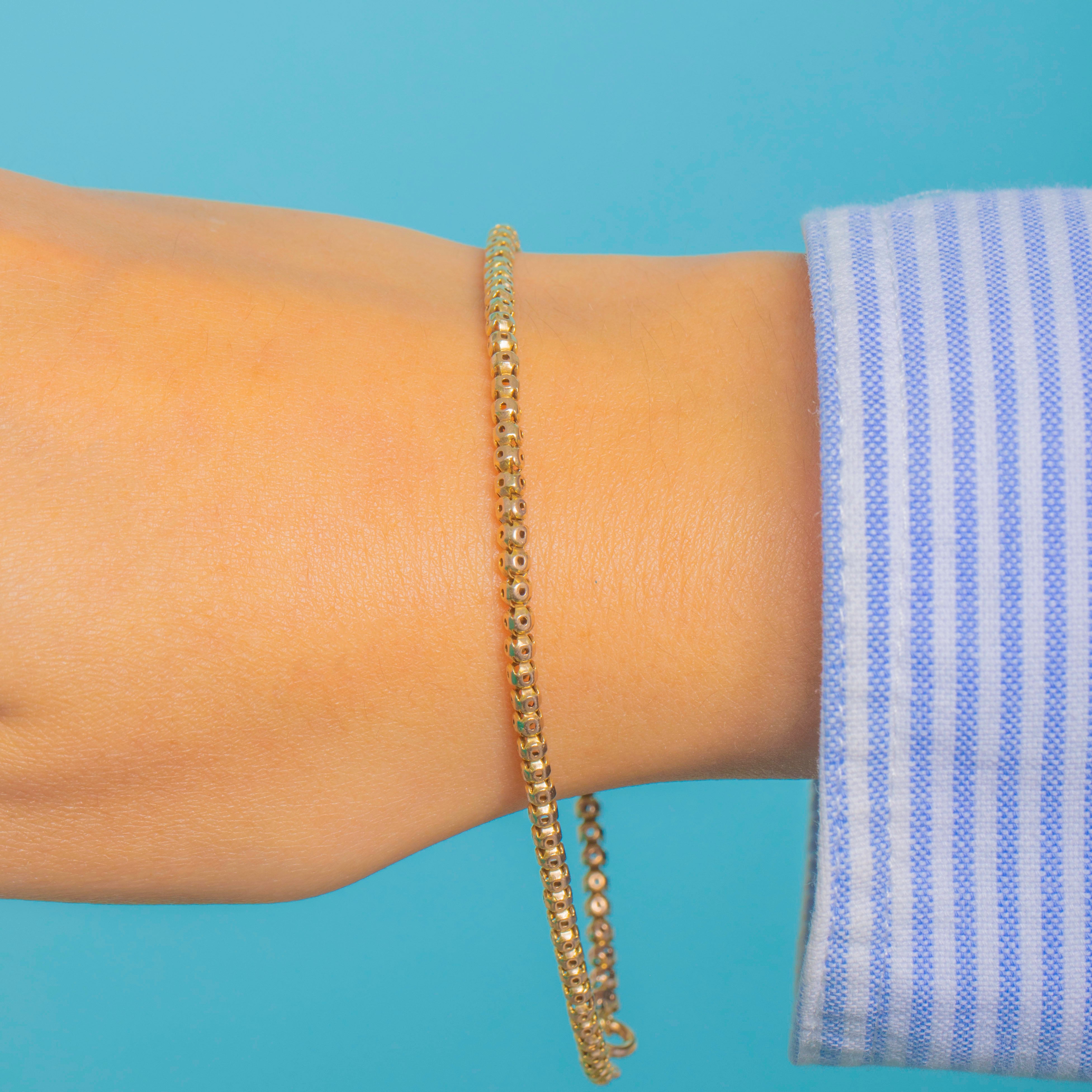 EXCELLENT: The Gold links are in superb condition with no dents or repairs, retaining their crisp pierced details and beautiful antique patina. The clasp works securely and the bracelet has been well cared for throughout its lifetime.