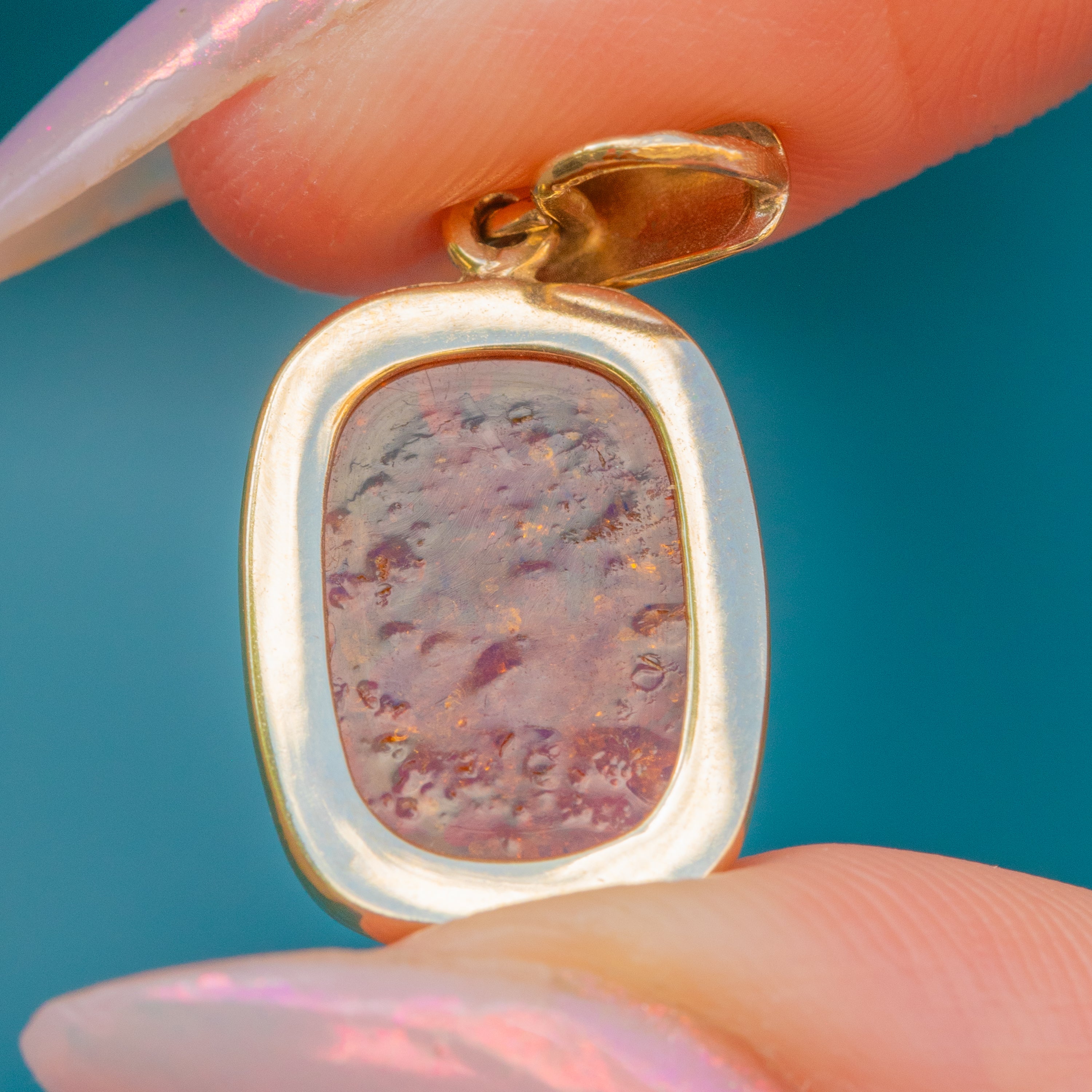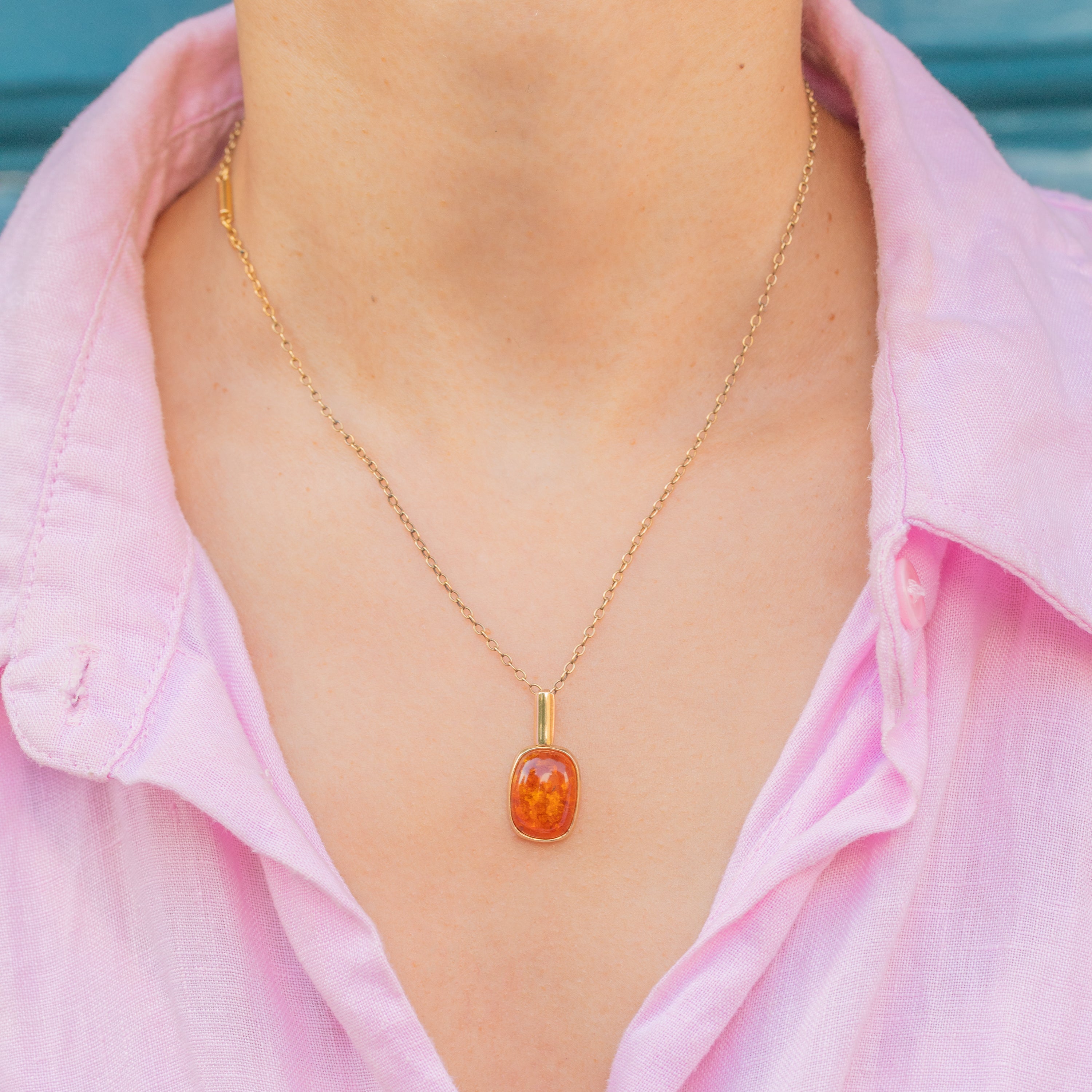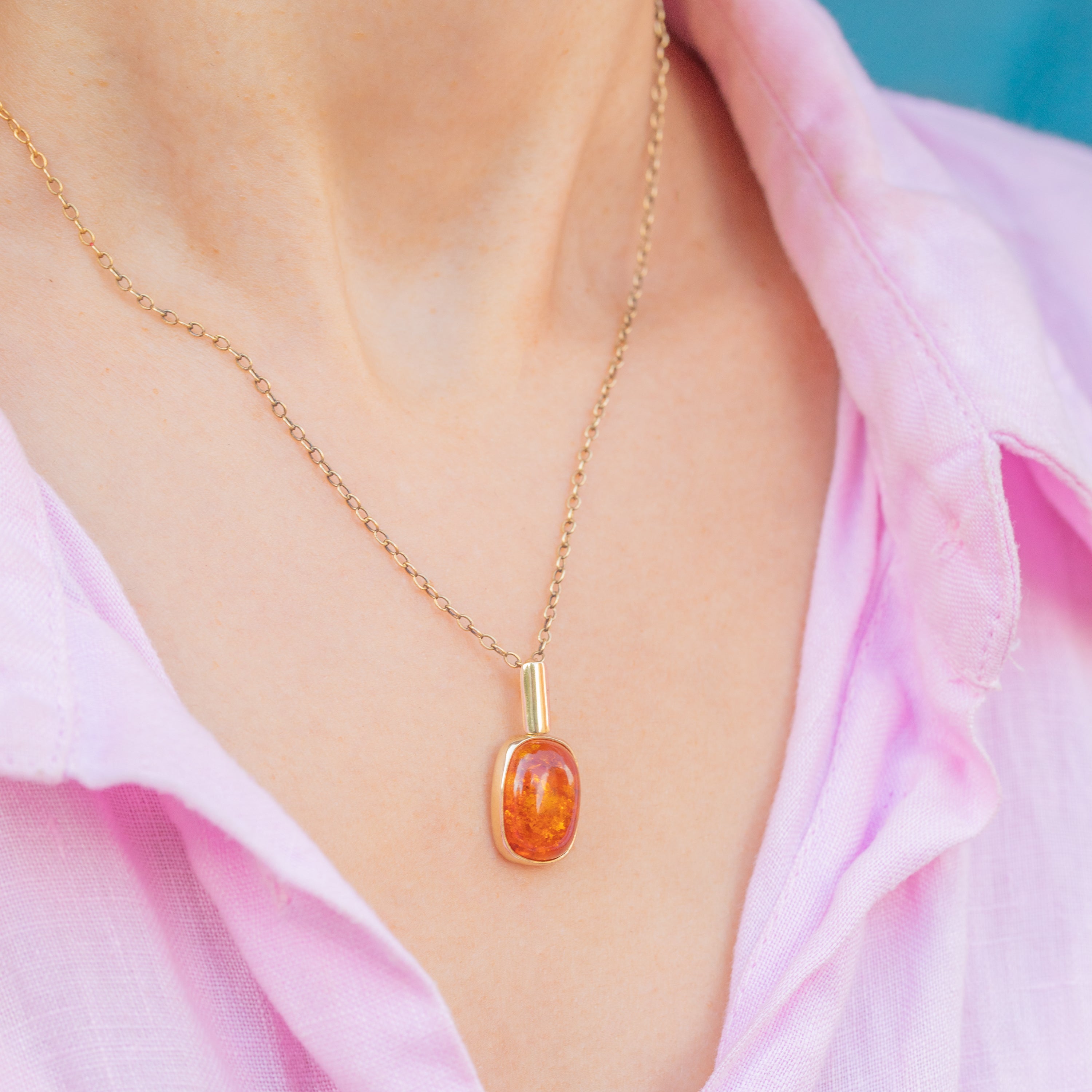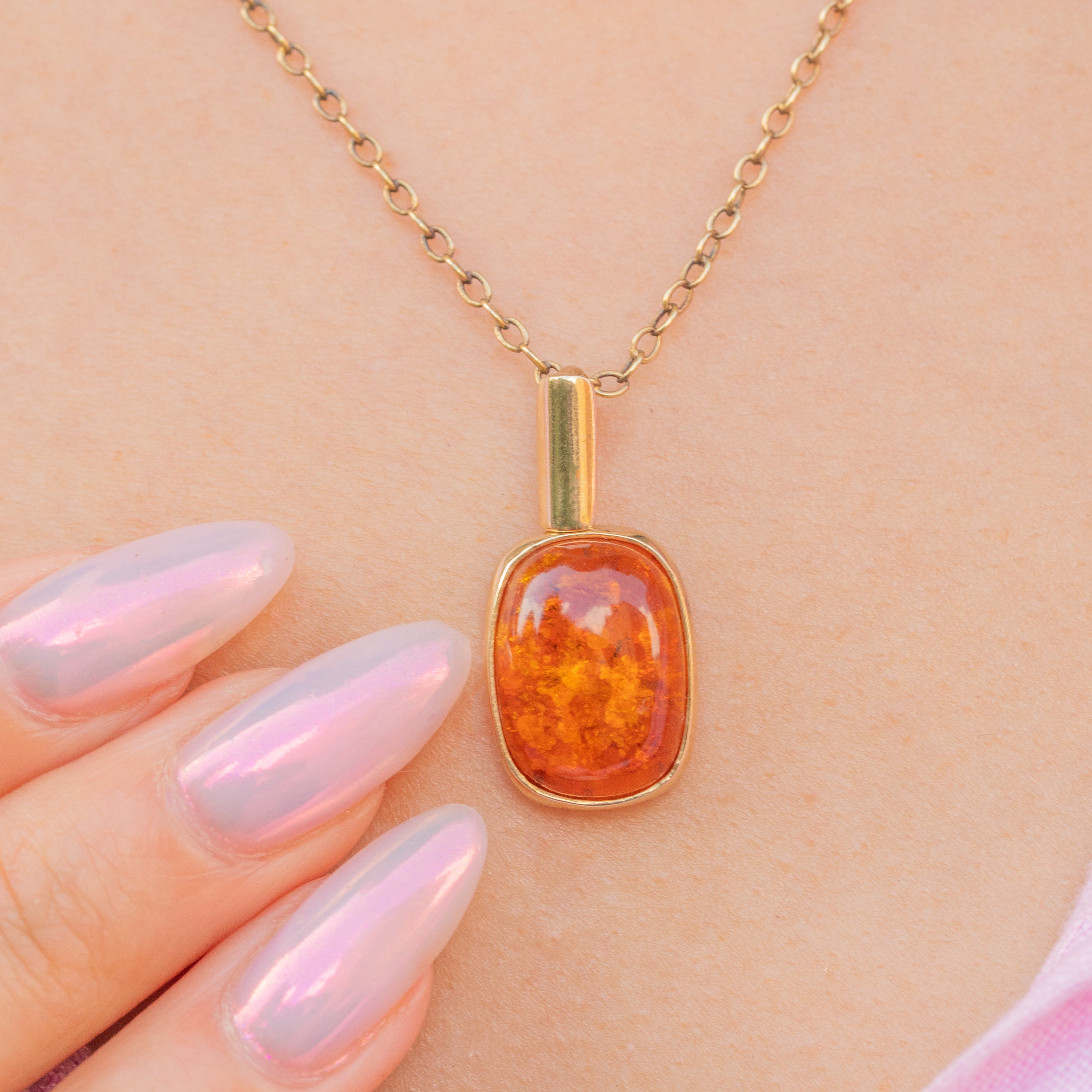 The Amber, revered for its speckled inclusions and calming properties, is hugged by a glossy 9ct Gold bezel and suspended from an elongated bale, making this vintage charm an elegant addition to your collection!