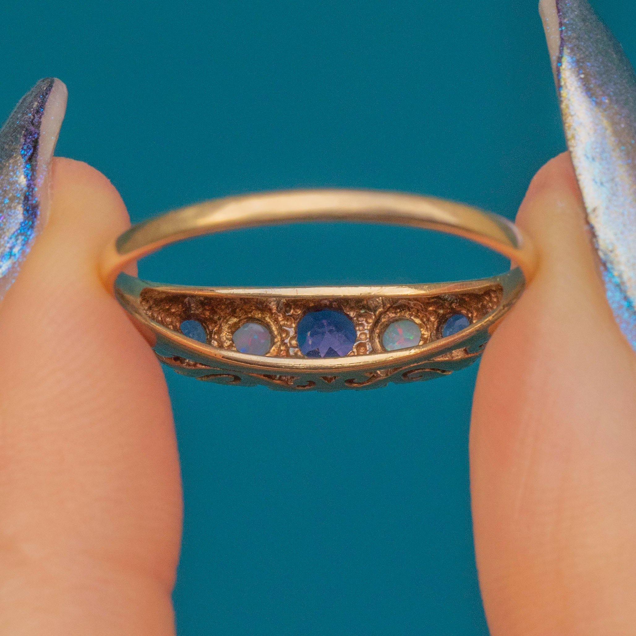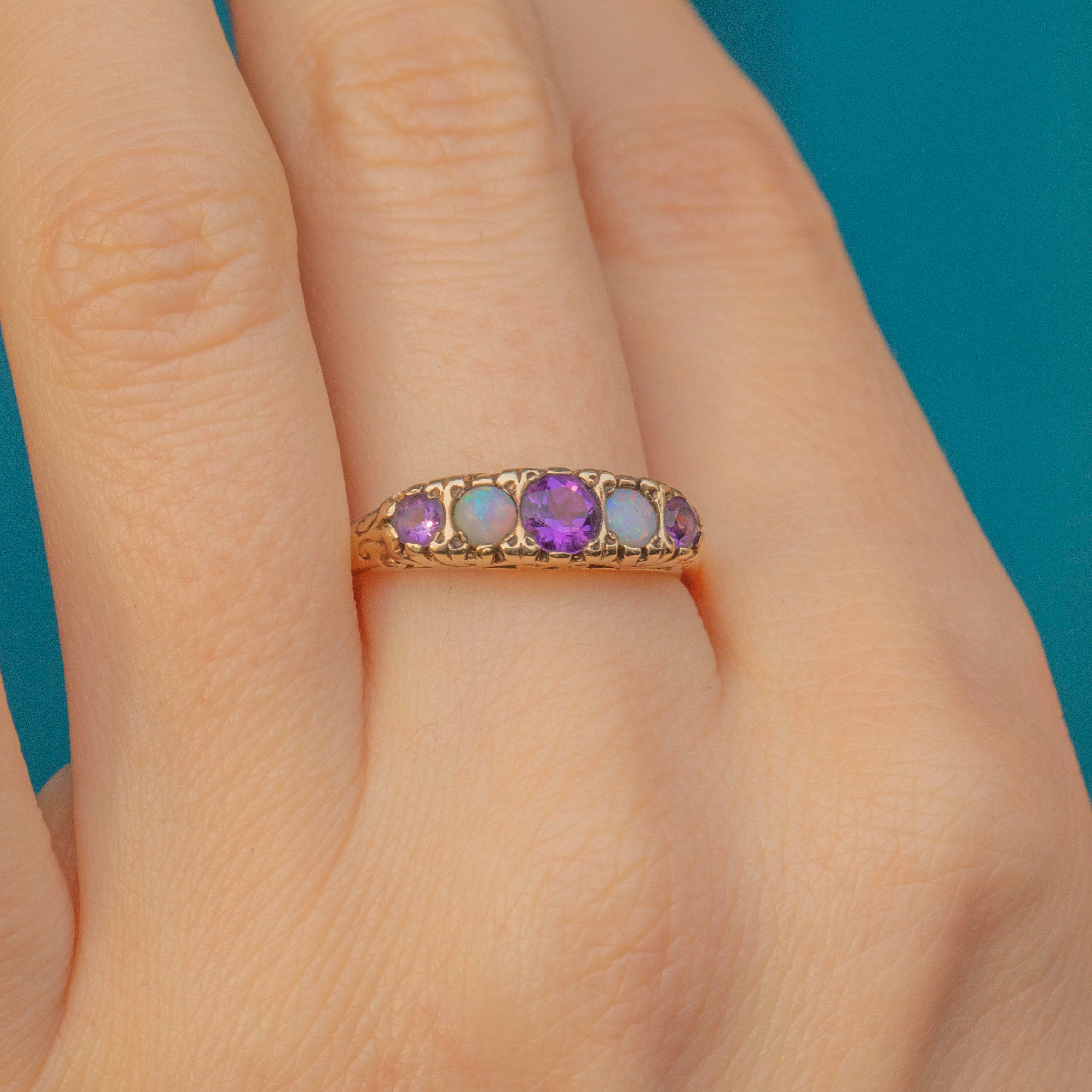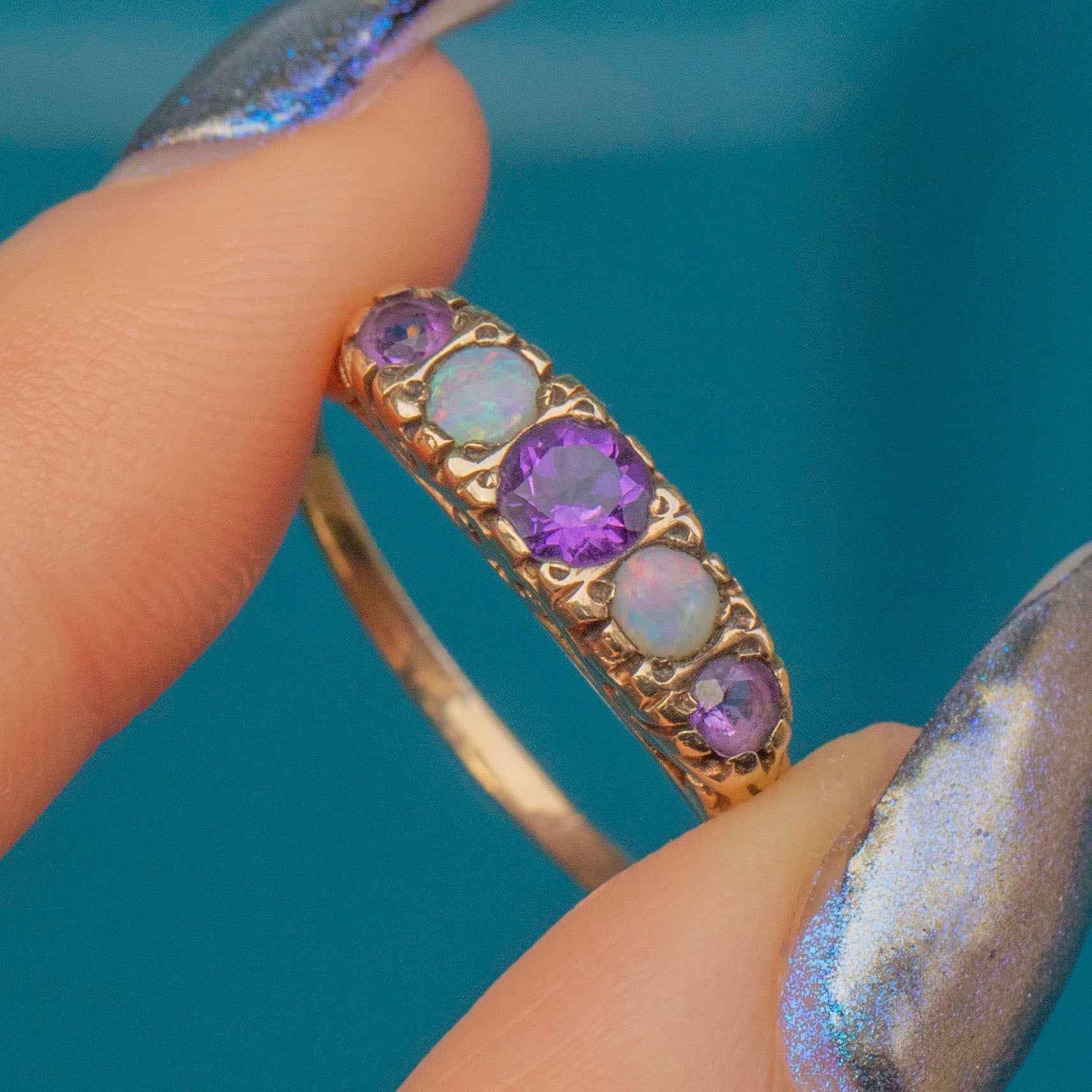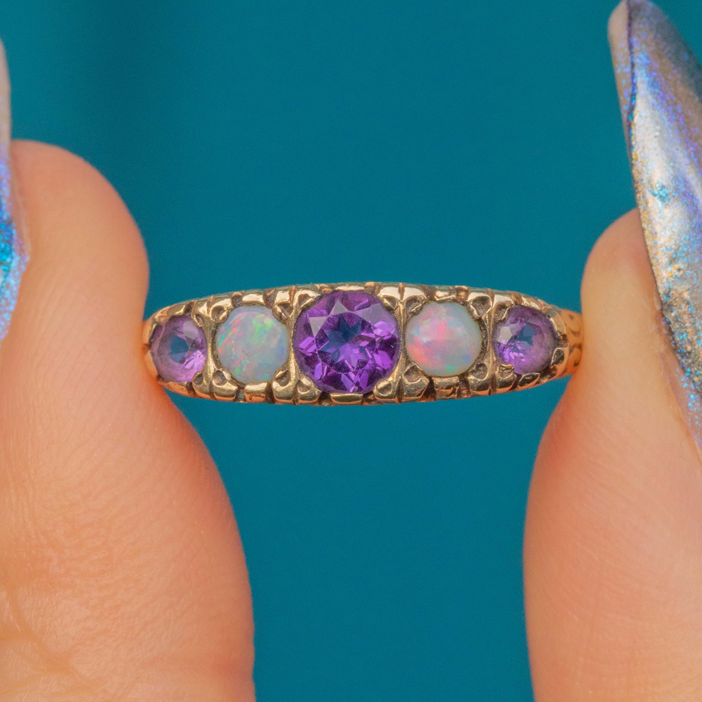This 9ct Gold Amethyst Opal five stone ring combines Victorian-inspired elegance with mid-century craftsmanship. She features three rich purple Amethysts and two glowing Opals set in an intricately detailed 9ct Gold band.
