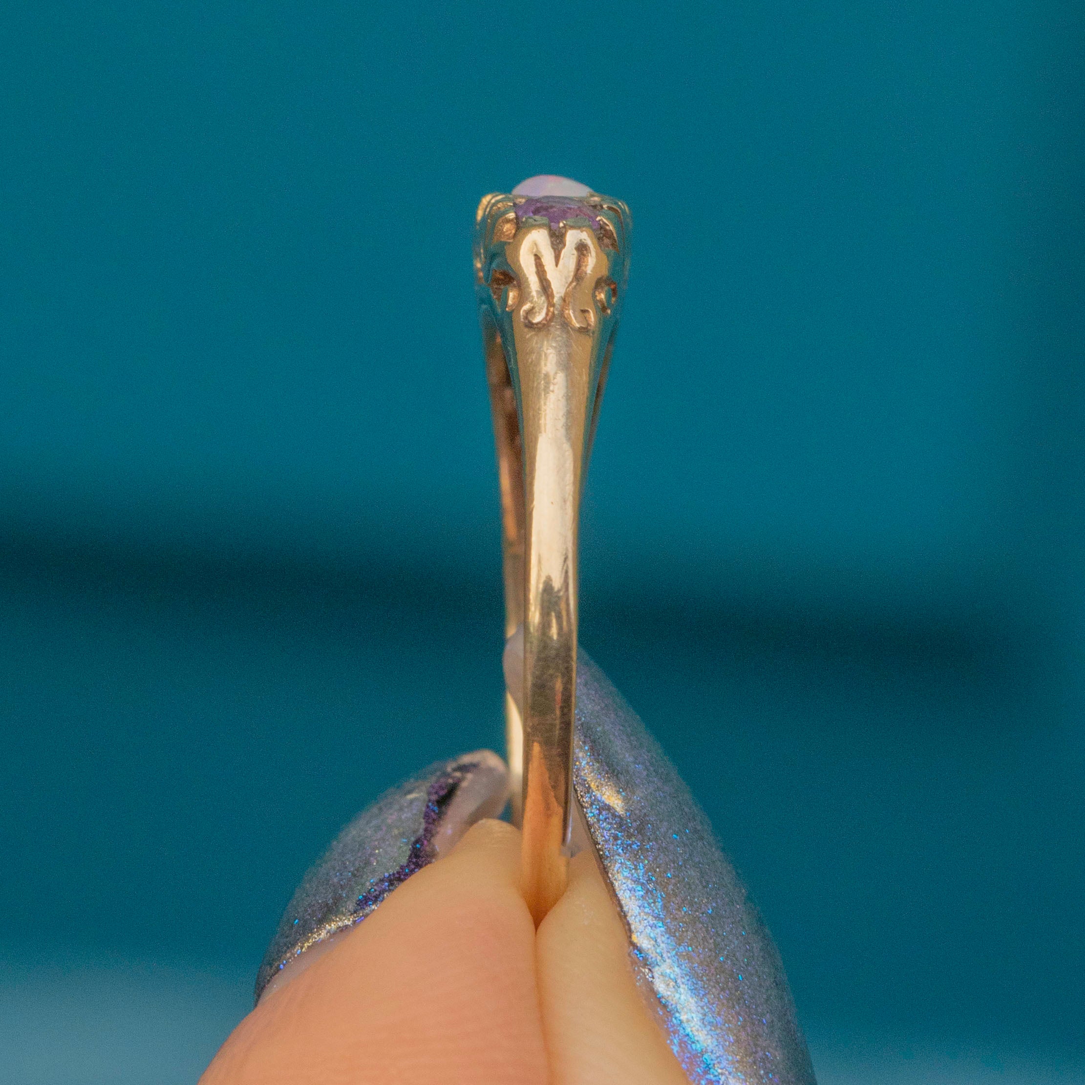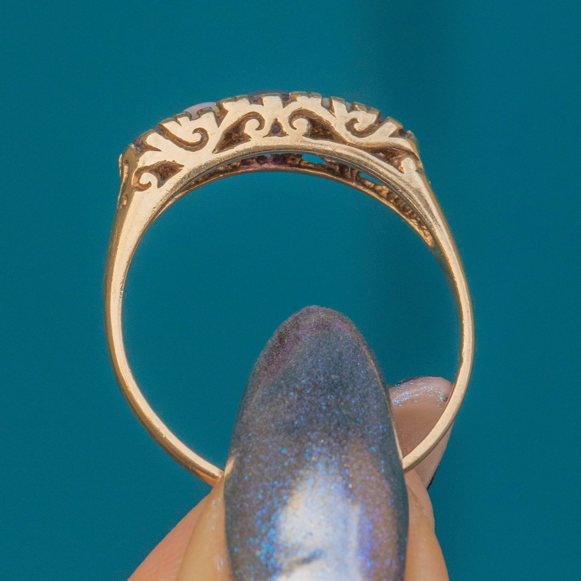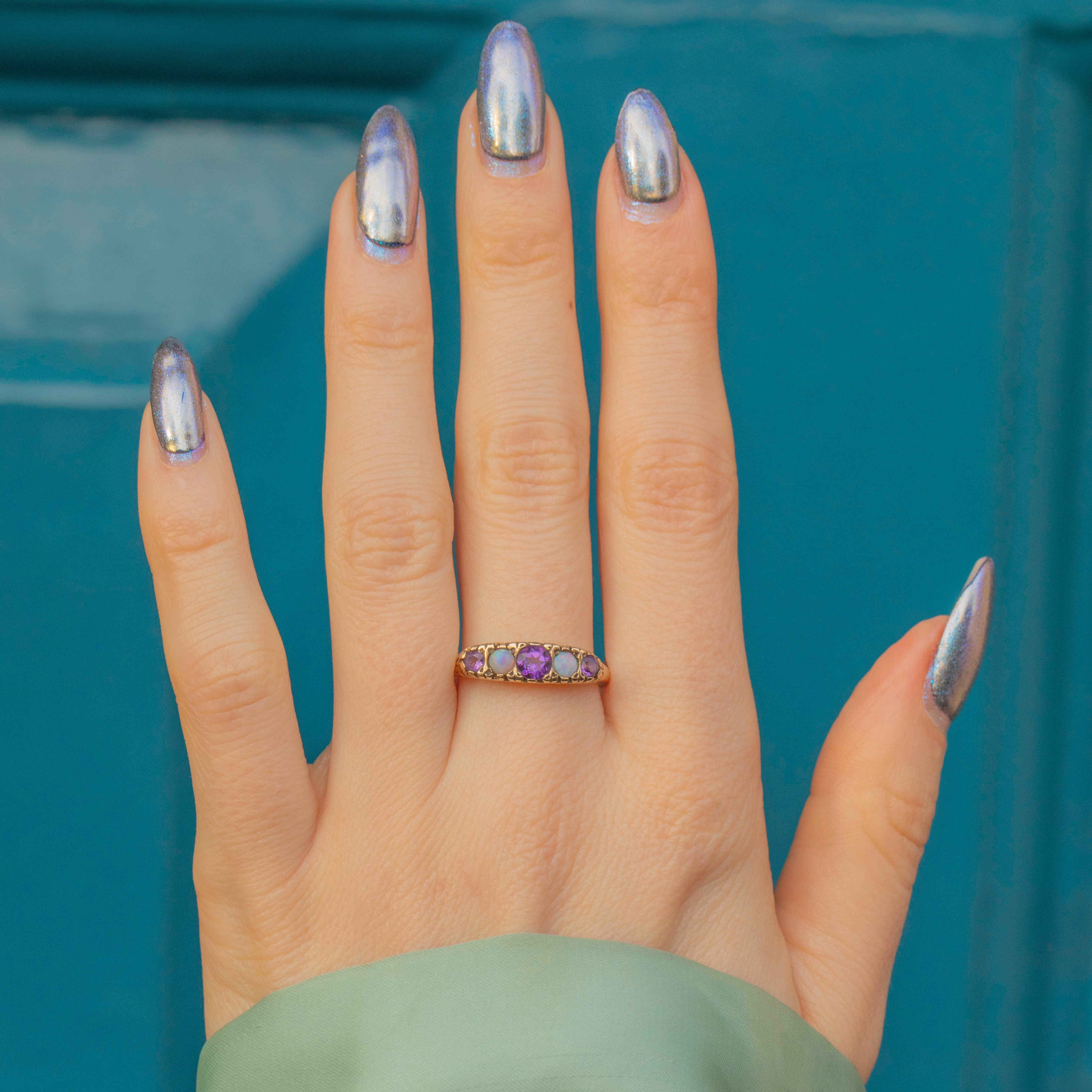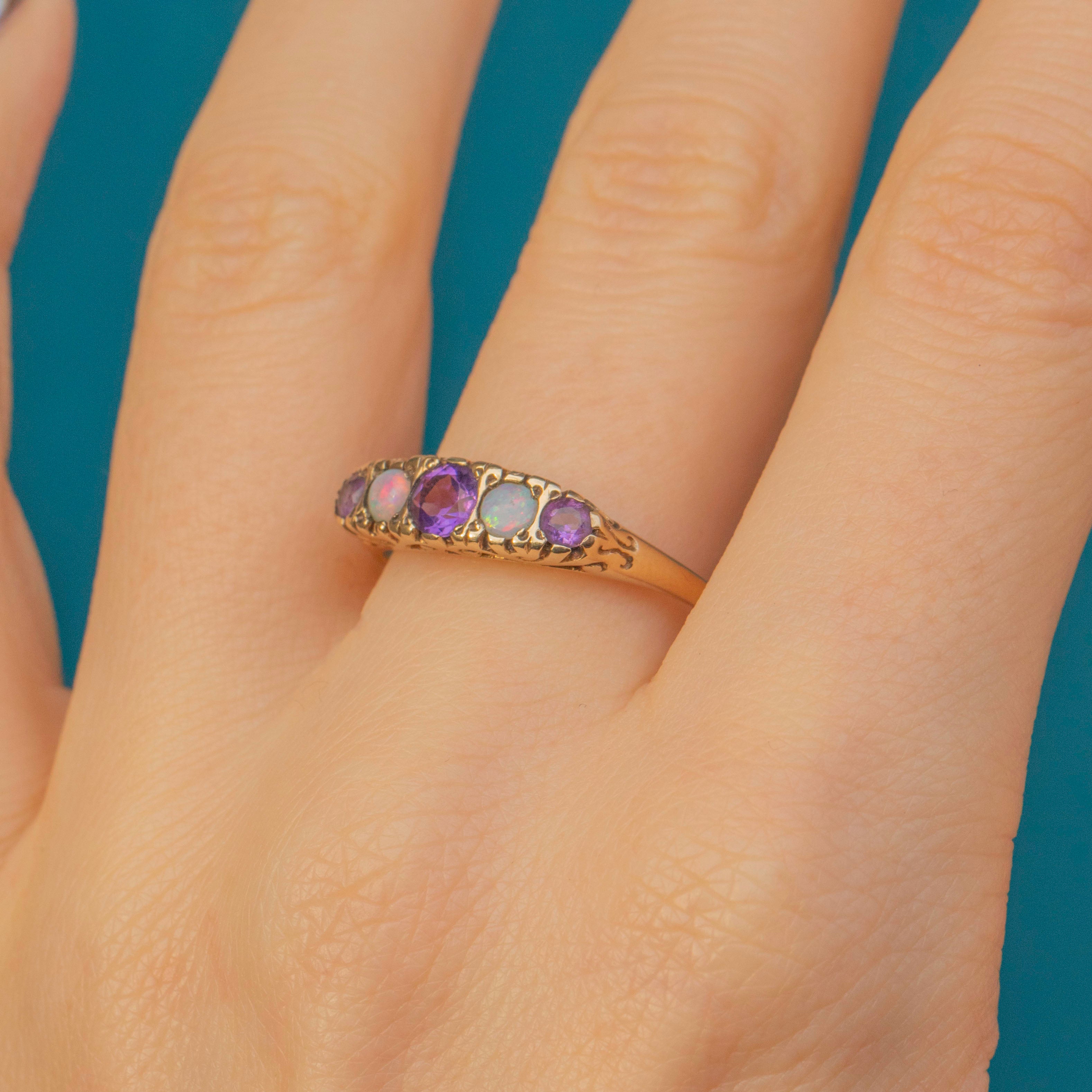 This 9ct Gold Amethyst Opal five stone ring combines Victorian-inspired elegance with mid-century craftsmanship. She features three rich purple Amethysts and two glowing Opals set in an intricately detailed 9ct Gold band.