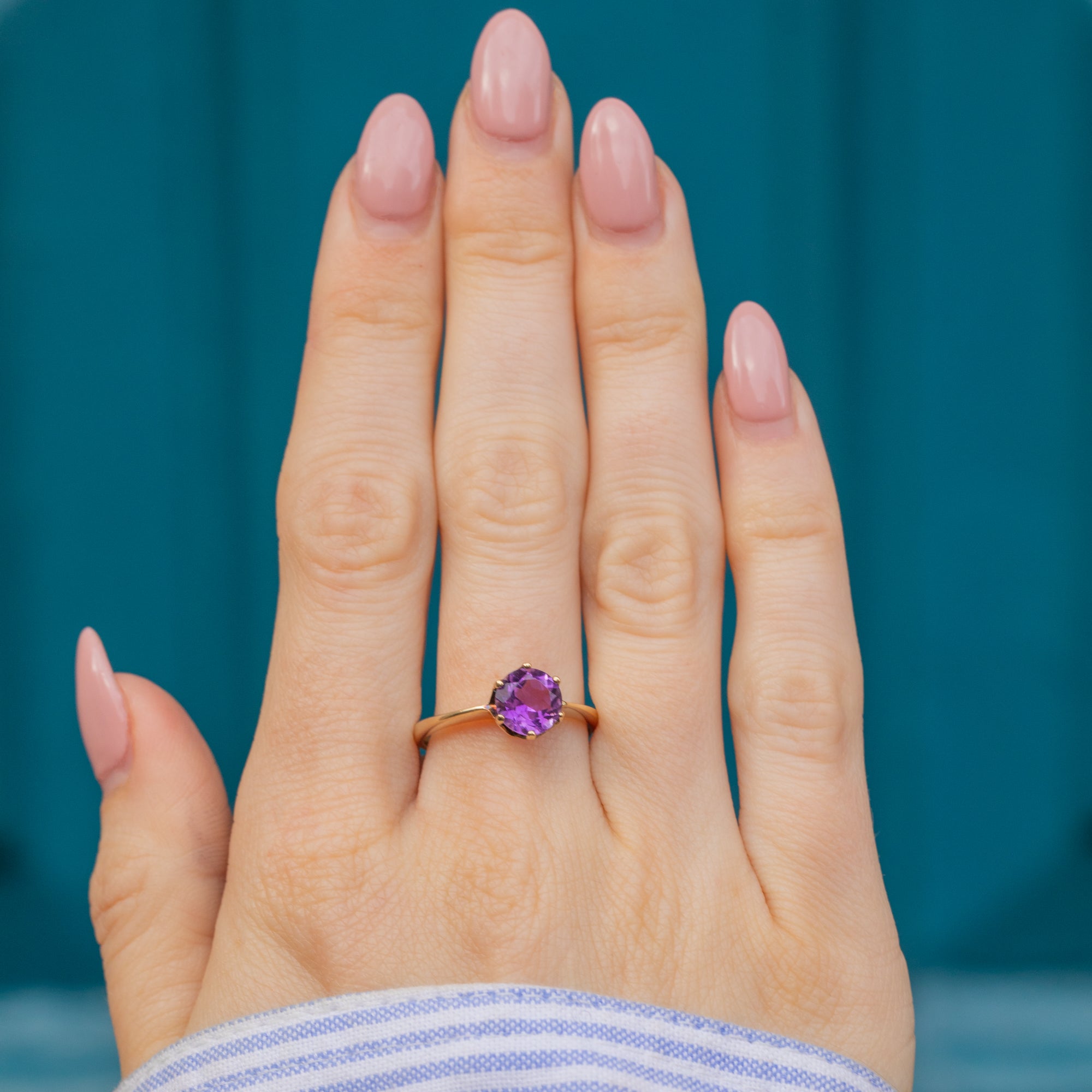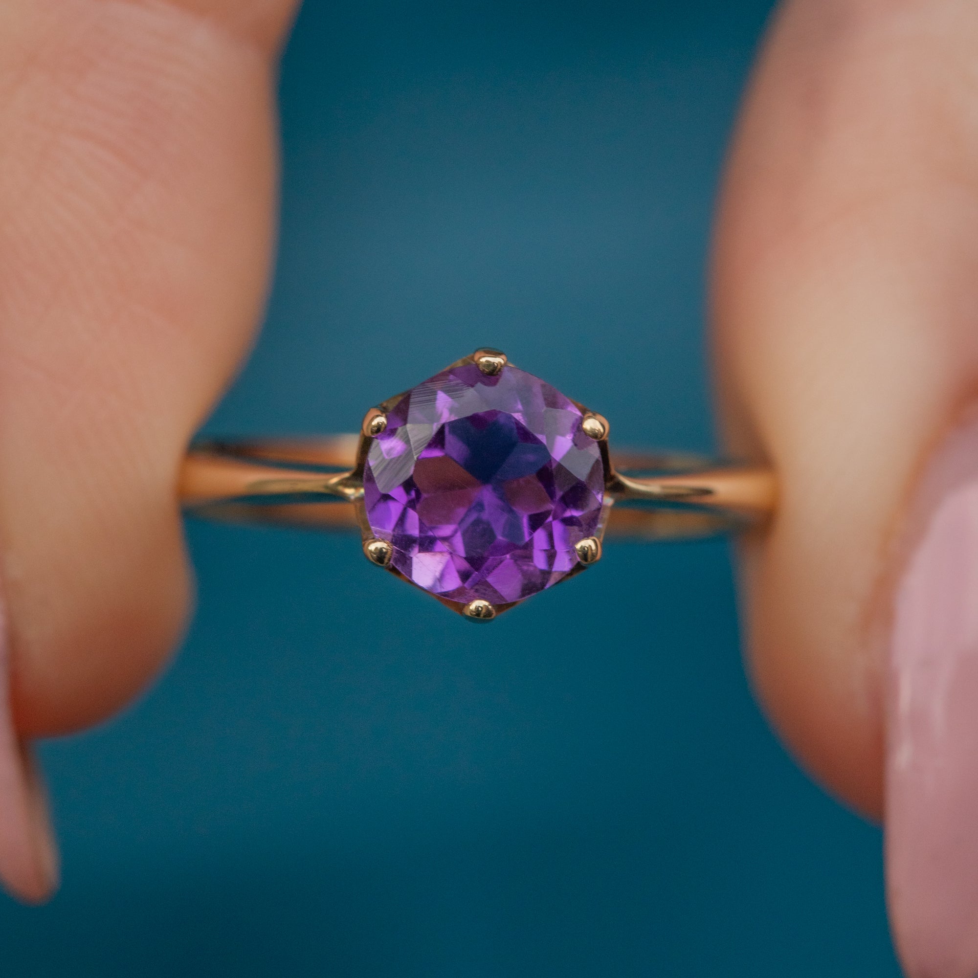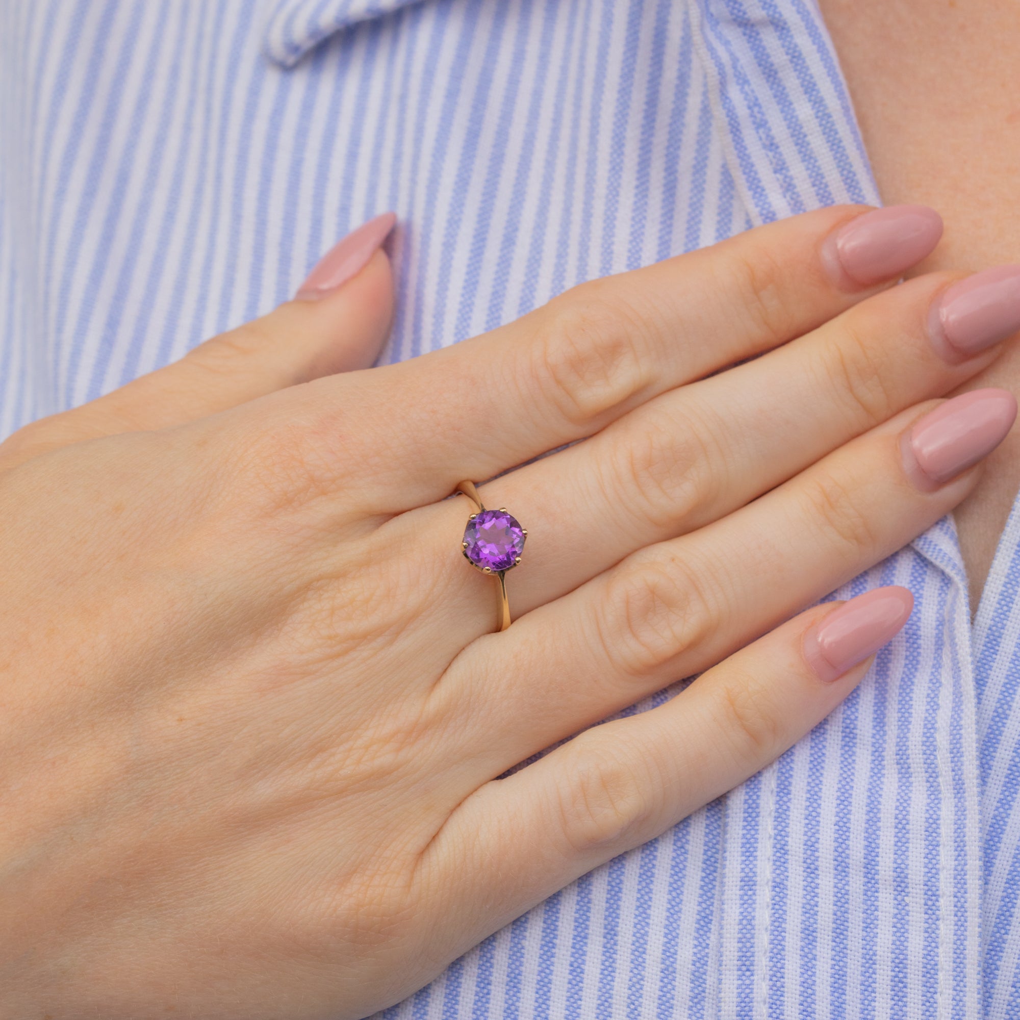 EXCELLENT. This 9ct Gold Amethyst solitaire ring is in excellent condition. The Amethyst has a crisp set of facets and is free from chips or abrasions. The 9ct Gold is buttery throughout and the shank has kept its elegant form well, and each claw is present holding the Amethyst securely in place.