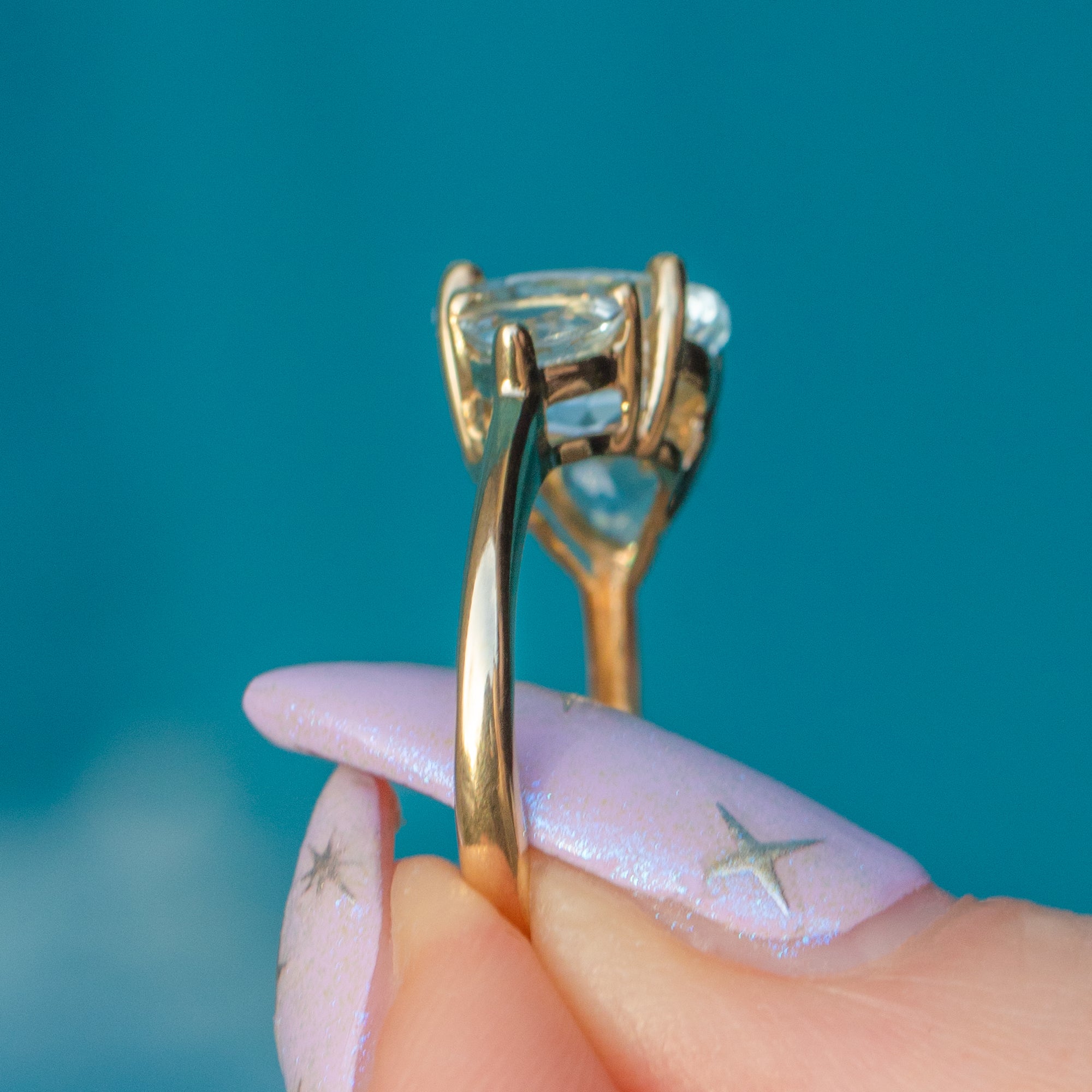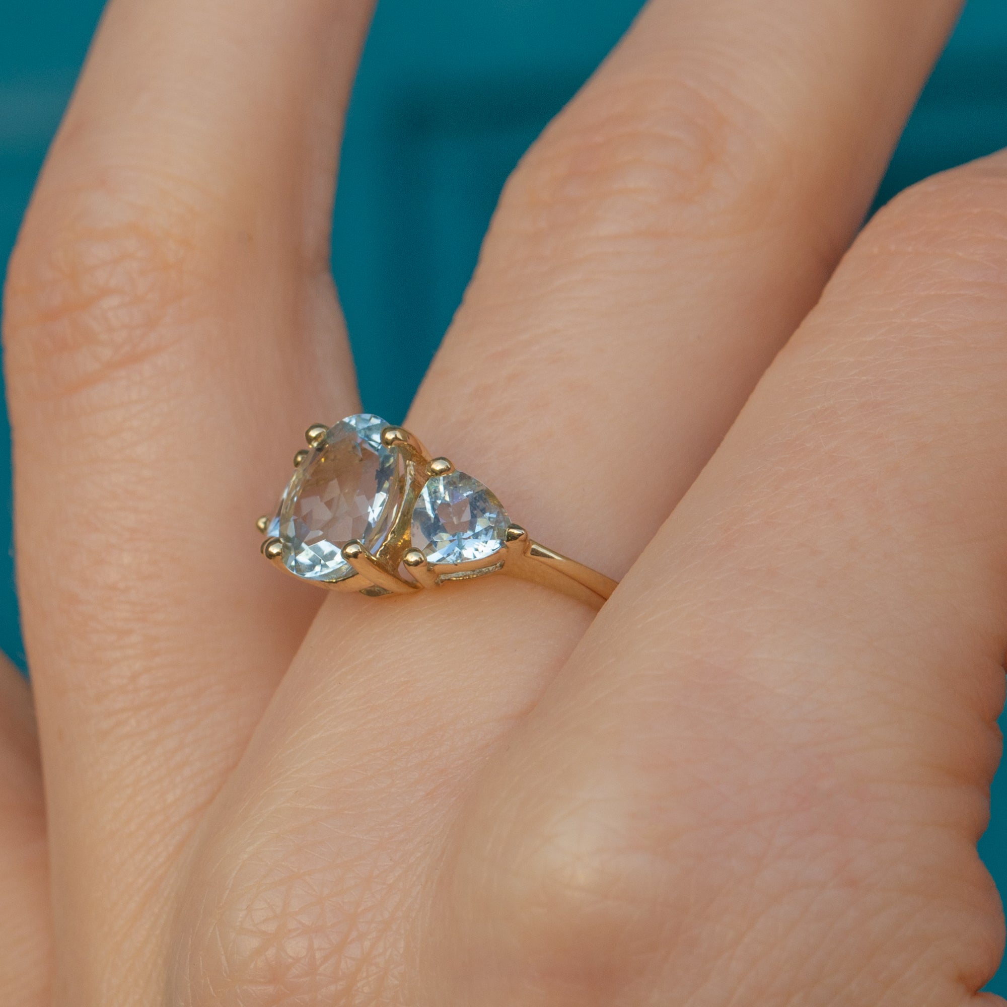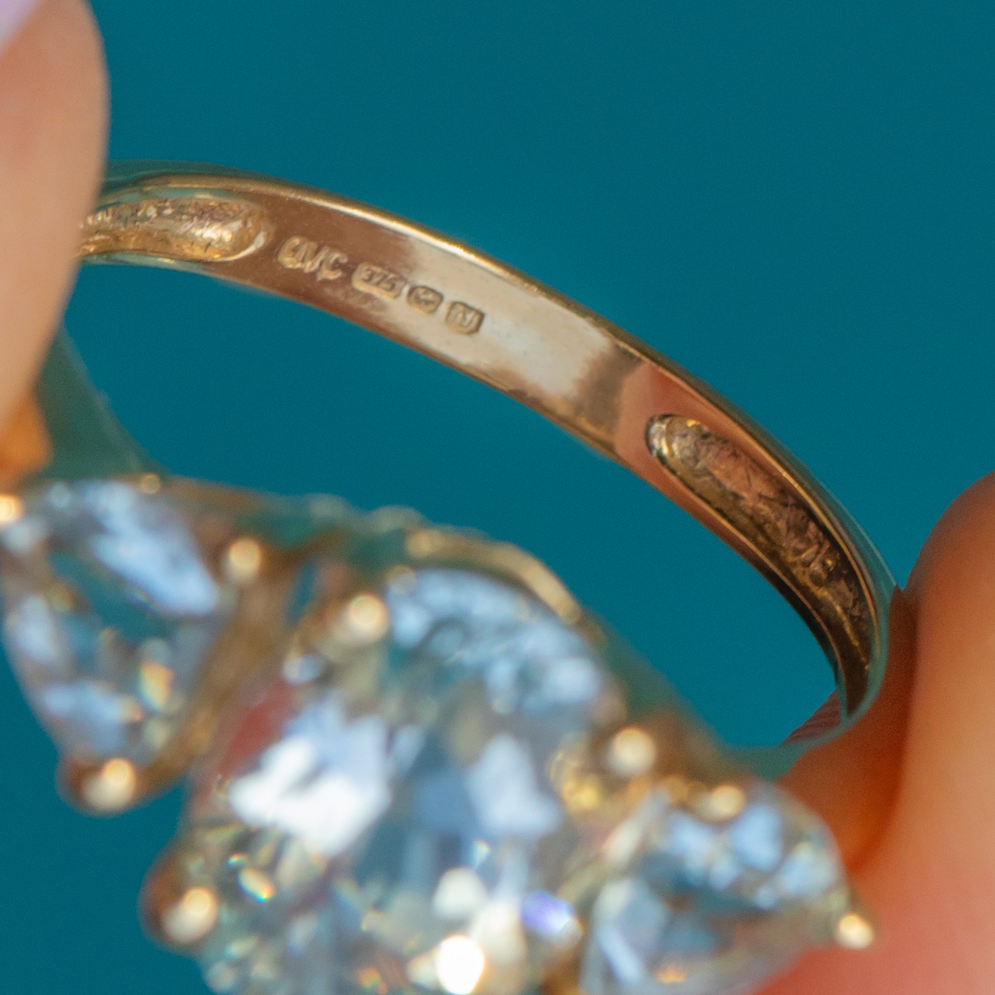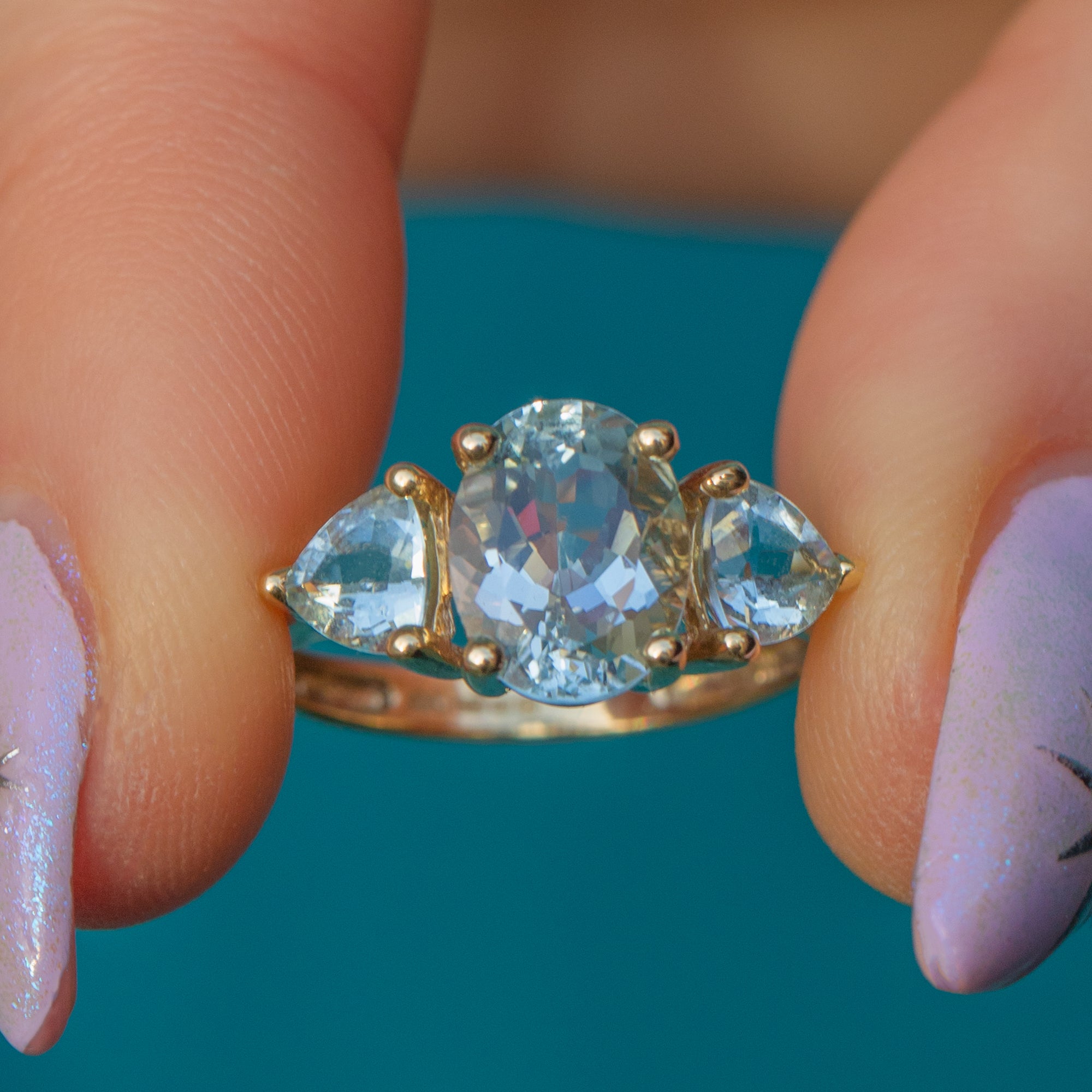 This 9ct Gold Aquamarine ring is a delight! Crafted from luscious 9ct Gold, she boasts three stunning Aquamarines, weighing a total of 2.00 carats, each one faceted wonderfully with striking icy blue hues, like dainty frozen droplets.