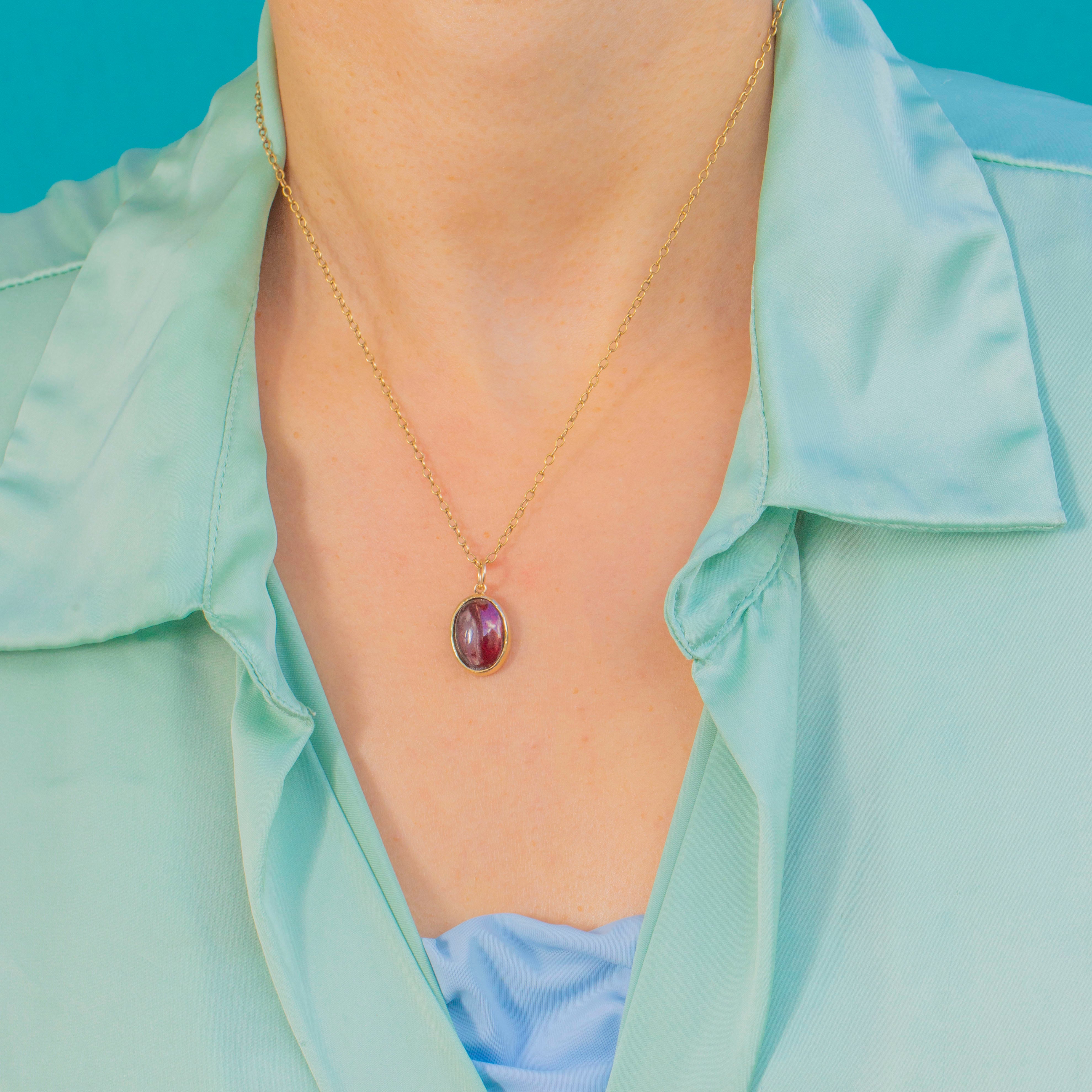 A beautiful Vintage 9ct Gold pendant set with a glowing deep-red Garnet cabochon in a smooth, high-polished bezel setting. The cabochon displays rich wine tones with a soft, natural translucency that catches the light beautifully from every angle.