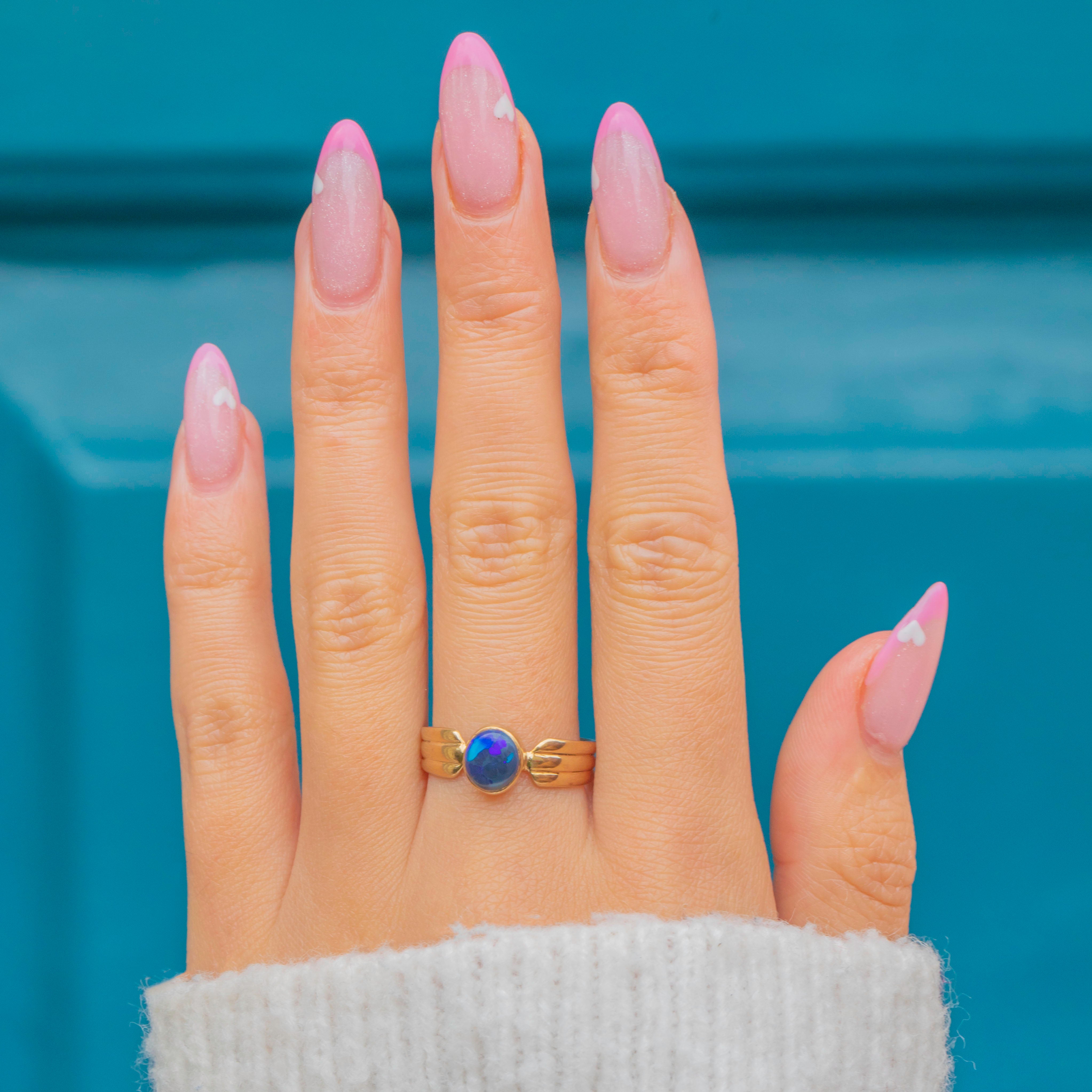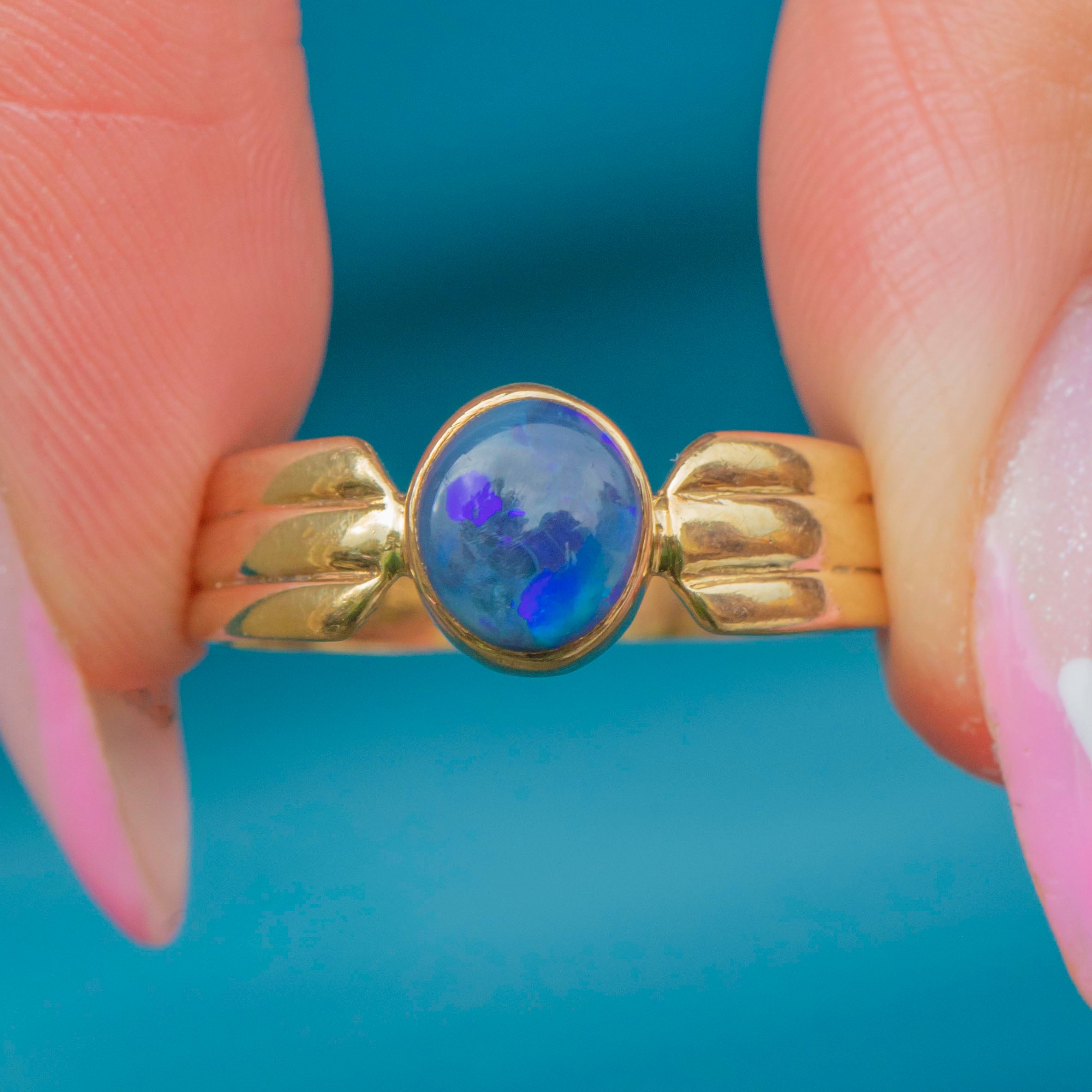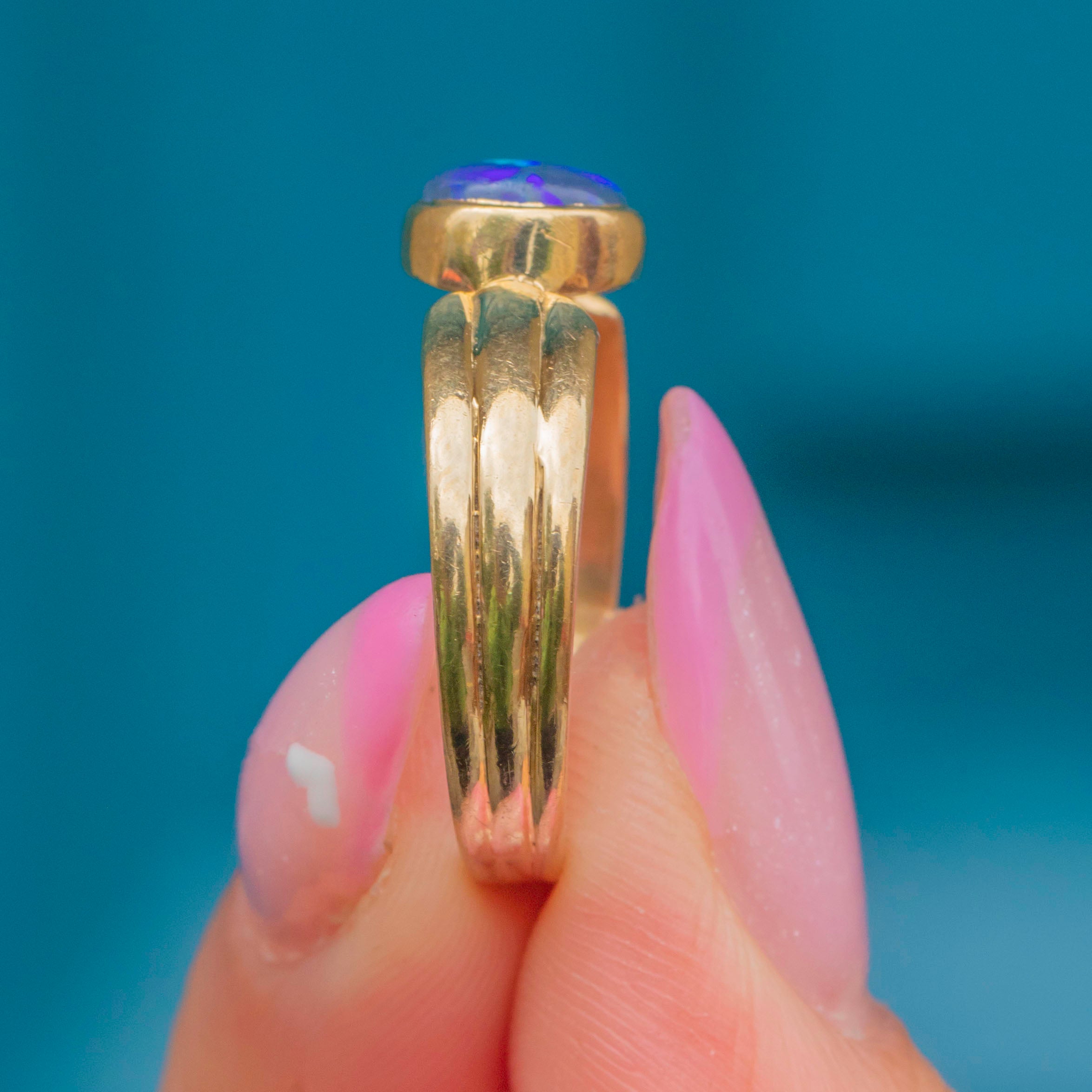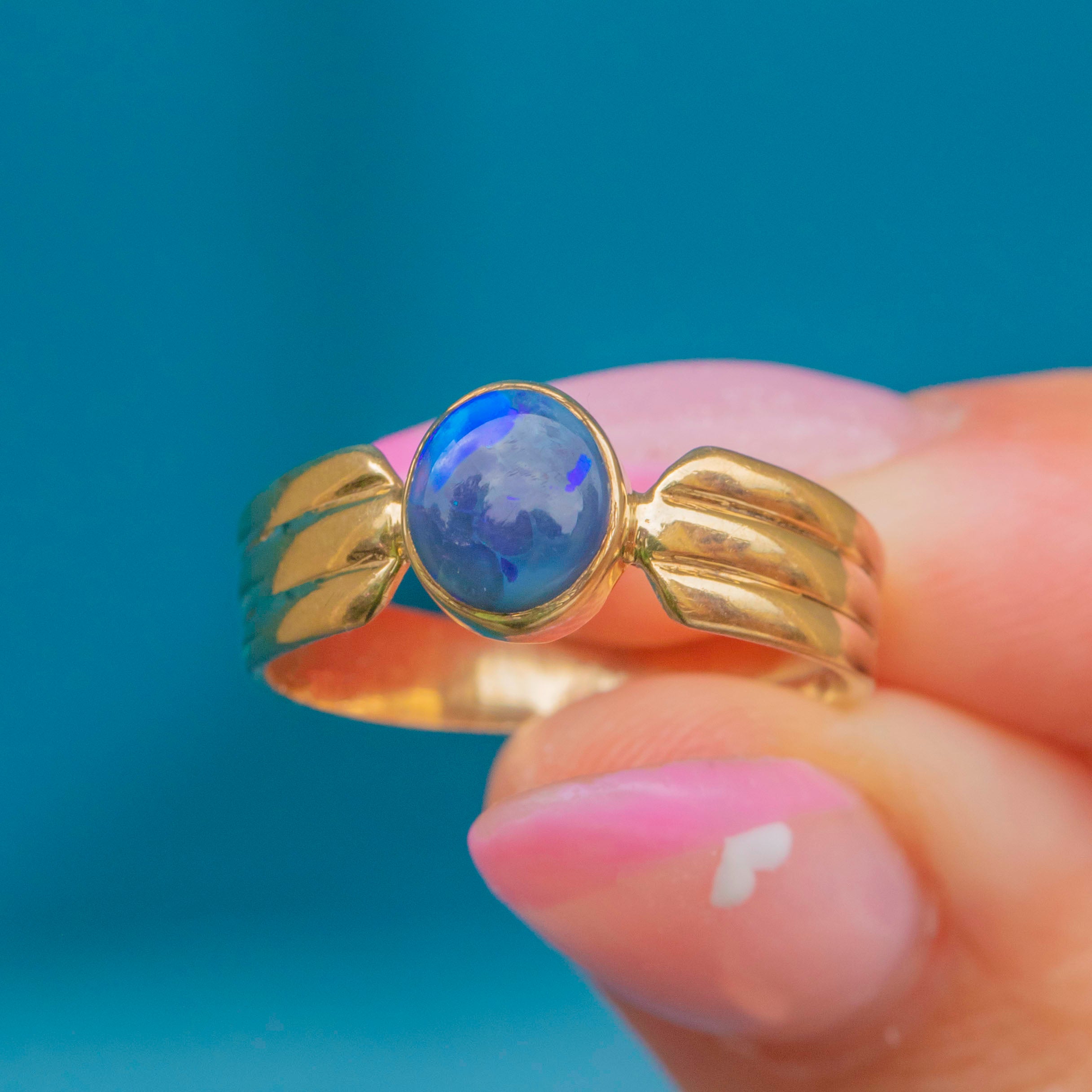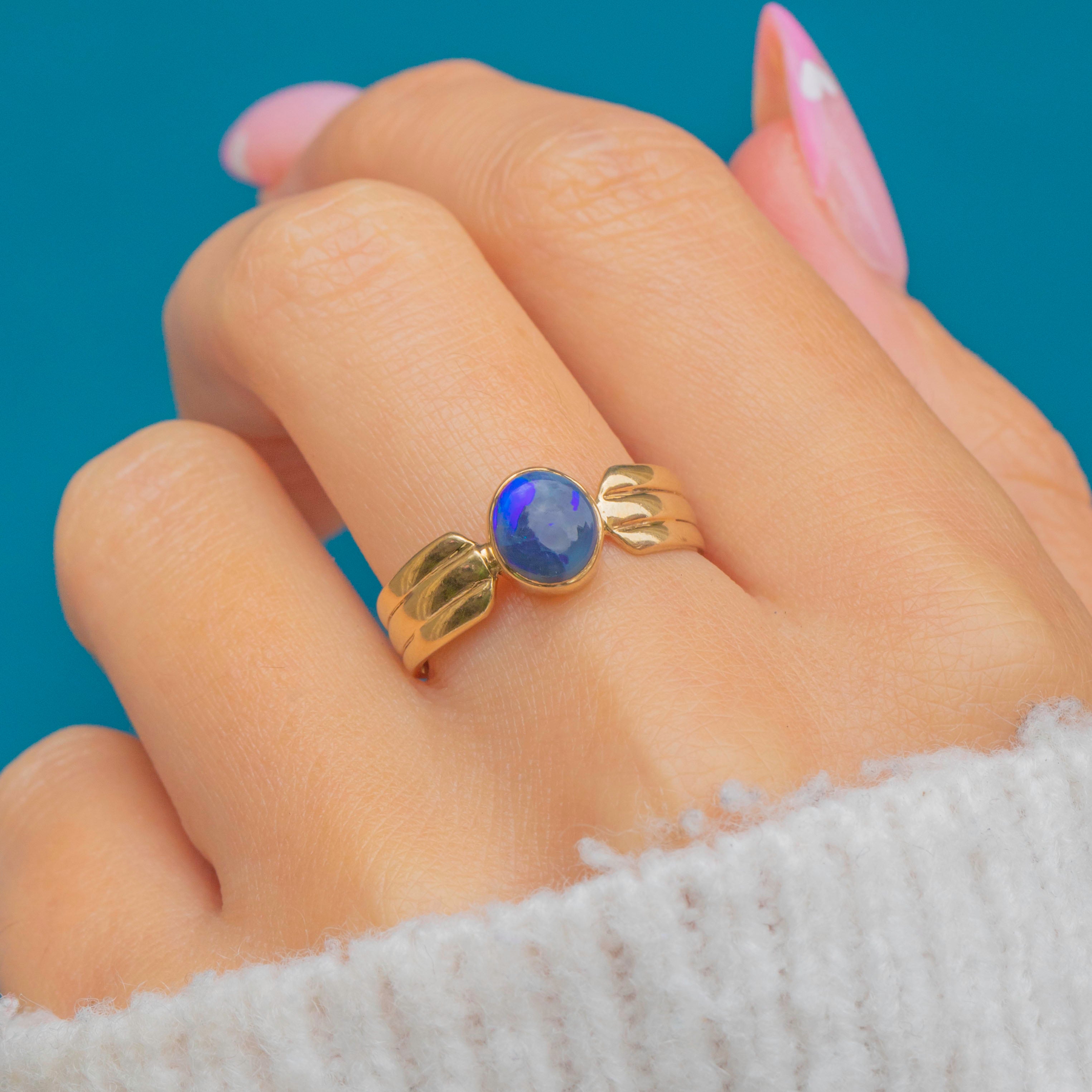 A sleek late-20th-century 9ct Gold ring set with a dark and vivid rare Black Opal. Not to be confused with a doublet or triplet, solid Black Opals are precious natural gemstones that are highly sought-after!