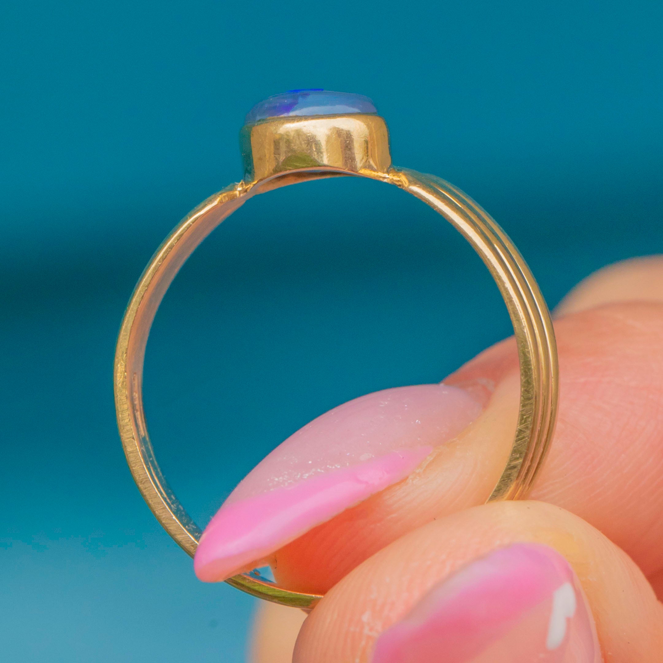 VERY GOOD: The Opal is bright with attractive play-of-colour and is securely set. The Gold shows light surface wear consistent with age, and a visible resize line to the rear of the band, but otherwise it's in excellent and ready to wear condition.