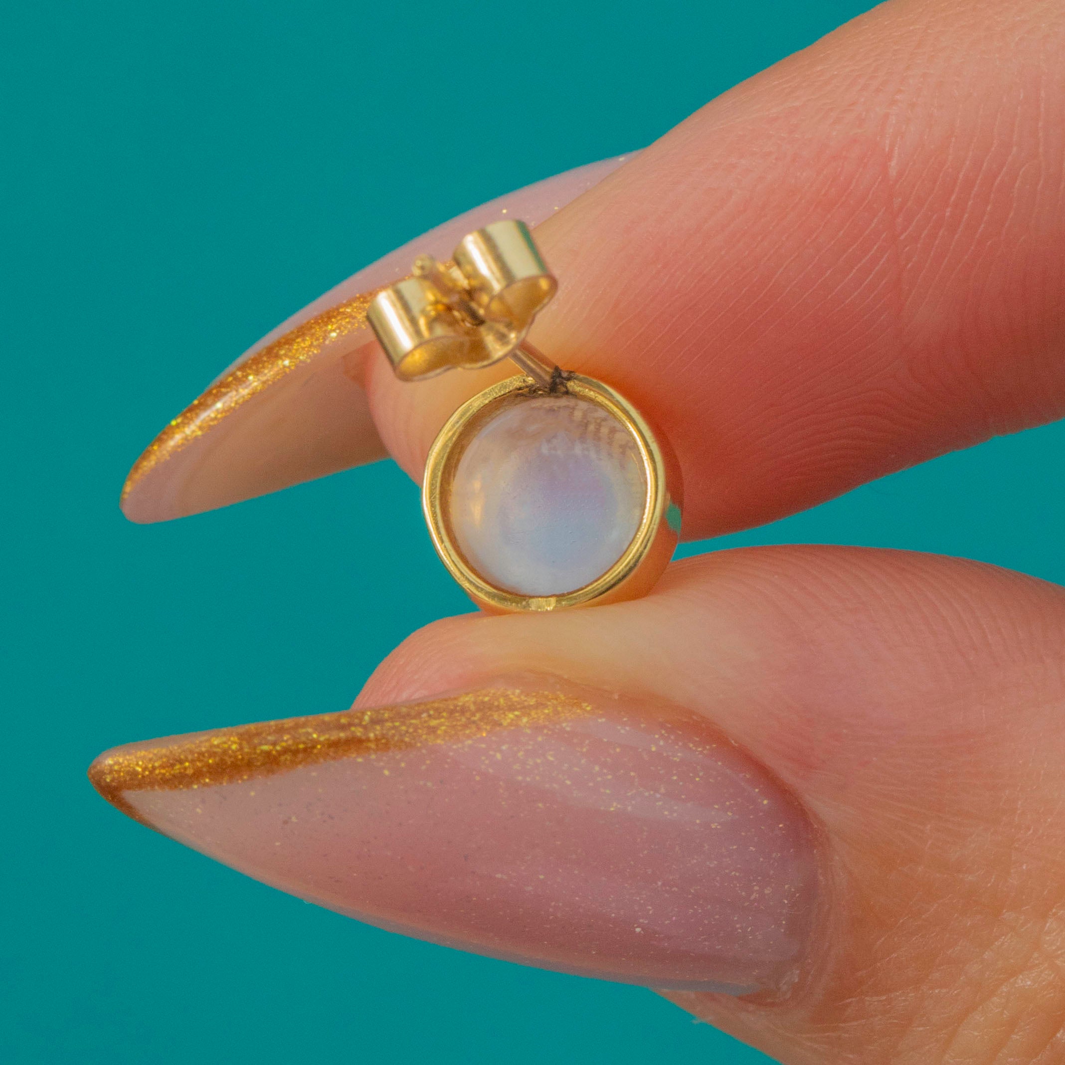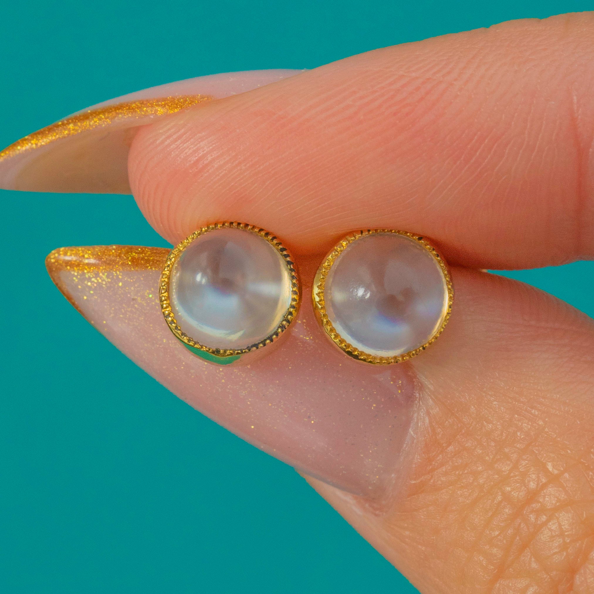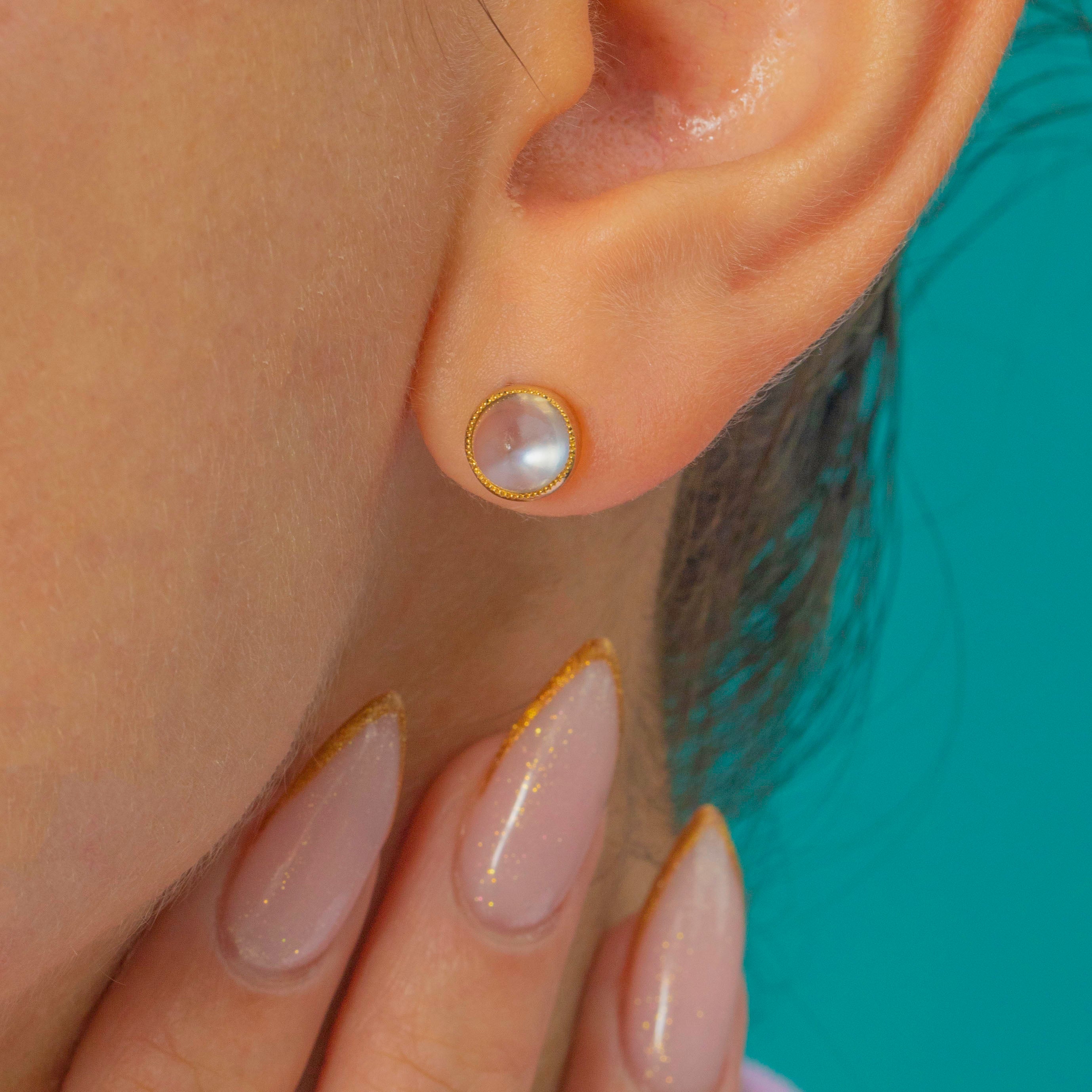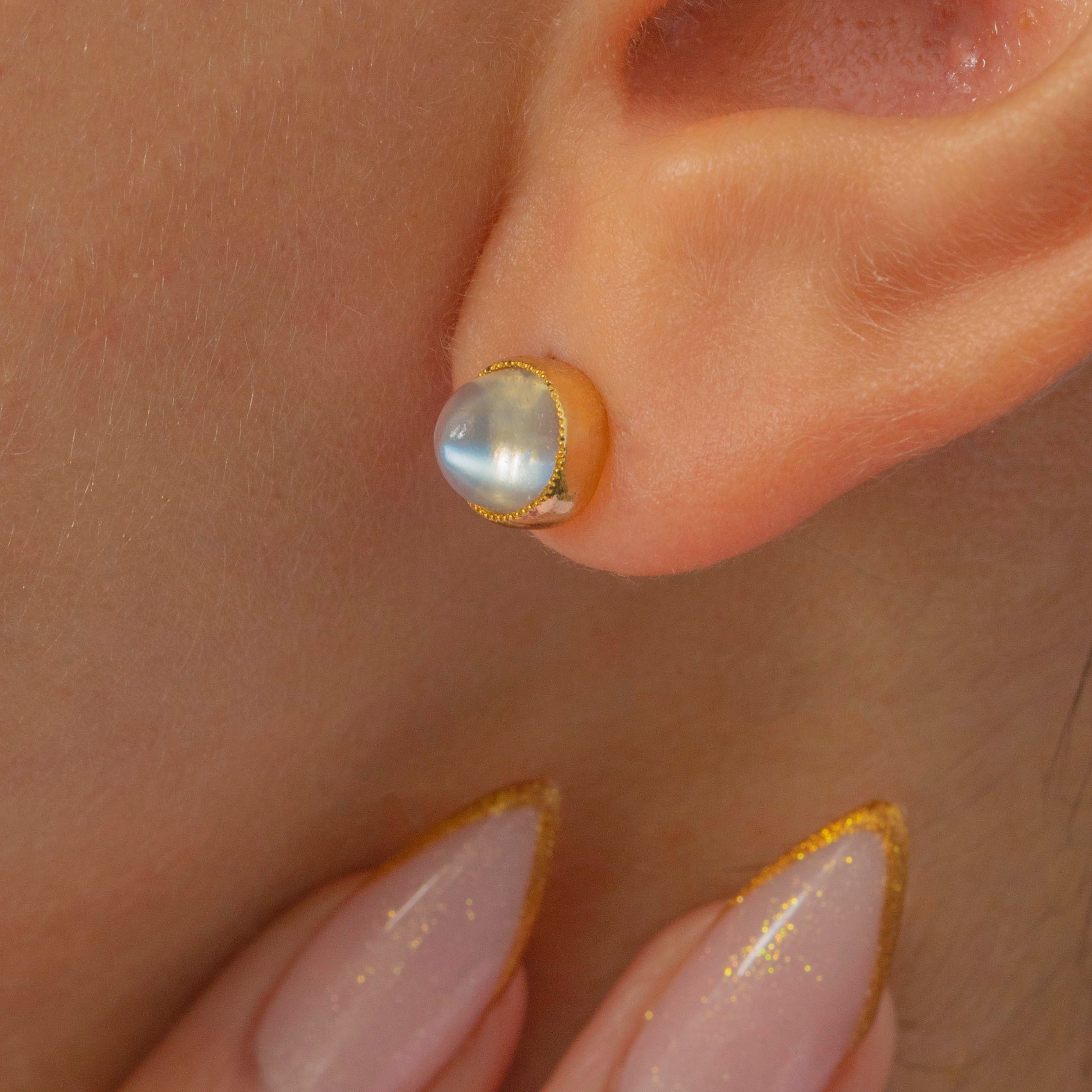 Moonstones are 6mm in diameter x 5mm deep, weighing approx. 2.20ct combined.