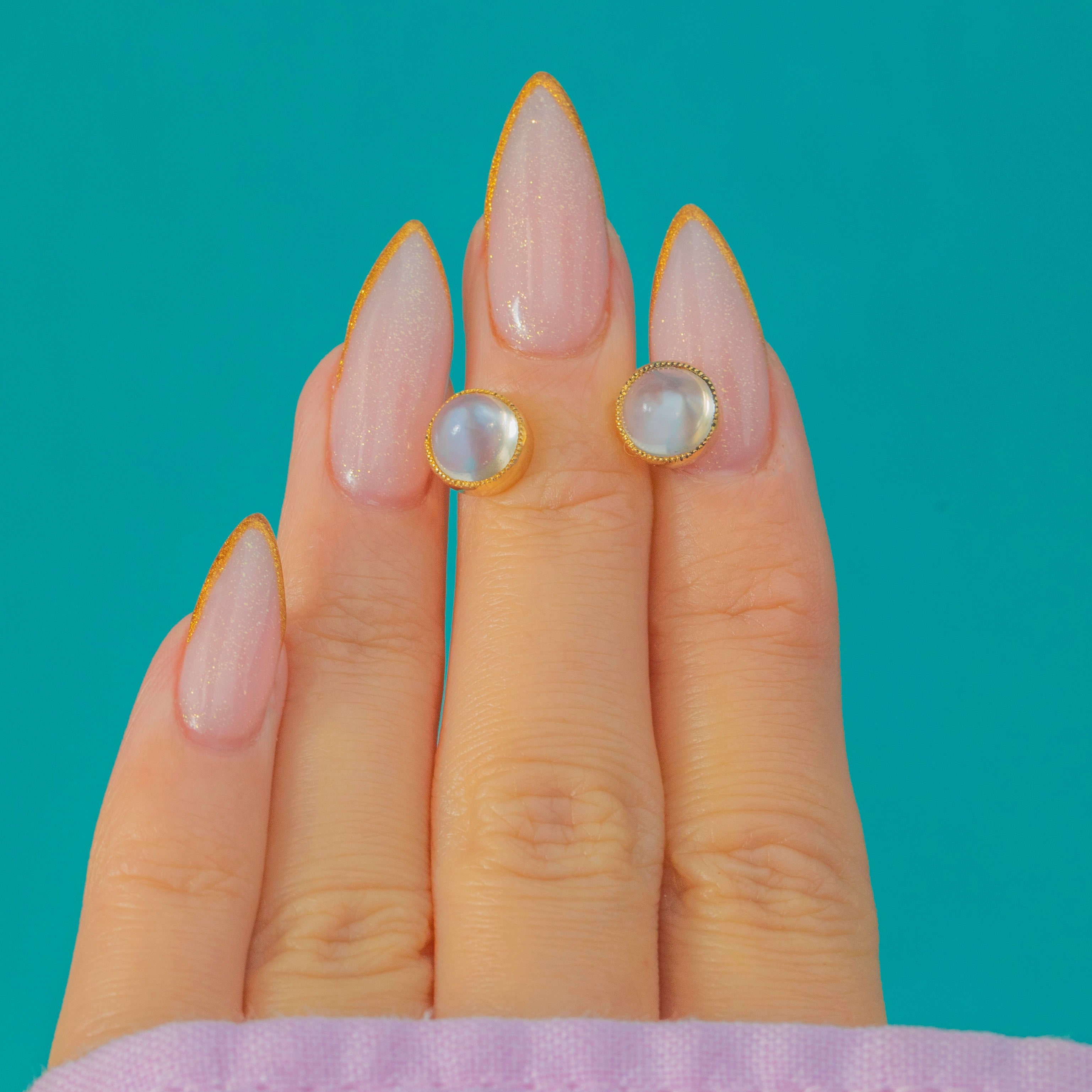 Dreamy Vintage Moonstone studs crafted in solid 9ct Gold. Each earring is set with a rounded cabochon Moonstone that glows with soft, ethereal adularescence, flashing cool blues and silvery light as they move. Together, the Moonstones total approximately 2.20cts, giving a lovely presence while still feeling effortless for everyday wear.