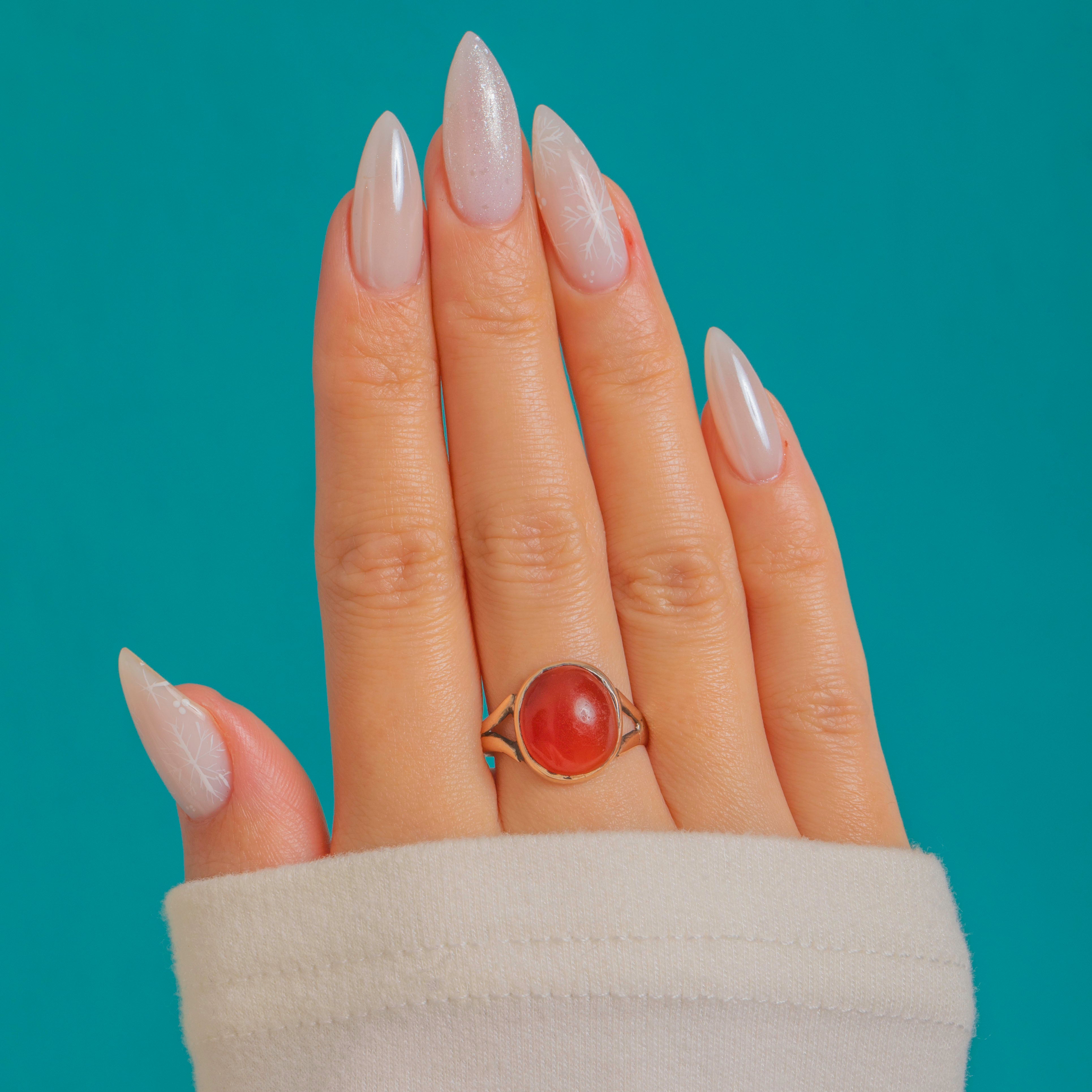 A timeless Victorian ring in warm 9ct Gold, set with a glowing oval Carnelian cabochon. The gem’s rich red-orange translucence is showcased in a smooth rub-over bezel with an open back to invite the light, lending an elegant, even glow across the dome.