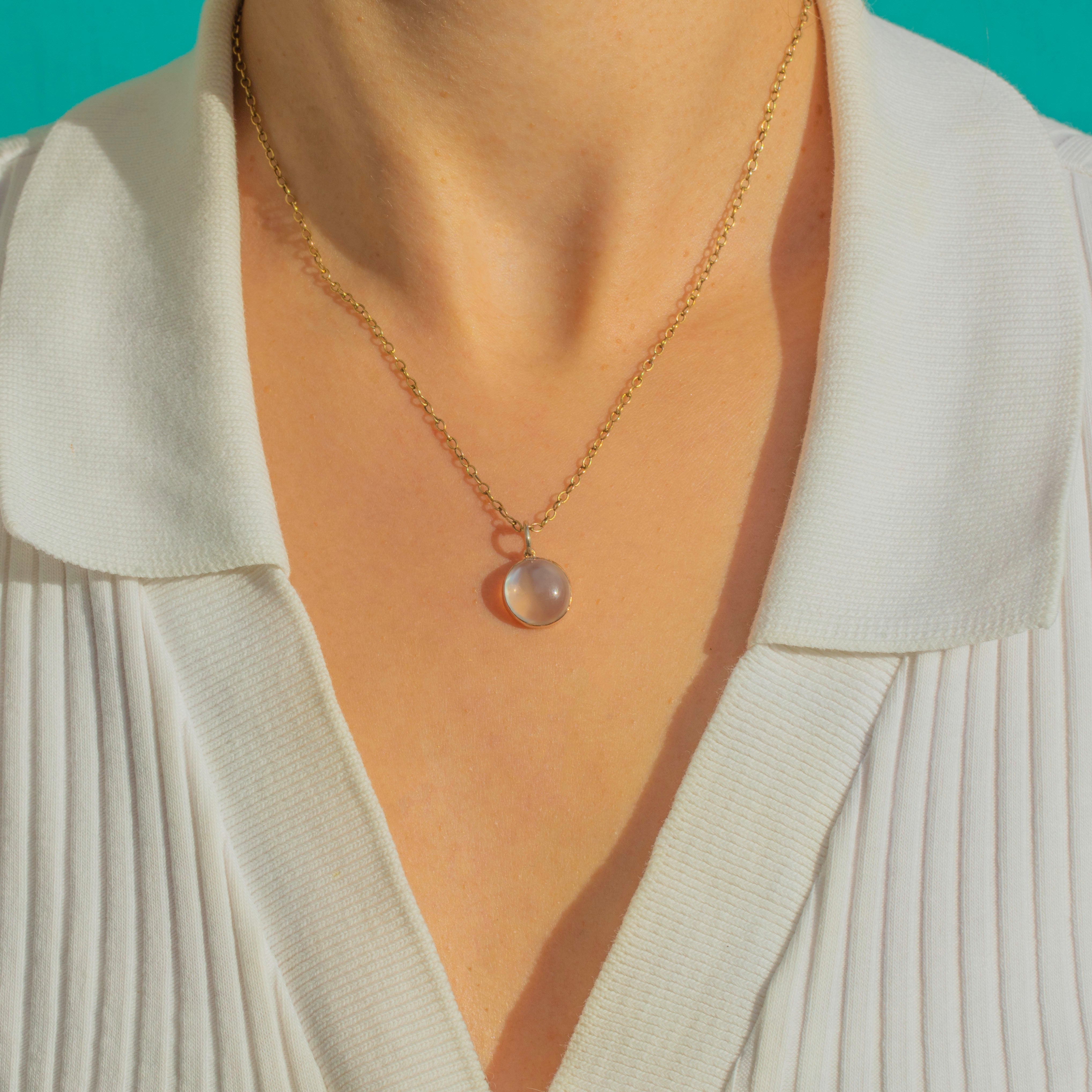 The 5.00ct Moonstone glows with a silvery-blue adularescence and a distinct cat’s eye effect that shimmers as it moves.