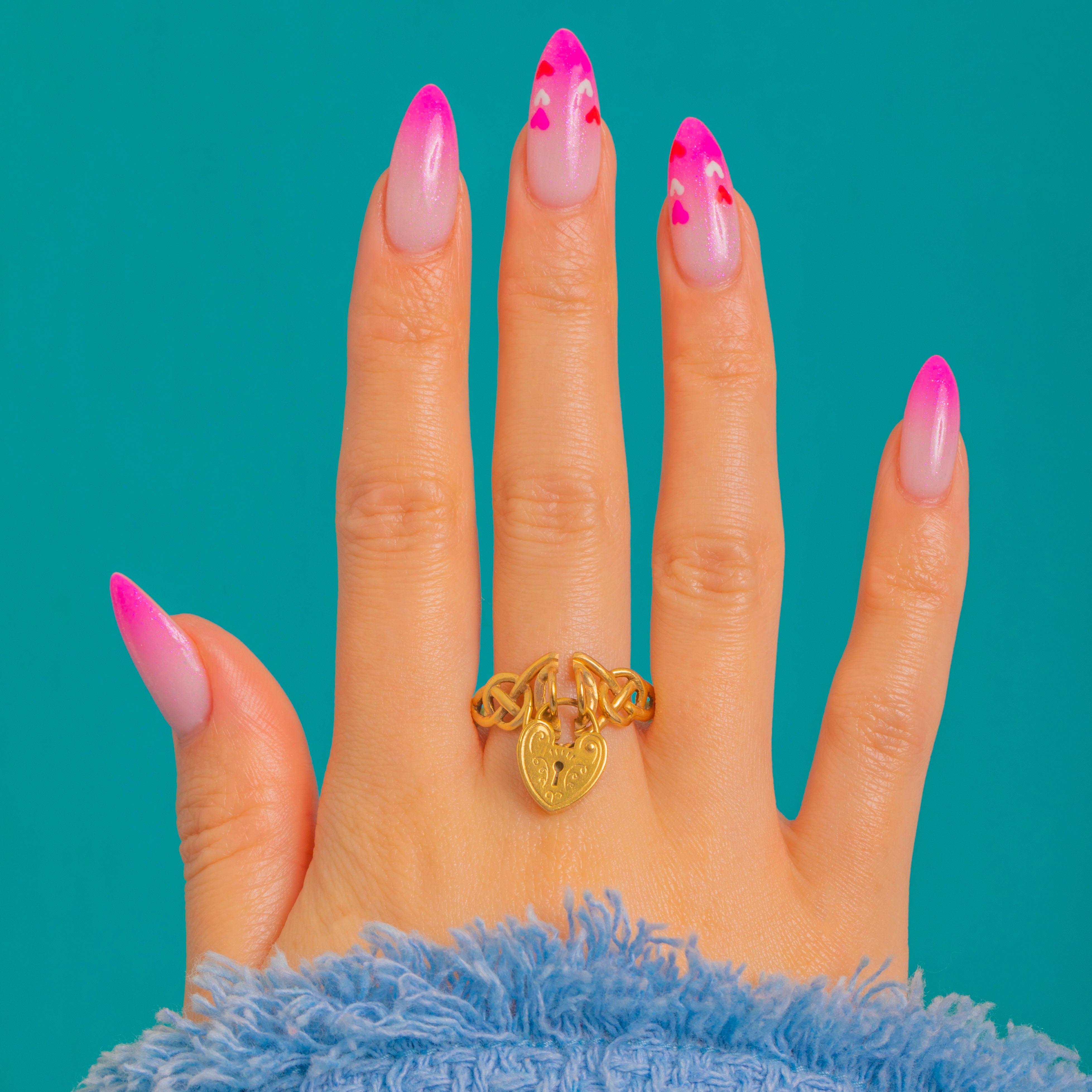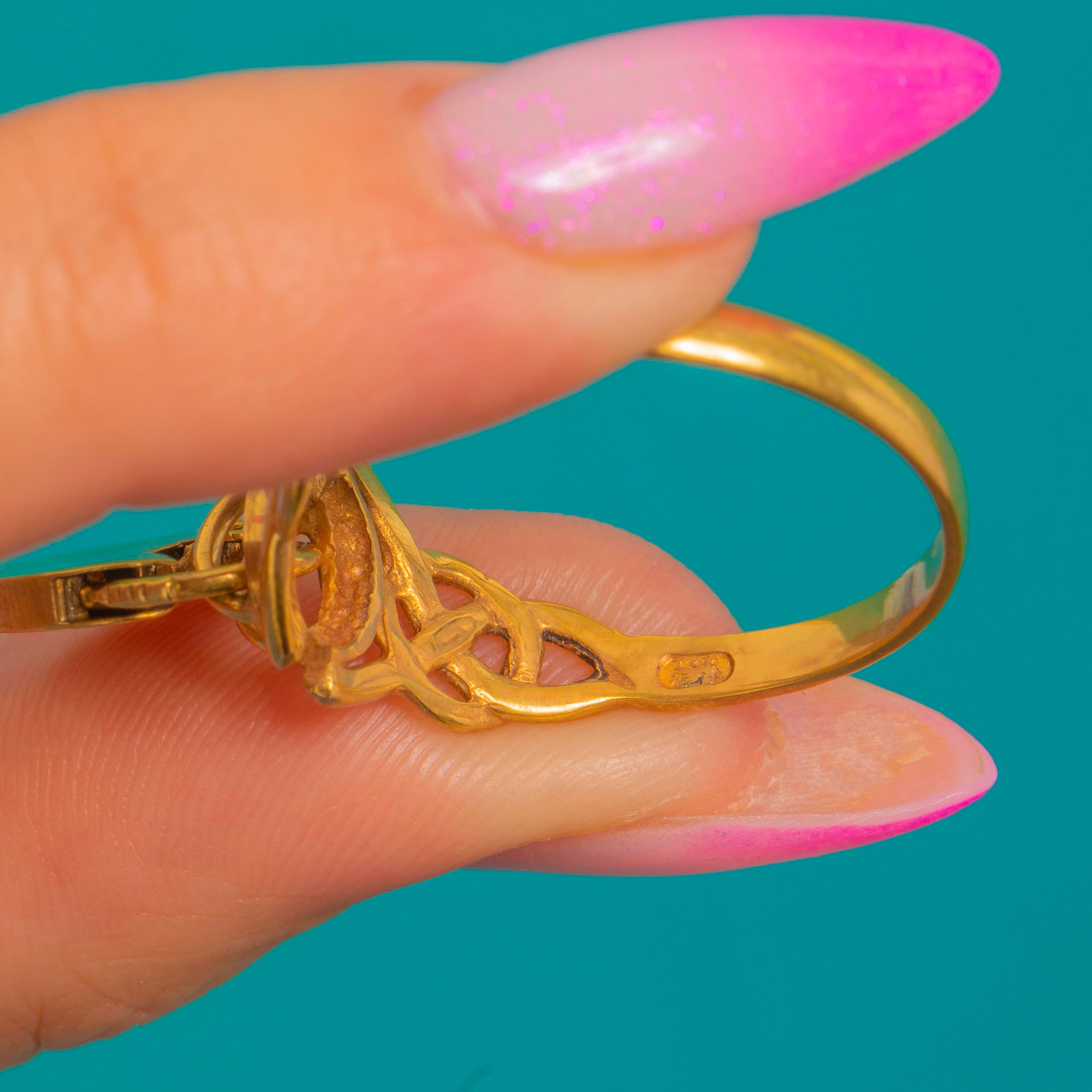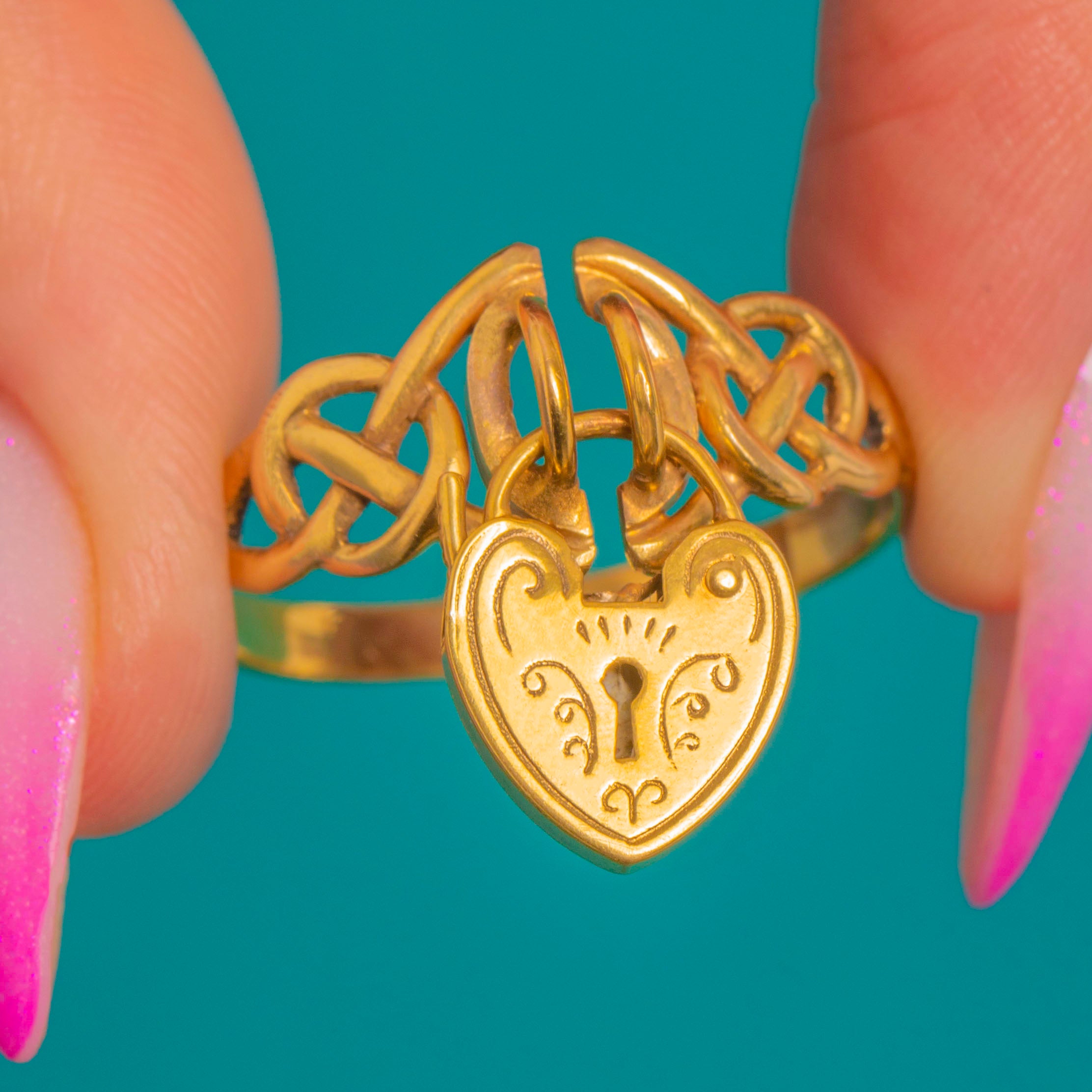 This Vintage 9ct Gold ring pairs a woven Celtic knot band with a dainty heart padlock charm for a beautifully romantic silhouette. The heart is richly detailed with engraved foliate scrolls and a central keyhole motif, and the articulation gives a gentle, elegant movement on the finger.