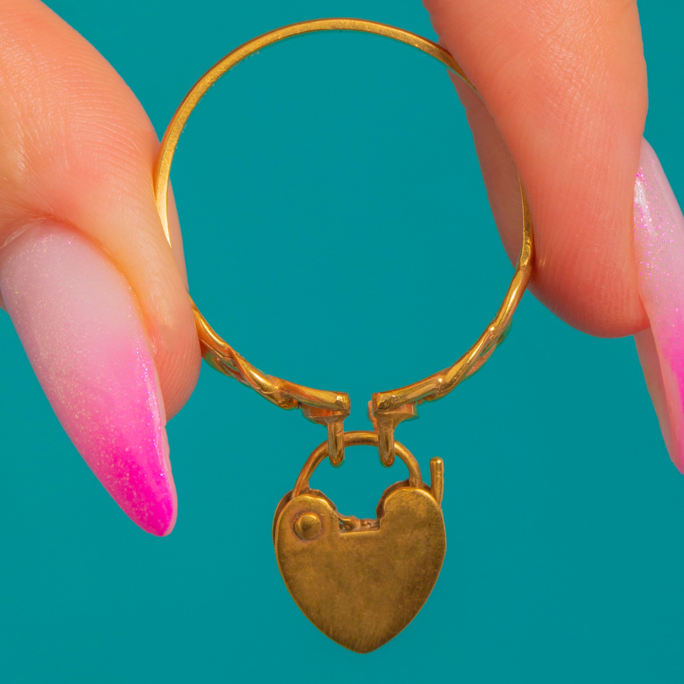 EXCELLENT: The Gold shows only light surface wear consistent with age, with a bright polish and crisp engravings to the heart padlock. The shank is secure and the details are defined, making this a ready-to-wear piece.