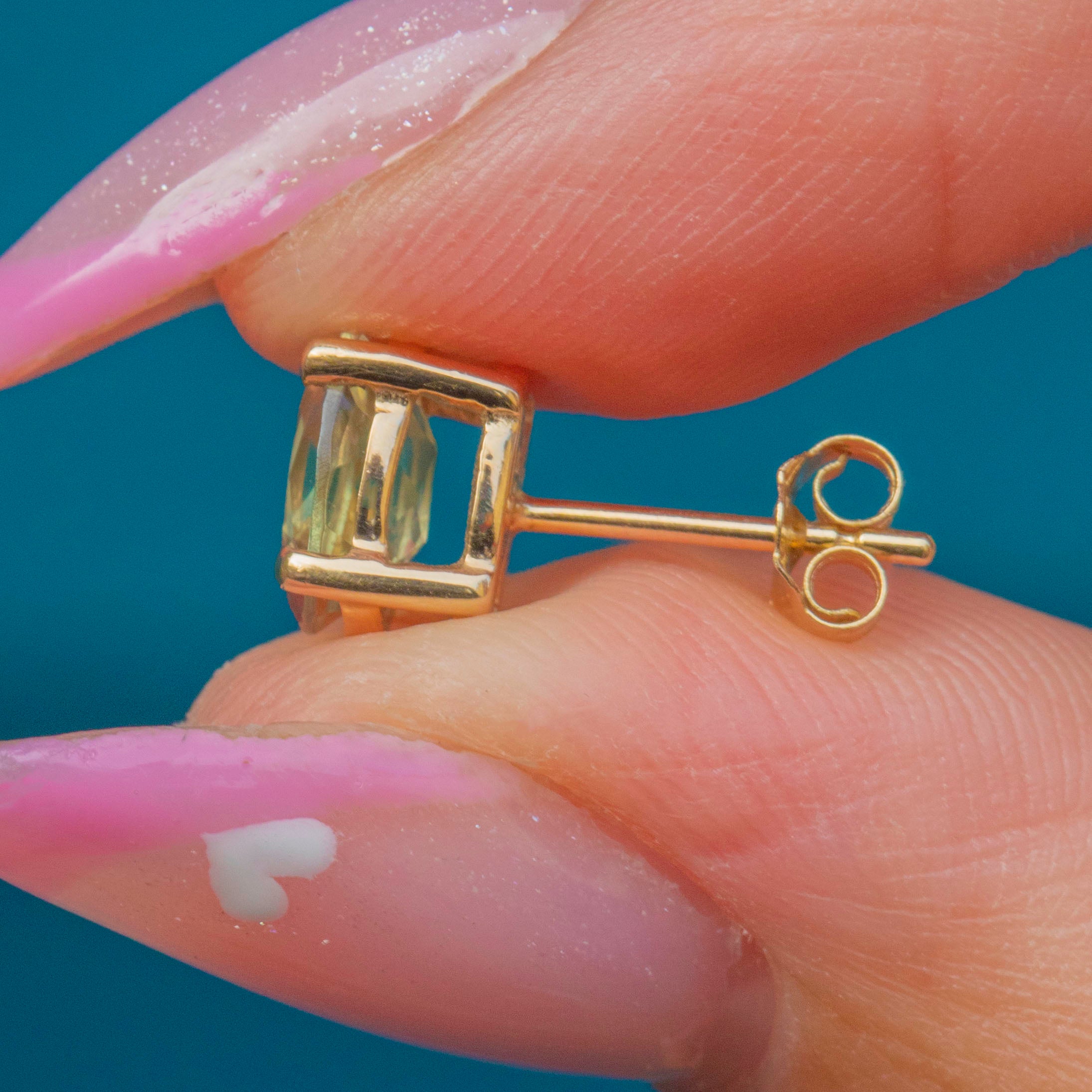 Elegant and timeless, these vintage Chrysoberyl studs shimmer with a gorgeous golden-green hue. Each earring features a lively oval Chrysoberyl securely set in a classic four-claw mount, radiating crisp brilliance from every angle.