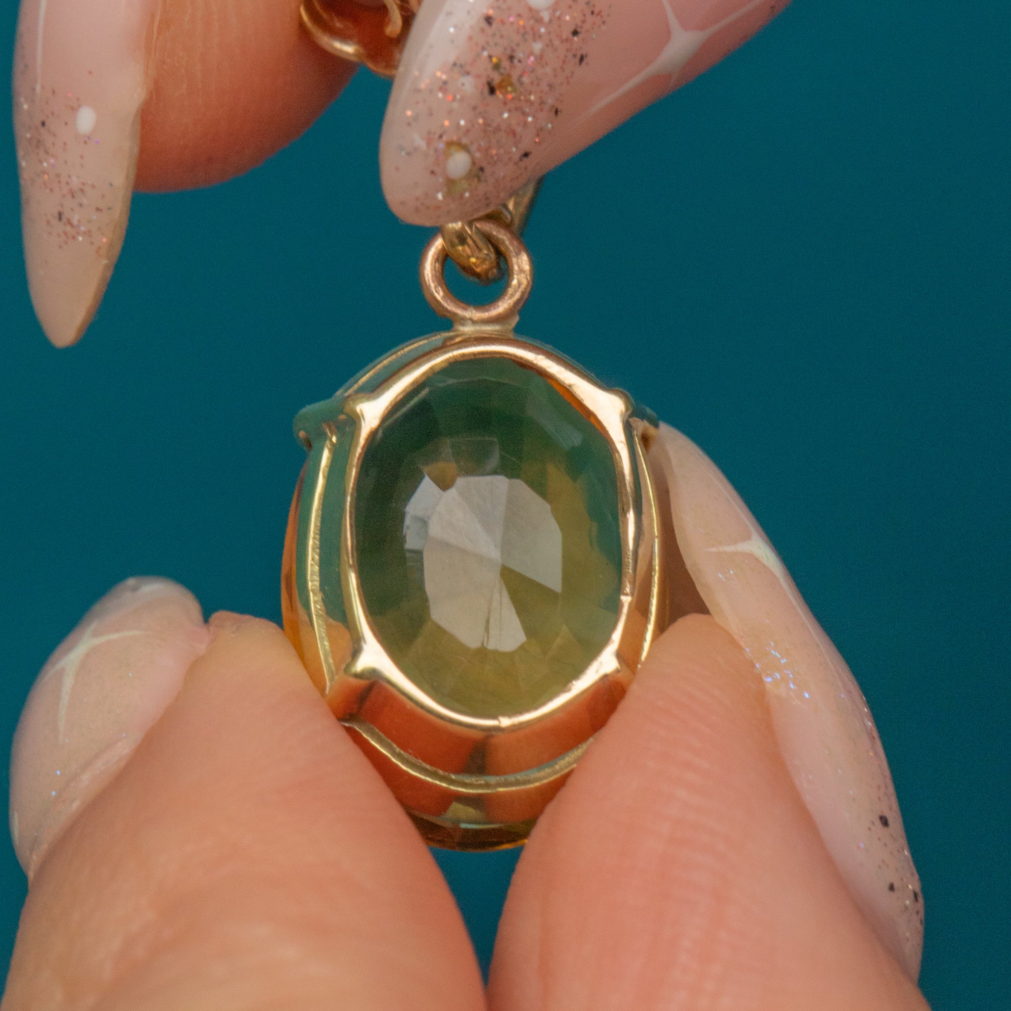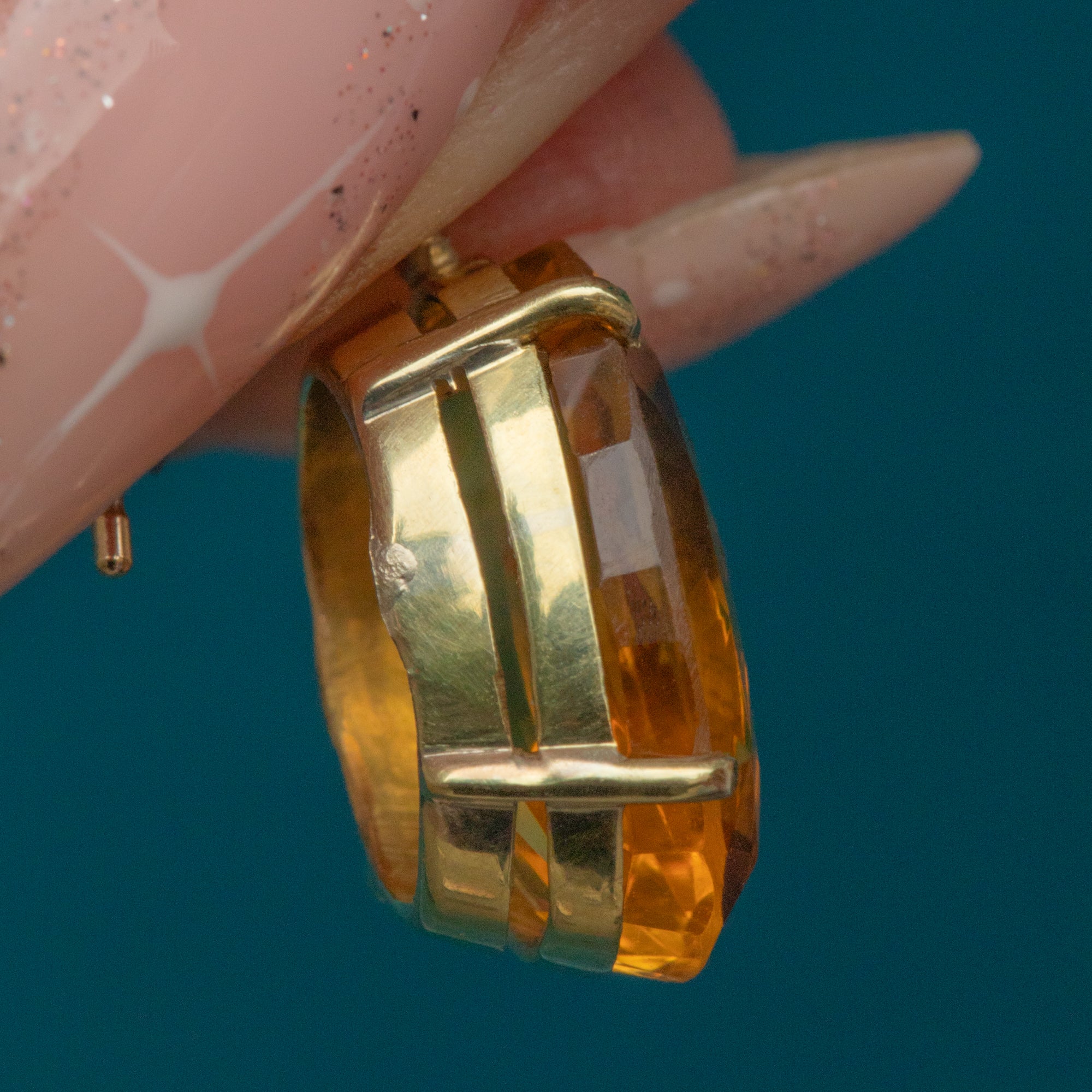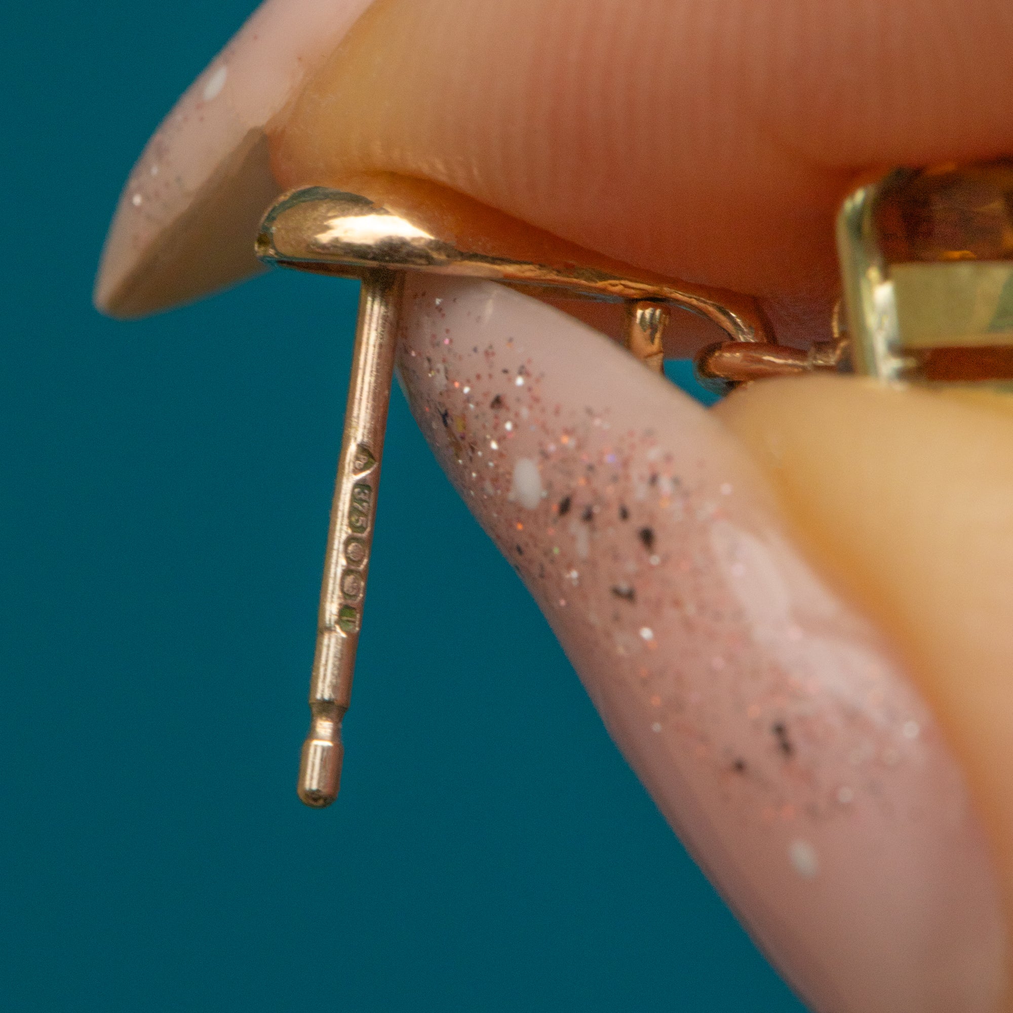 VERY GOOD-EXCELLENT. These 9ct Gold Citrine drop earrings are in wonderful condition! The Citrines are secure within the settings and can be worn with absolute confidence. There is some very subtle wear on the edges of the Citrines but nothing untoward. The Gold is buttery throughout, there is a visible join mark on one of the settings but it gives peace of mind they are securely soldered. With tight-fitting butterfly backs, simply pop these Citrine drop earrings in and enjoy their beauty!