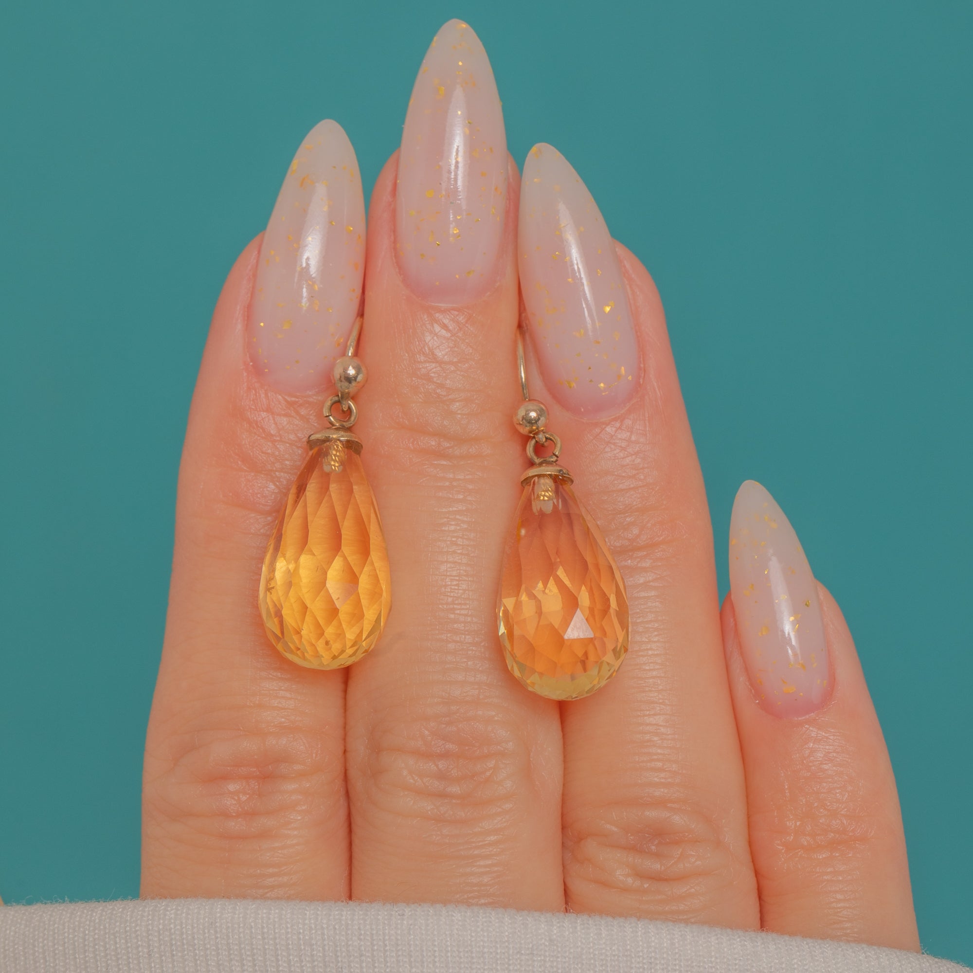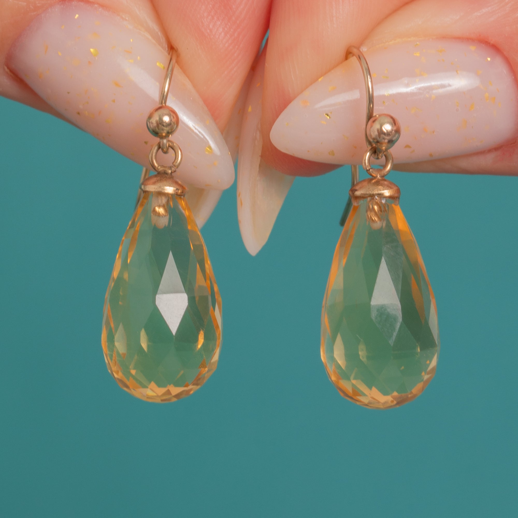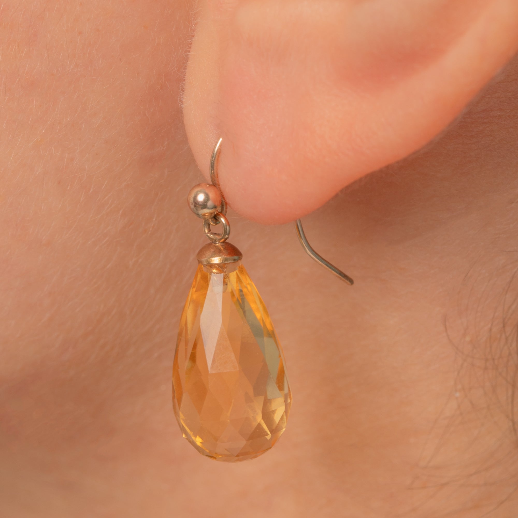 EXCELLENT: The Citrines are bright with crisp faceting and only light, minor abrasions visible under magnification; no obvious chips or cracks. Gold caps, rings and hooks are secure with gentle surface wear and a soft, even patina; ear wires are straight and functional. No visible repairs; a subtle trace of adhesive at the cap junction is typical for briolette settings.