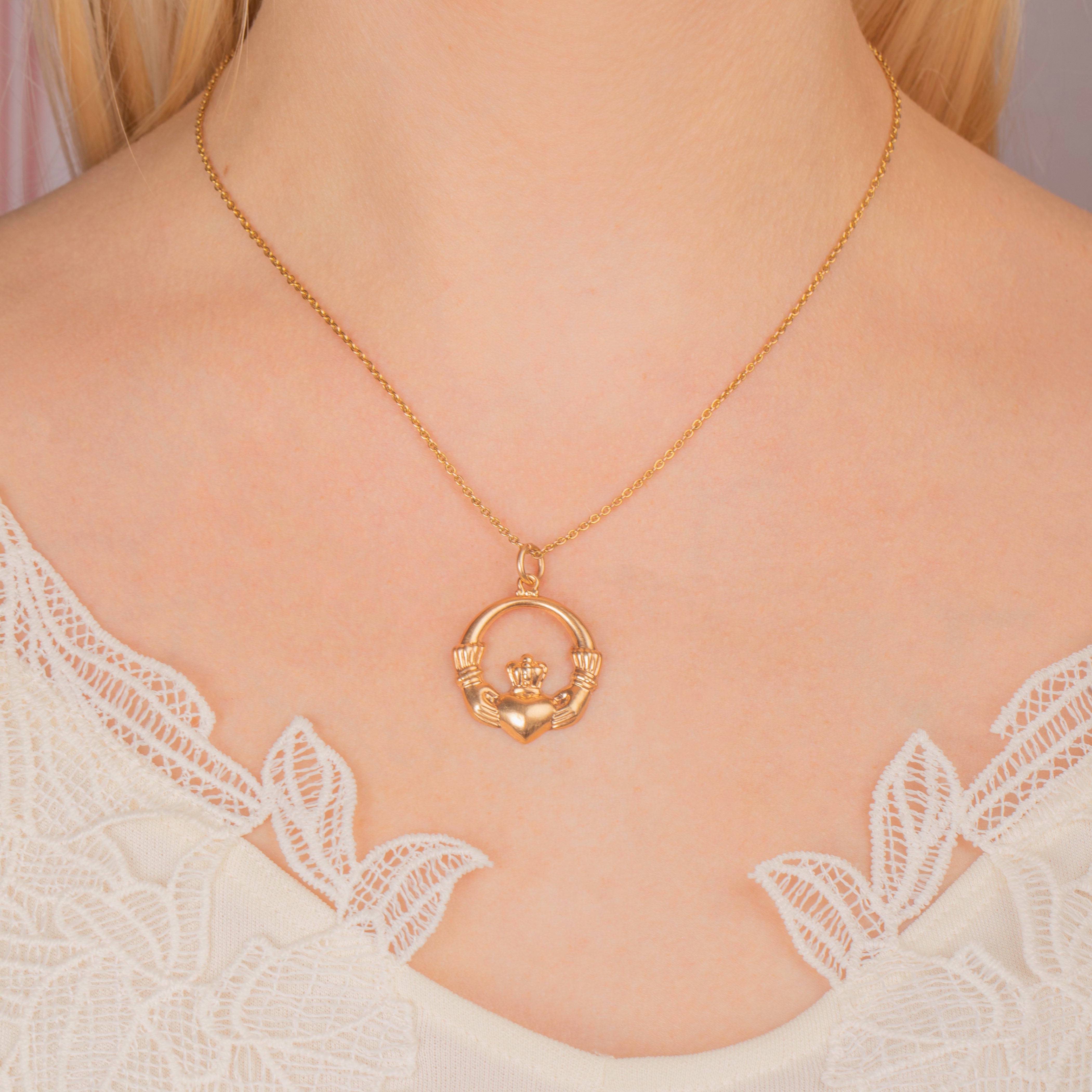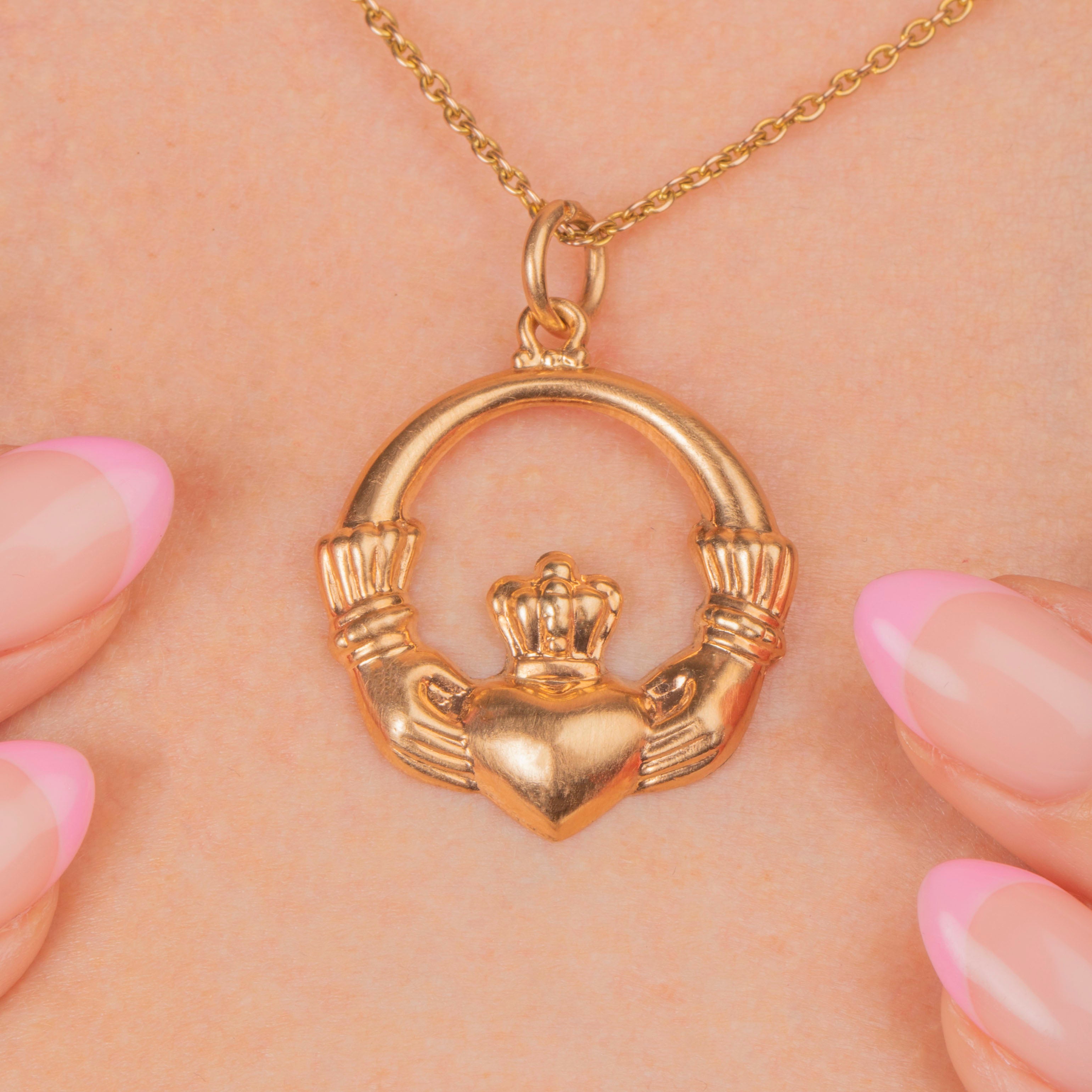 Bring sentimentality to your jewellery box with this 9ct Gold Claddagh pendant! An Irish design, the Claddagh motif is steeped in symbolism: the heart love, the crown loyalty and the hands friendship.
