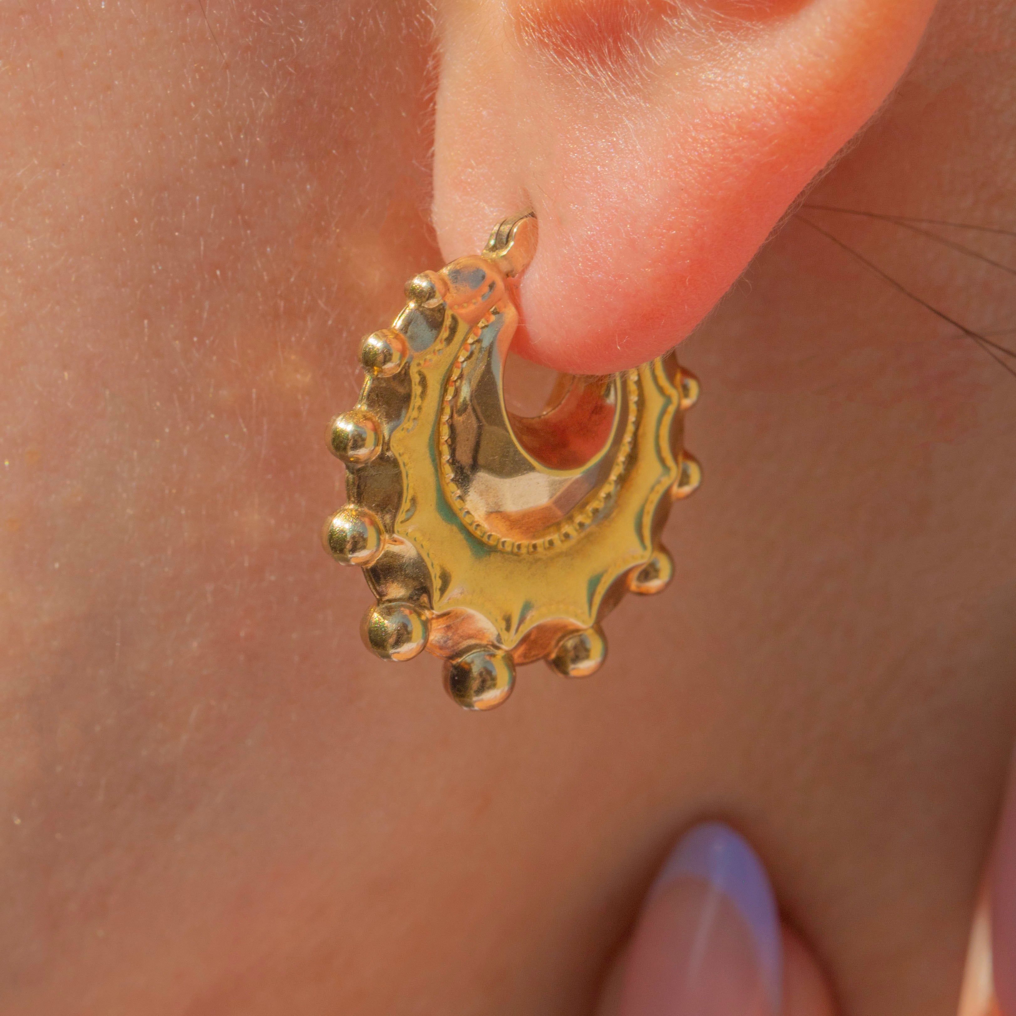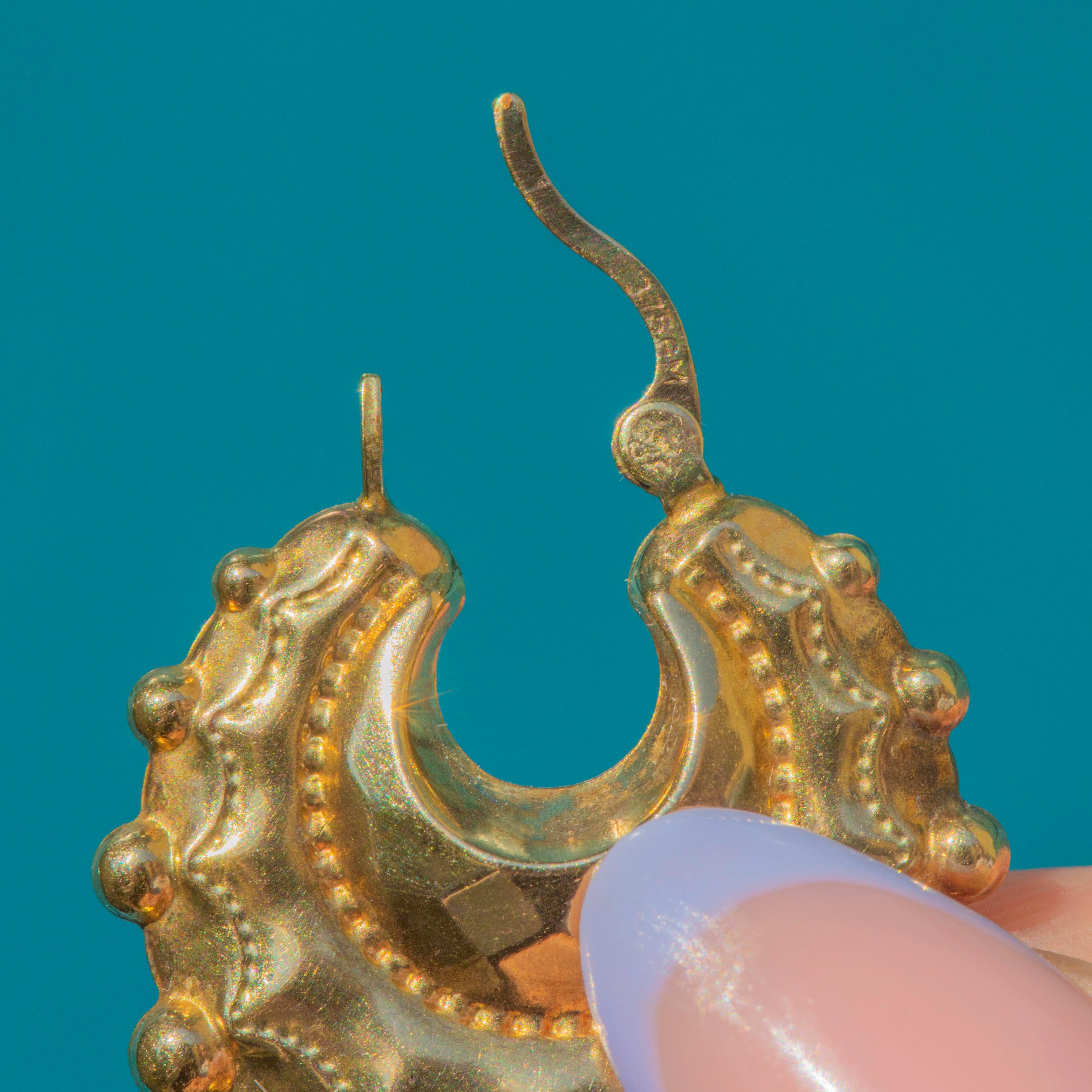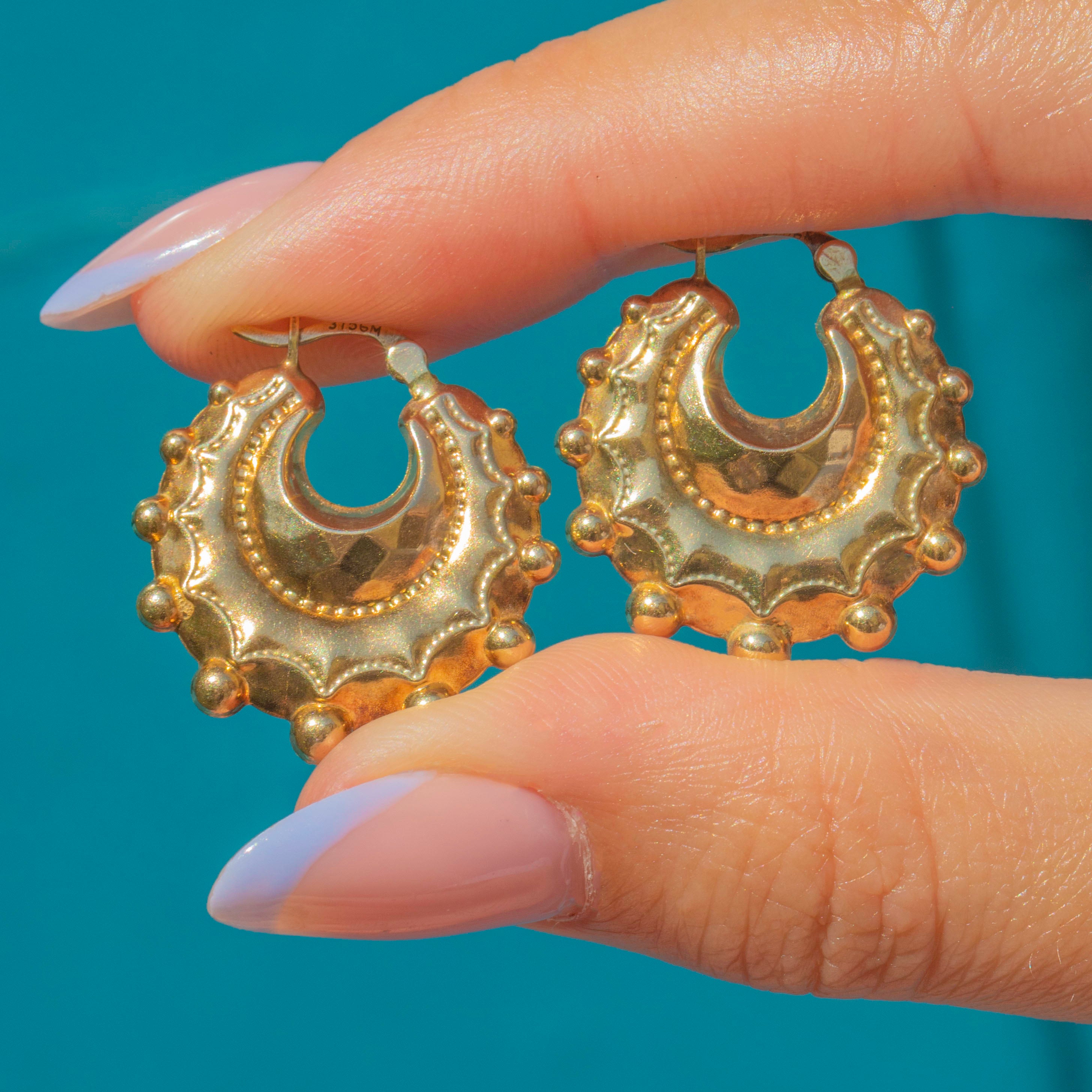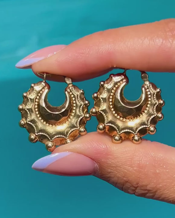 Gefertigt aus reichhaltigem 9ct Gold, sind diese Creolen-Ohrringe kühn und auffällig, mit ihrem einzigartigen Design, das sicher beeindruckt. Diese Vintage-Creolen sehen im Ohr wunderschön aus und können täglich getragen werden, ohne am Ohr zu ziehen!