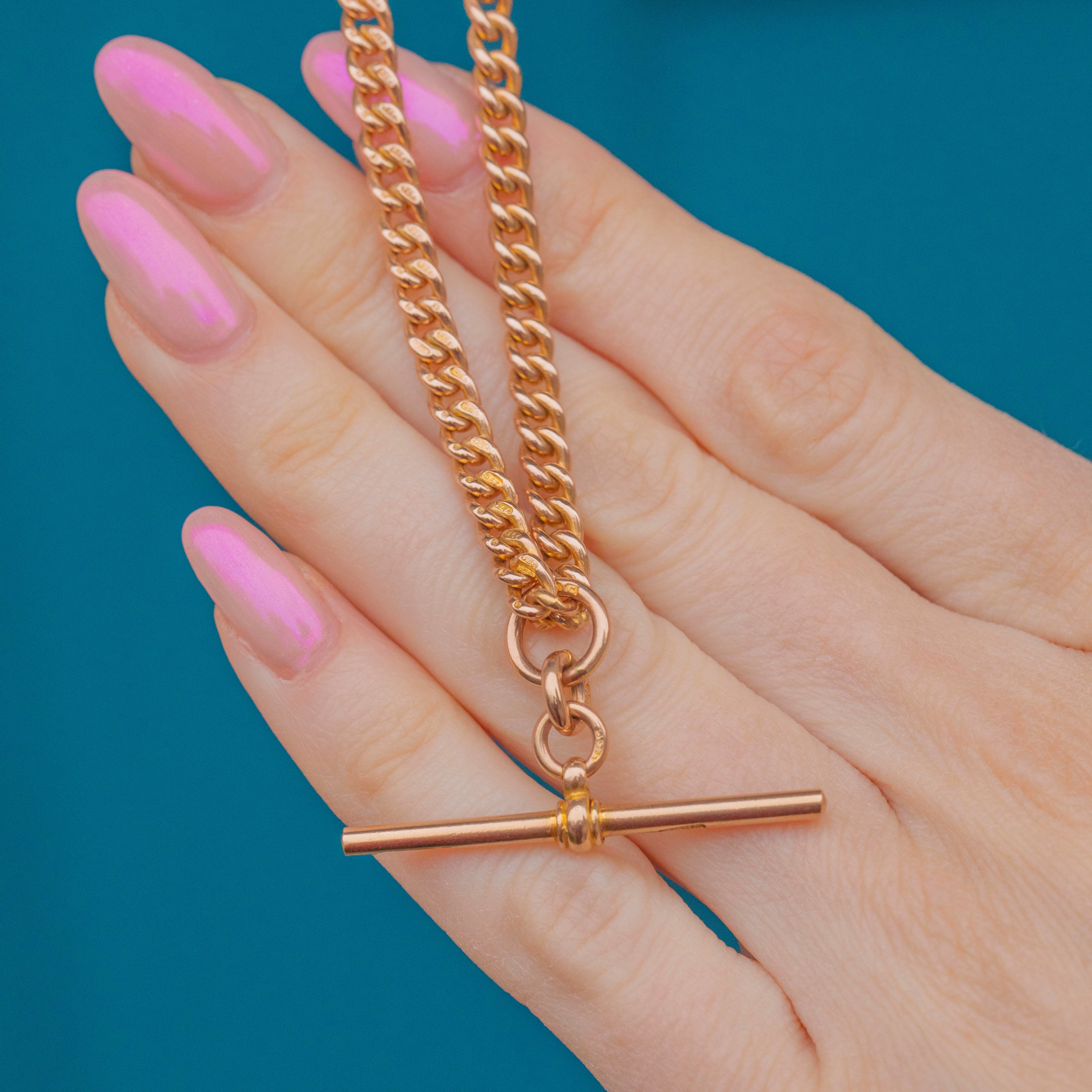 EXCELLENT. This 9ct Gold Albert chain is in excellent condition. The dog-clips function perfectly, the t-bar runs smoothly across it and every link has retained its crisp stamps. A lovely choice for your collection.