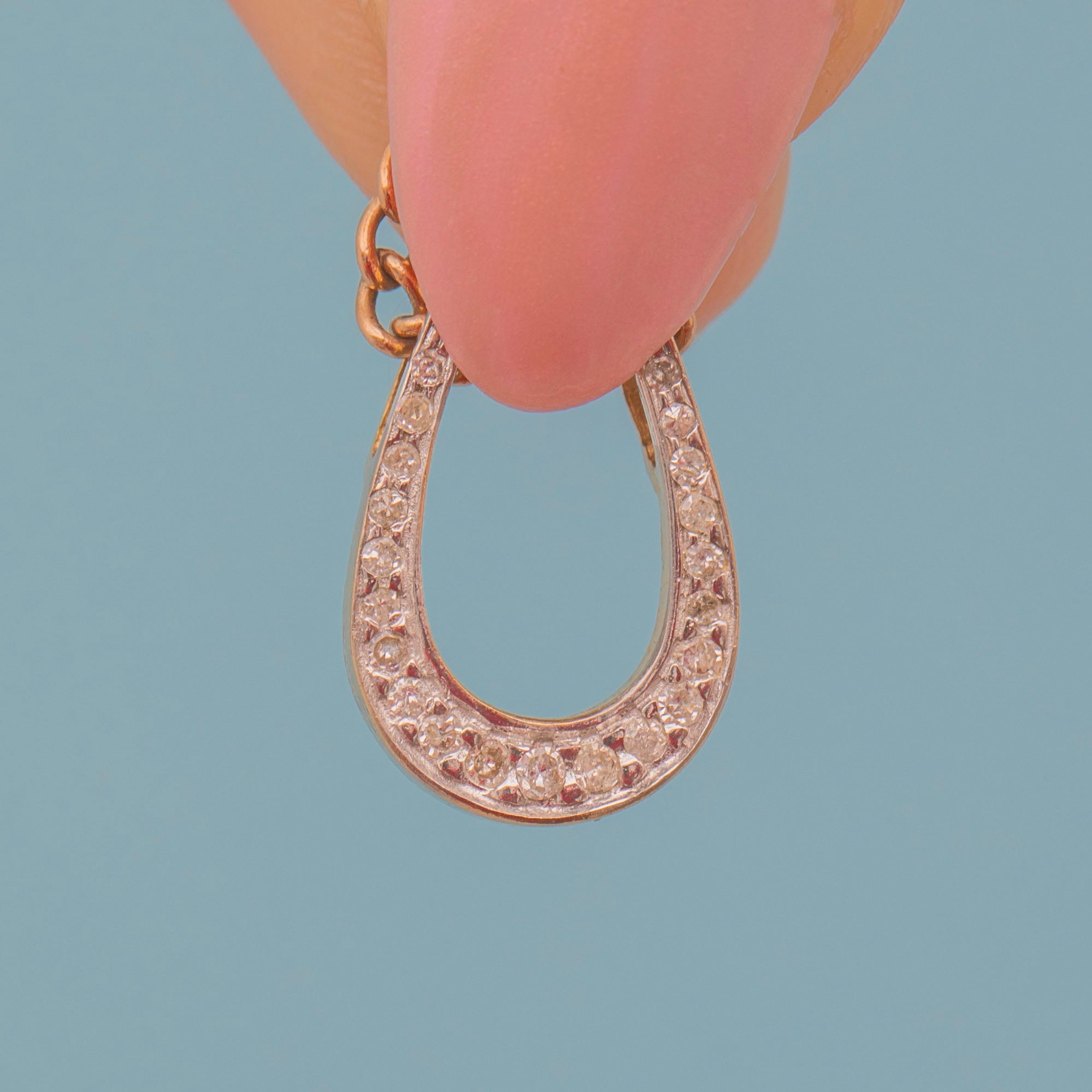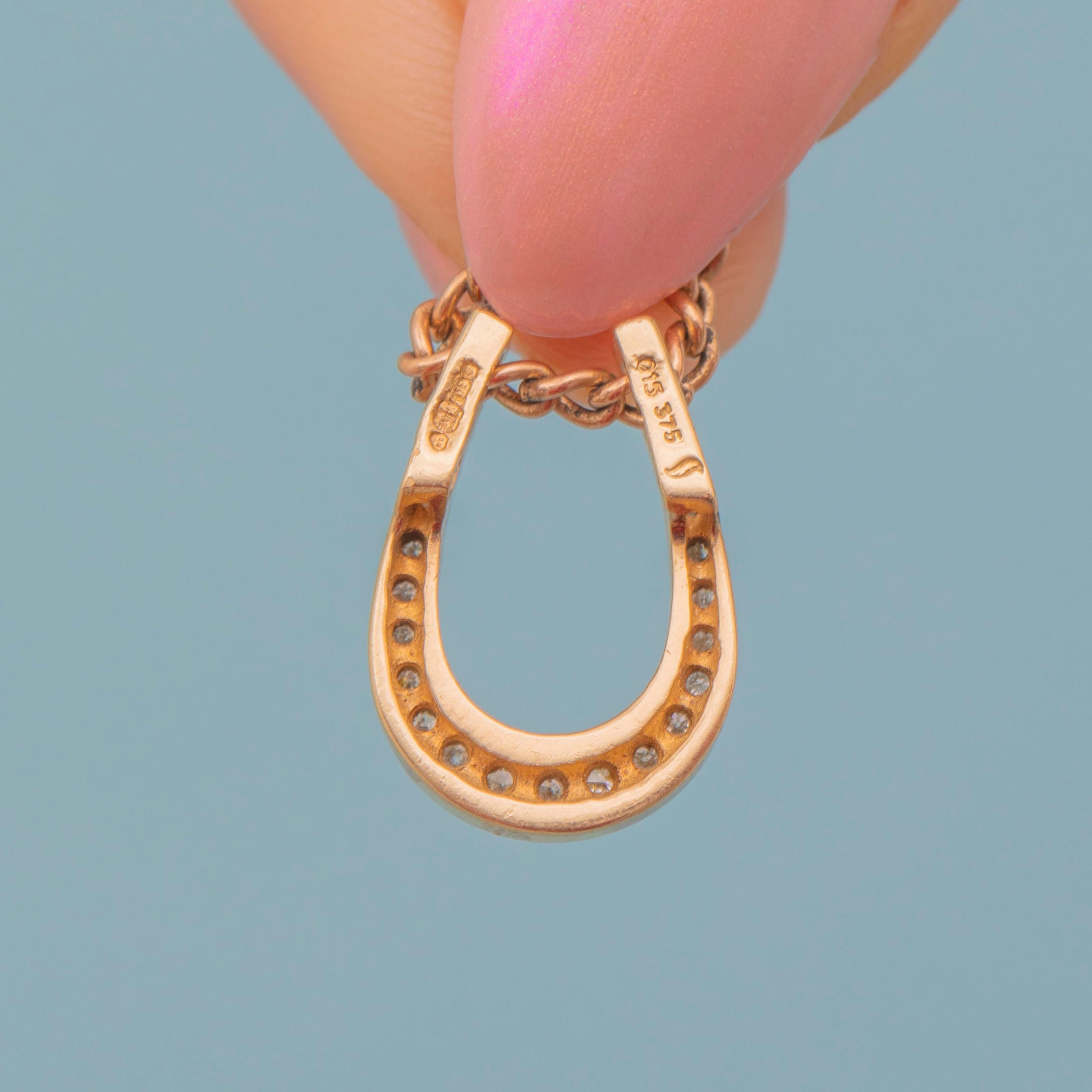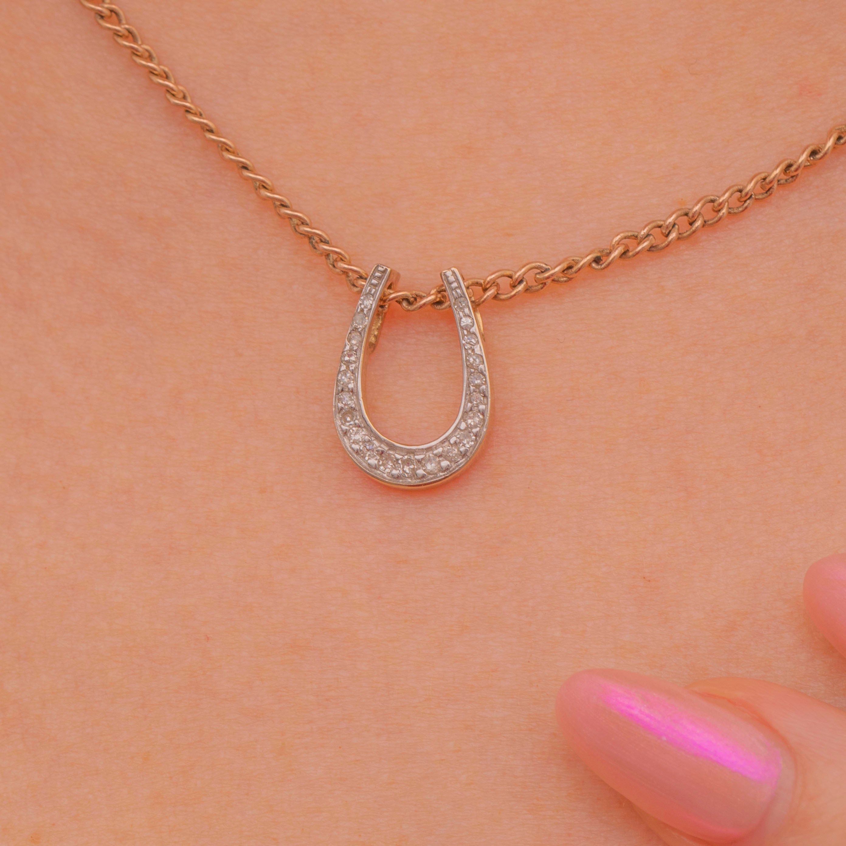 EXCELLENT. This 9ct Gold Diamond horseshoe slider pendant is in excellent condition. Her Diamonds are securely set and twinkle majestically without chips or scratches, and the Gold is bright and buttery. All in all, this fantastic vintage pendant is the most wonderful lucky charm to add to your collection!