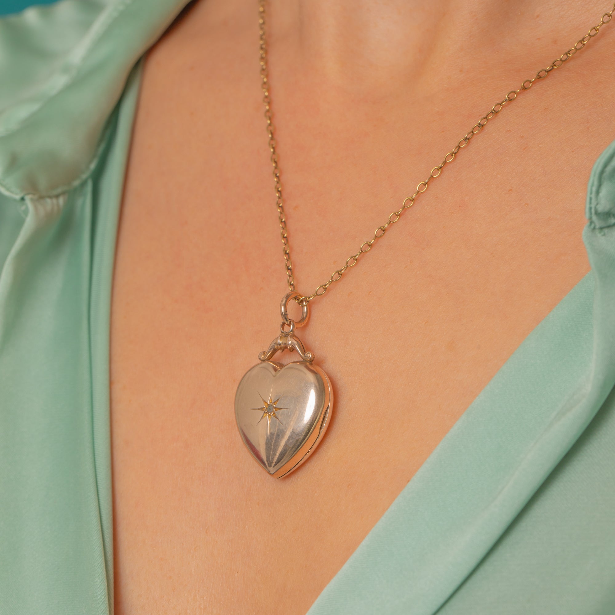 This beautiful Vintage locket is crafted in warm 9ct Gold and styled into a romantic heart shape. The softly puffed heart form features a hand-engraved starburst set with a single twinkling Diamond at its centre, giving just the right amount of sparkle.