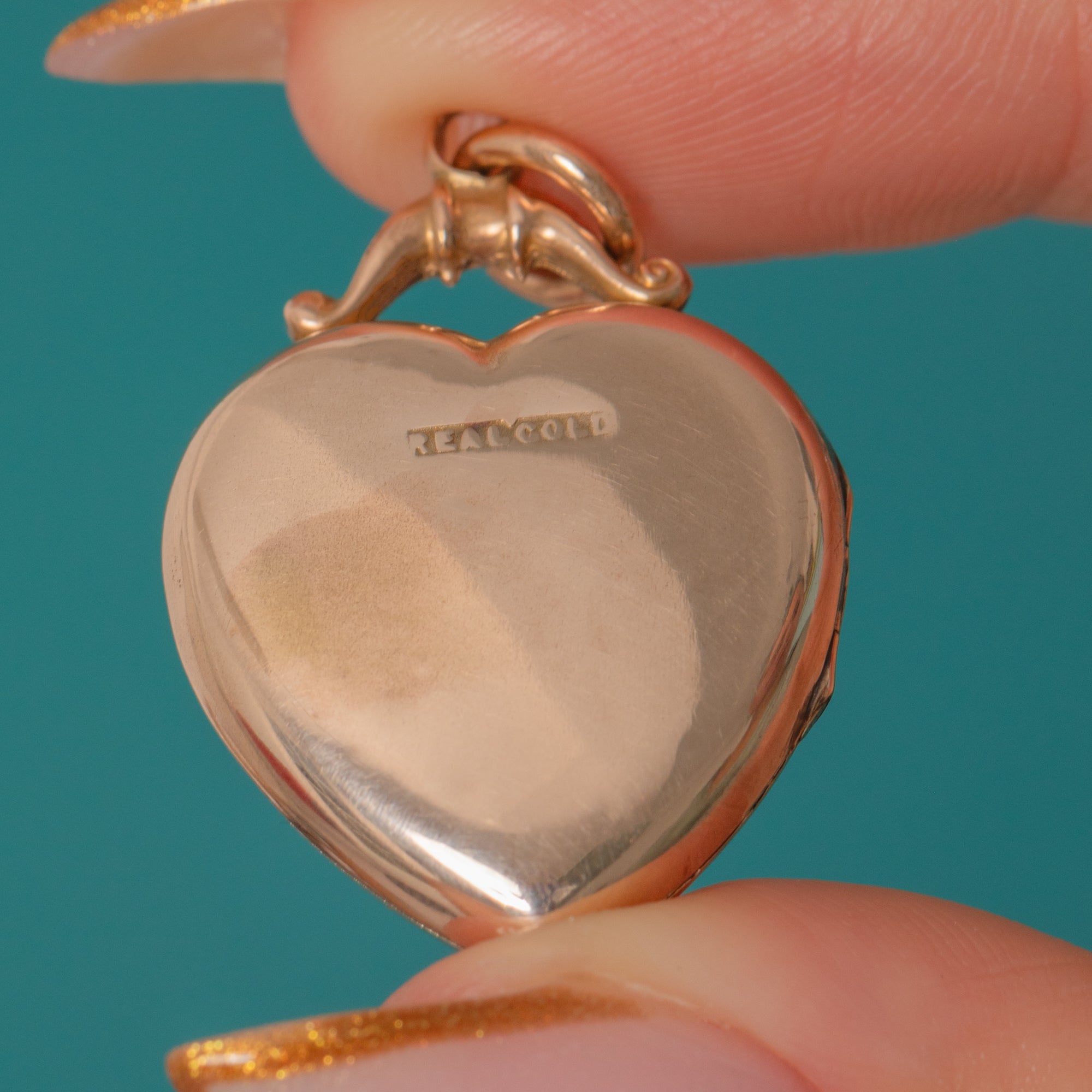 STAMPS: “REAL GOLD” on back of locket.