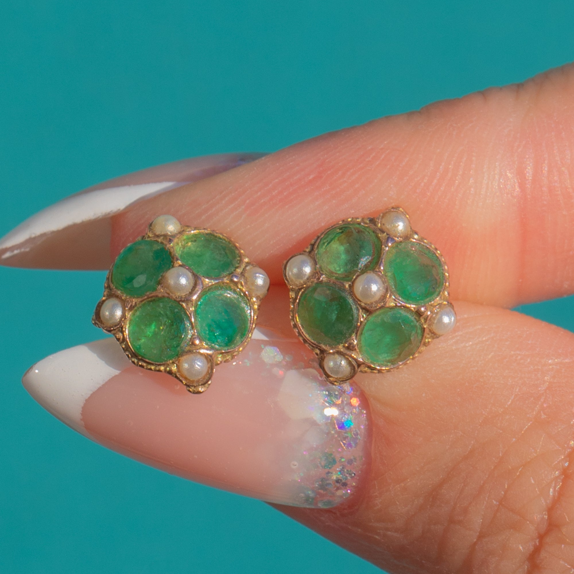 Diese bezaubernden Victorian Smaragd- und Perlen-Cluster-Ohrringe sind ein wundervolles Beispiel für das Design des späten 19. Jahrhunderts. Gefertigt aus warmem 9ct Gold, ist jeder Ohrring mit vier leuchtend grünen Smaragden in einer abgerundeten Anordnung besetzt, die von zarten, natürlichen Perlen akzentuiert werden und so einen sanften, romantischen Schimmer verleihen.