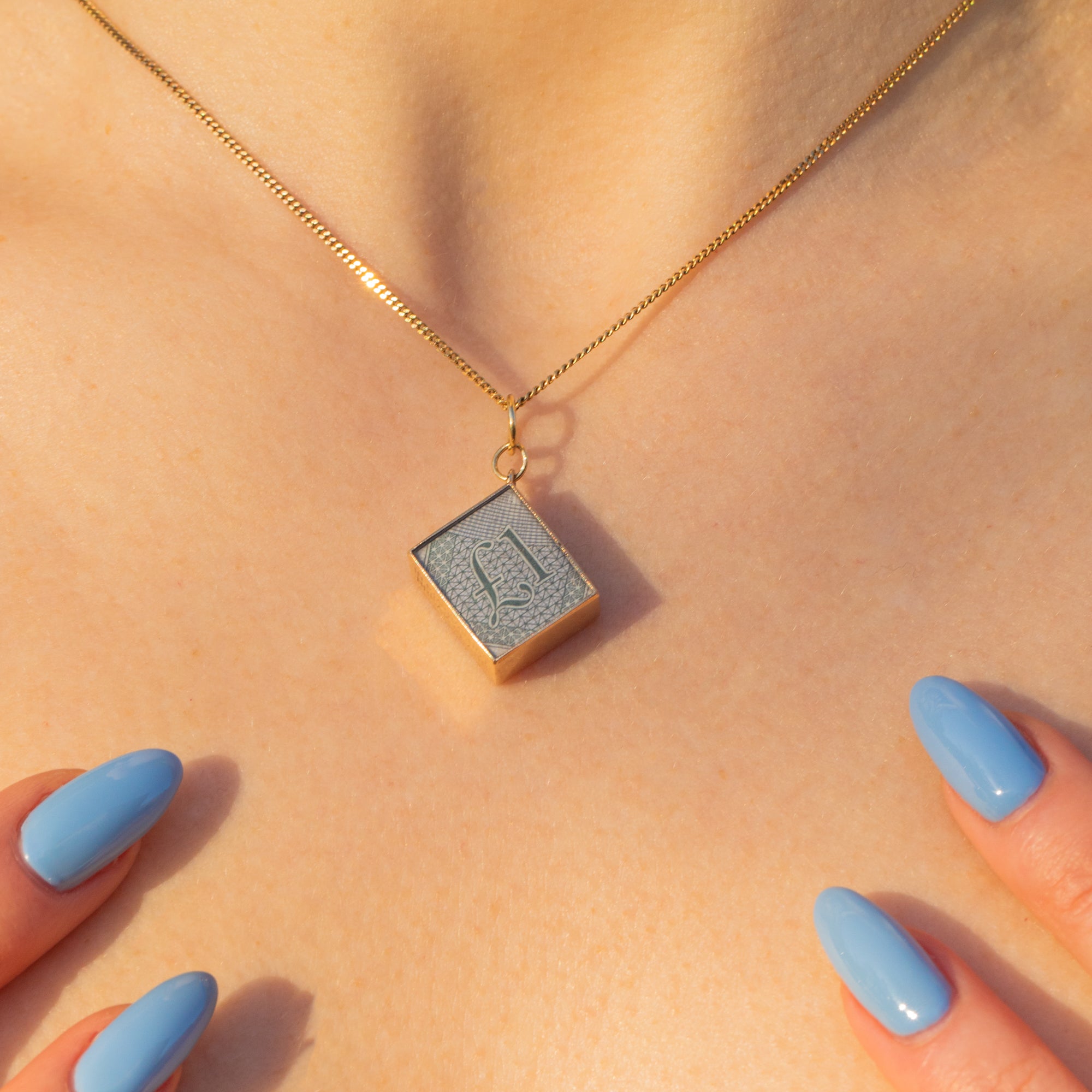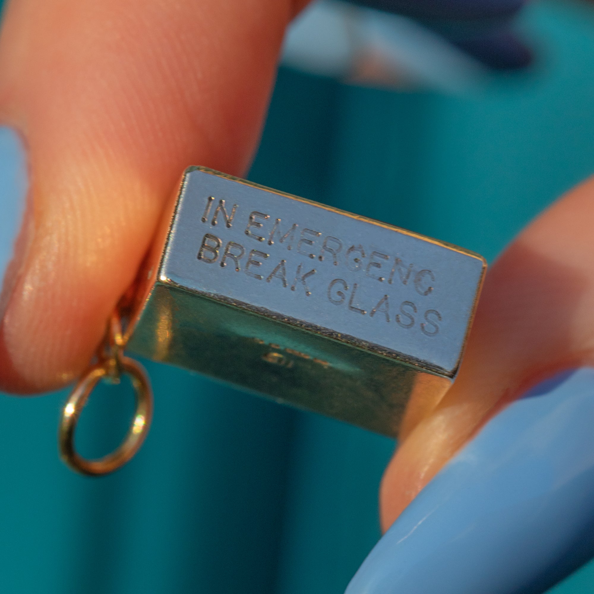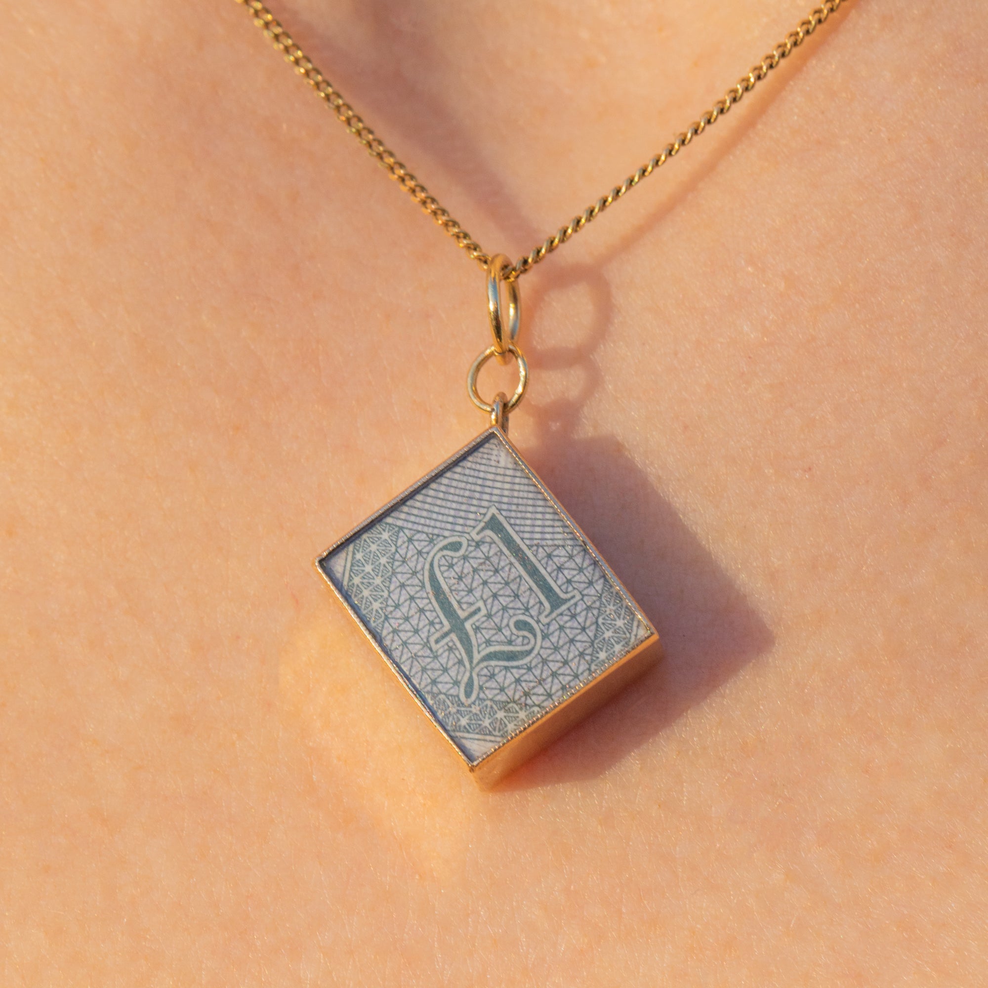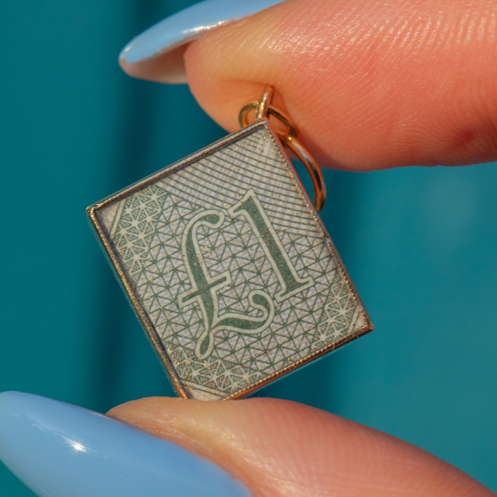 We are in awe of this 9ct Gold emergency one pound note charm! Her one pound note is folded with precision to perfectly fit within her buttery 9ct Gold box, showcasing the '£1' behind her clear pane of glass.