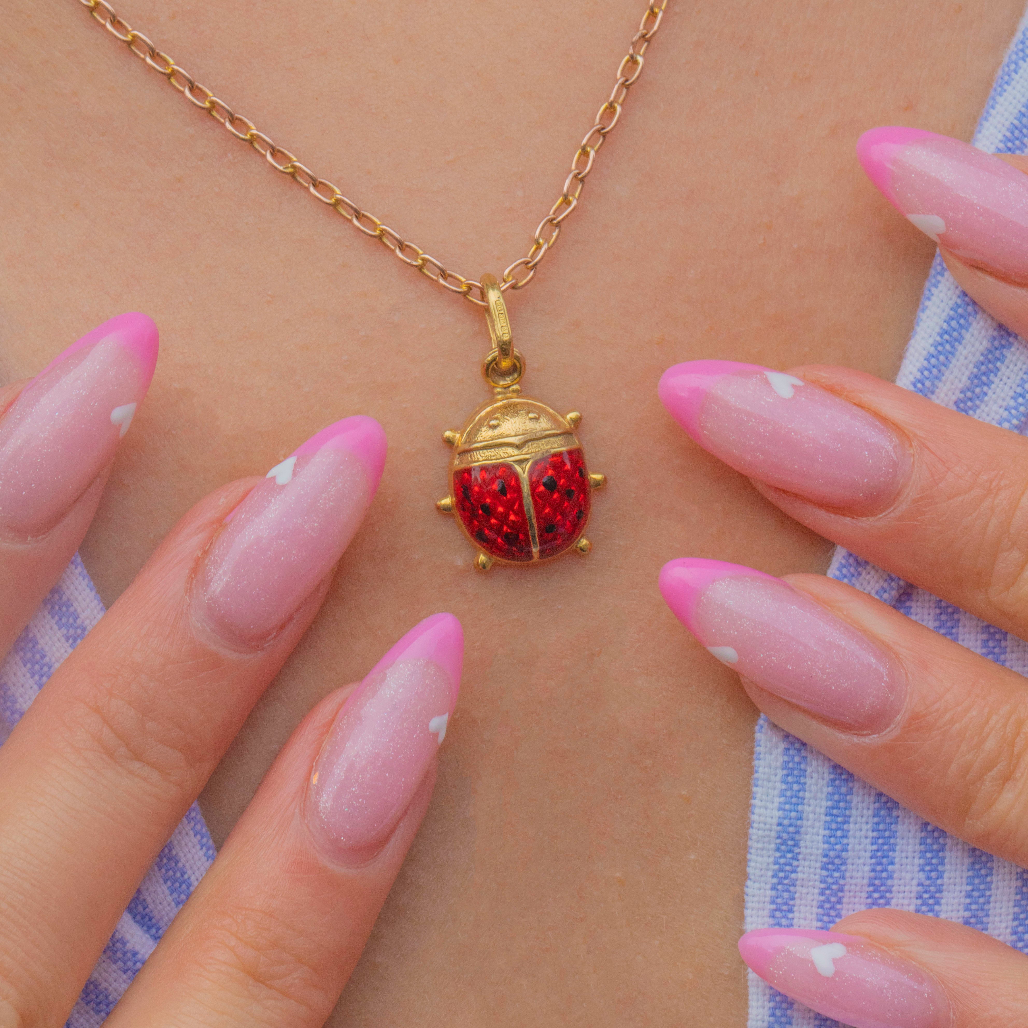 A charming Vintage 9ct Gold ladybird charm, enamelled in vibrant red and black for a lifelike finish. The design captures the beloved little insect in exquisite detail, with glossy iridescent enamel and a warm Gold body that gleams beautifully in the light.