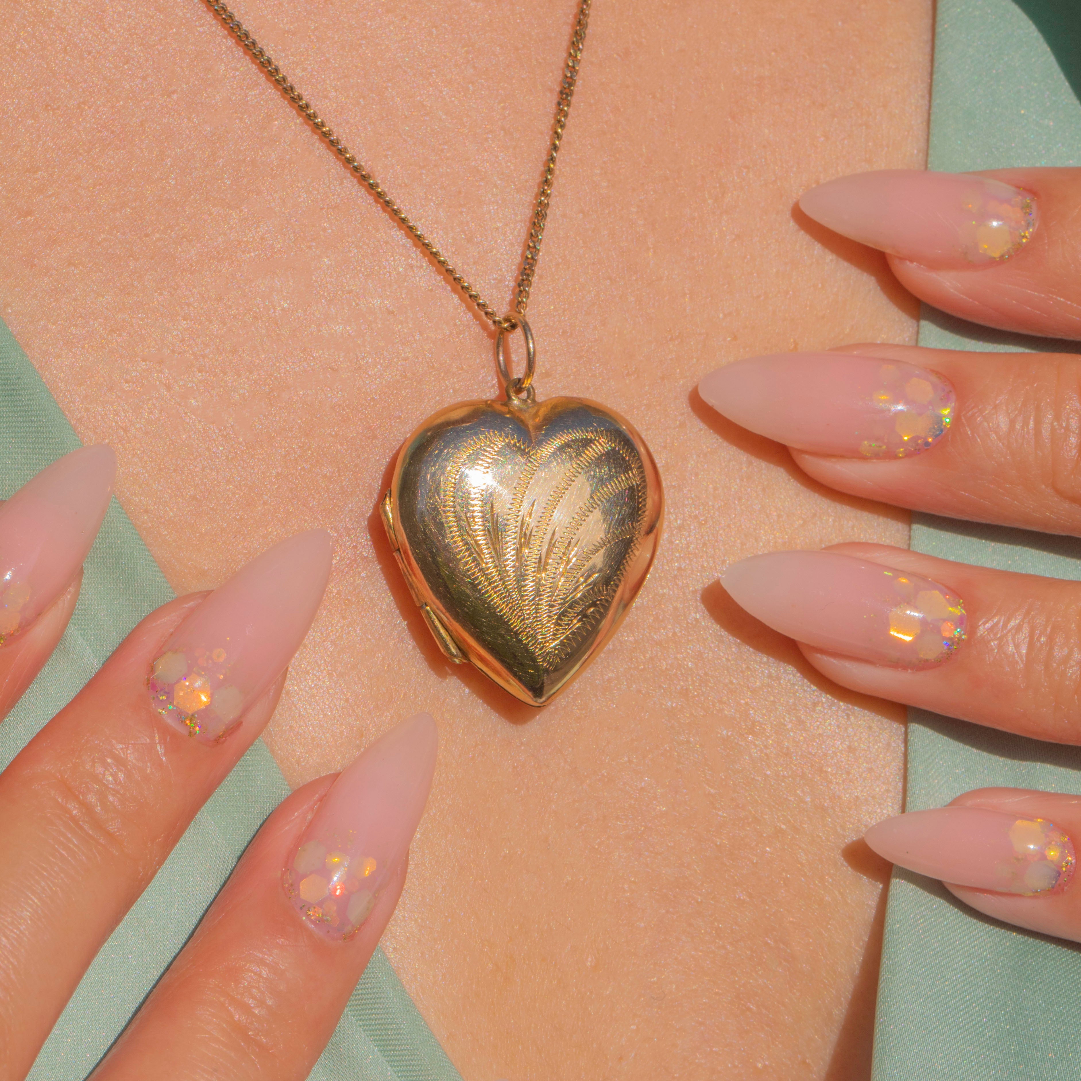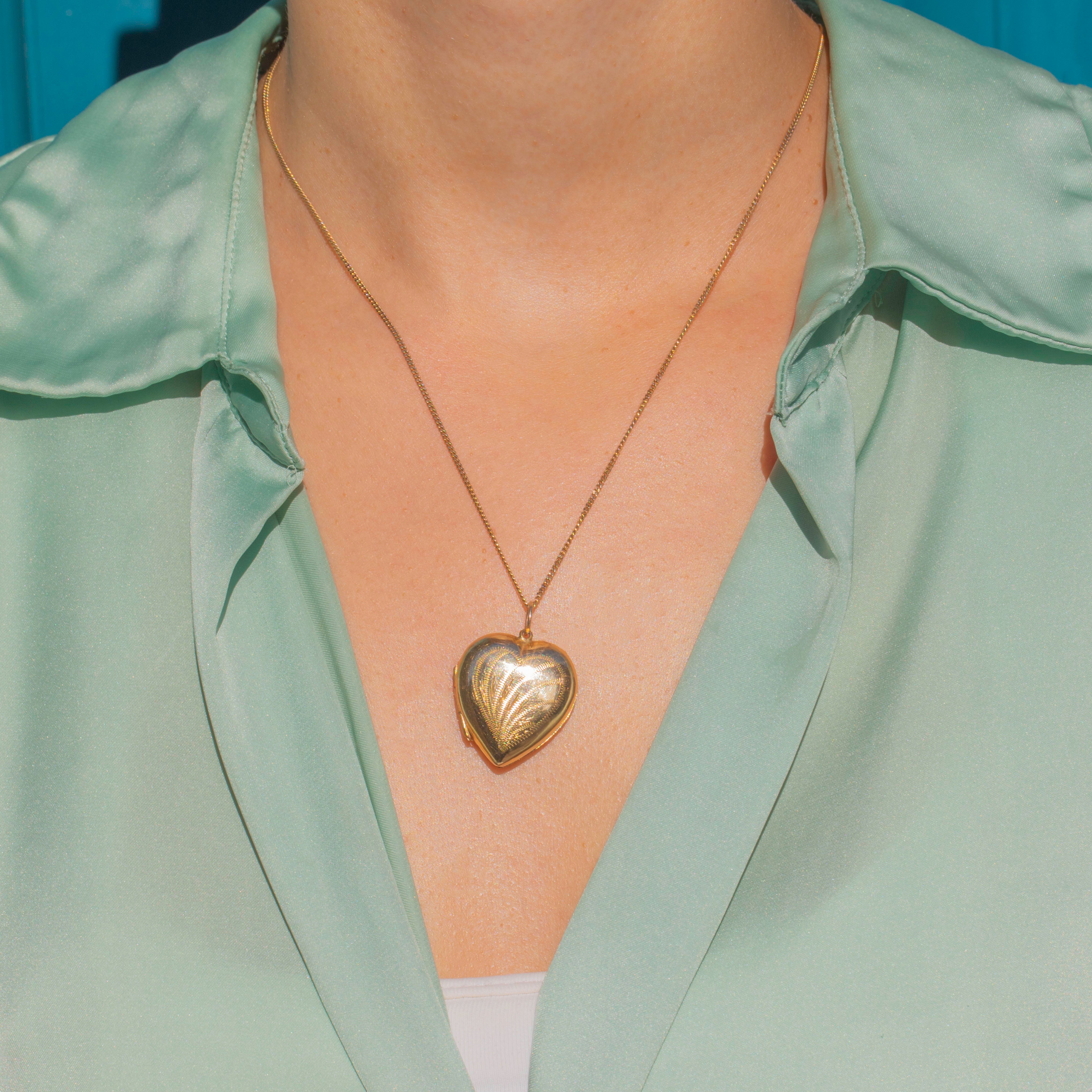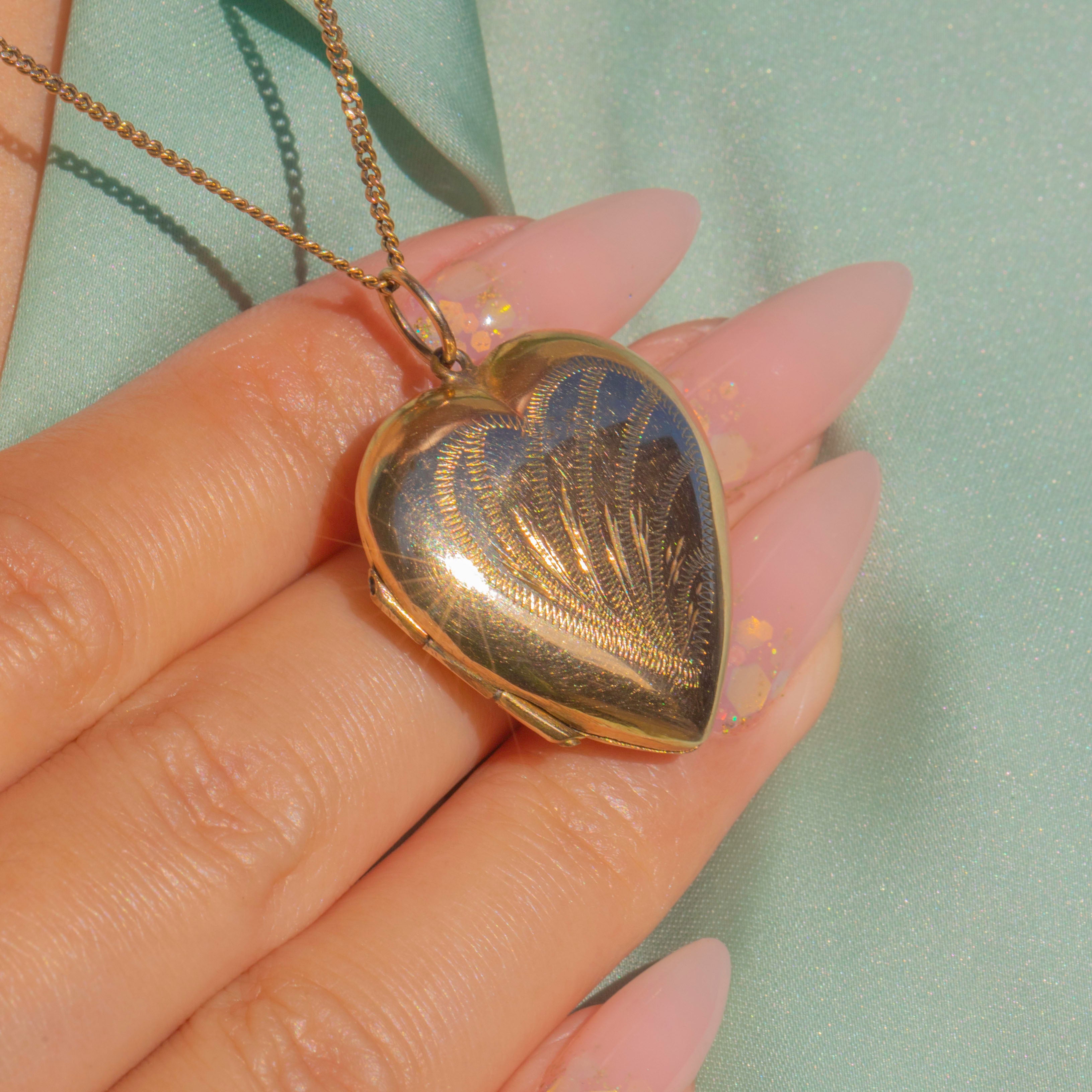 A romantic Mid-Century 9ct Gold heart locket with charming hand-engraved detailing to both sides. Its softly domed form and warm golden hue give it a timeless appeal, while the interior retains its original metal photo frames, ready to hold cherished keepsakes.
