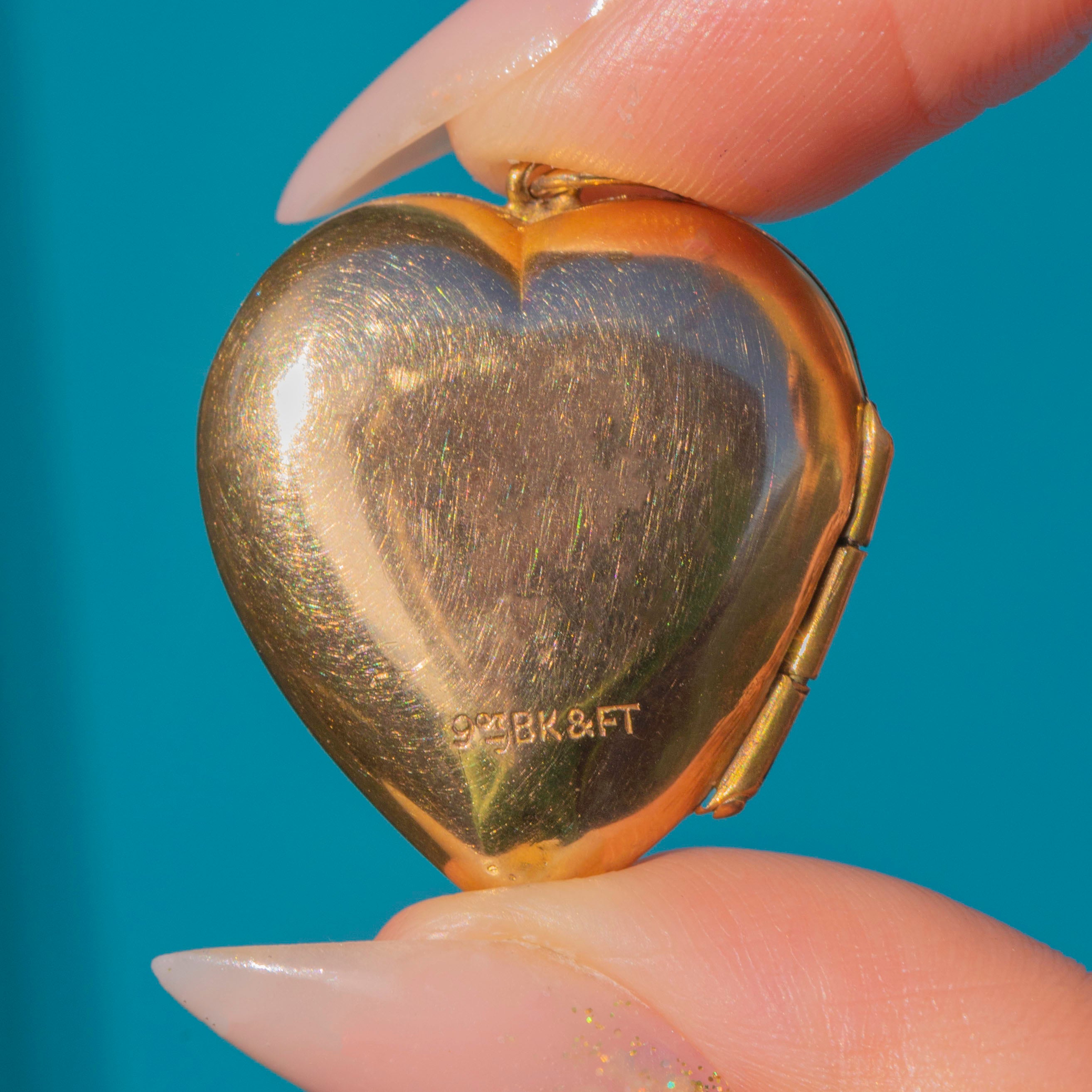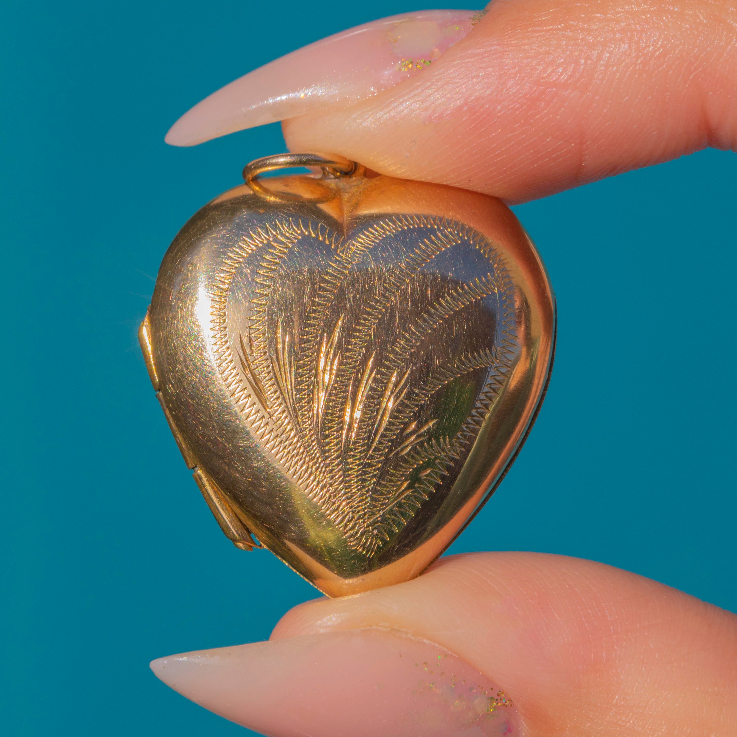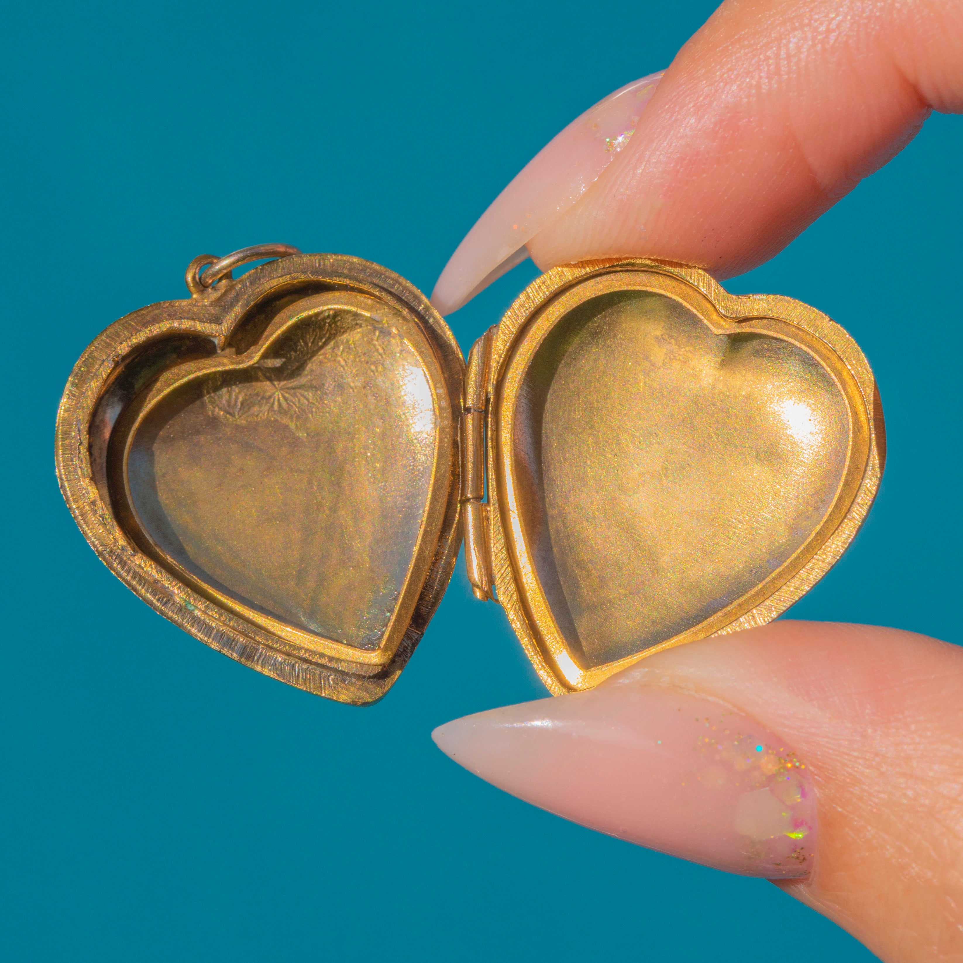 A romantic Mid-Century 9ct Gold heart locket with charming hand-engraved detailing to both sides. Its softly domed form and warm golden hue give it a timeless appeal, while the interior retains its original metal photo frames, ready to hold cherished keepsakes.