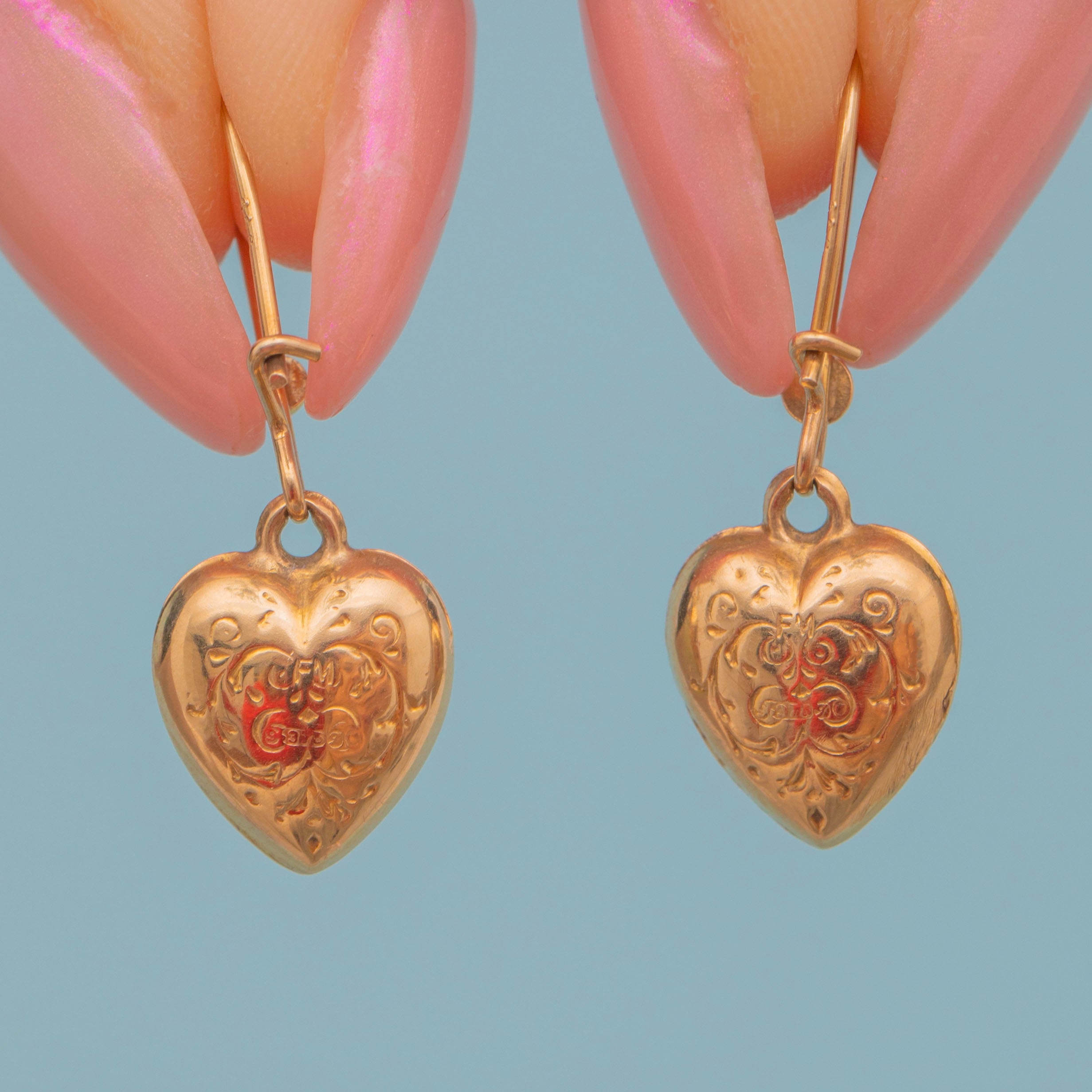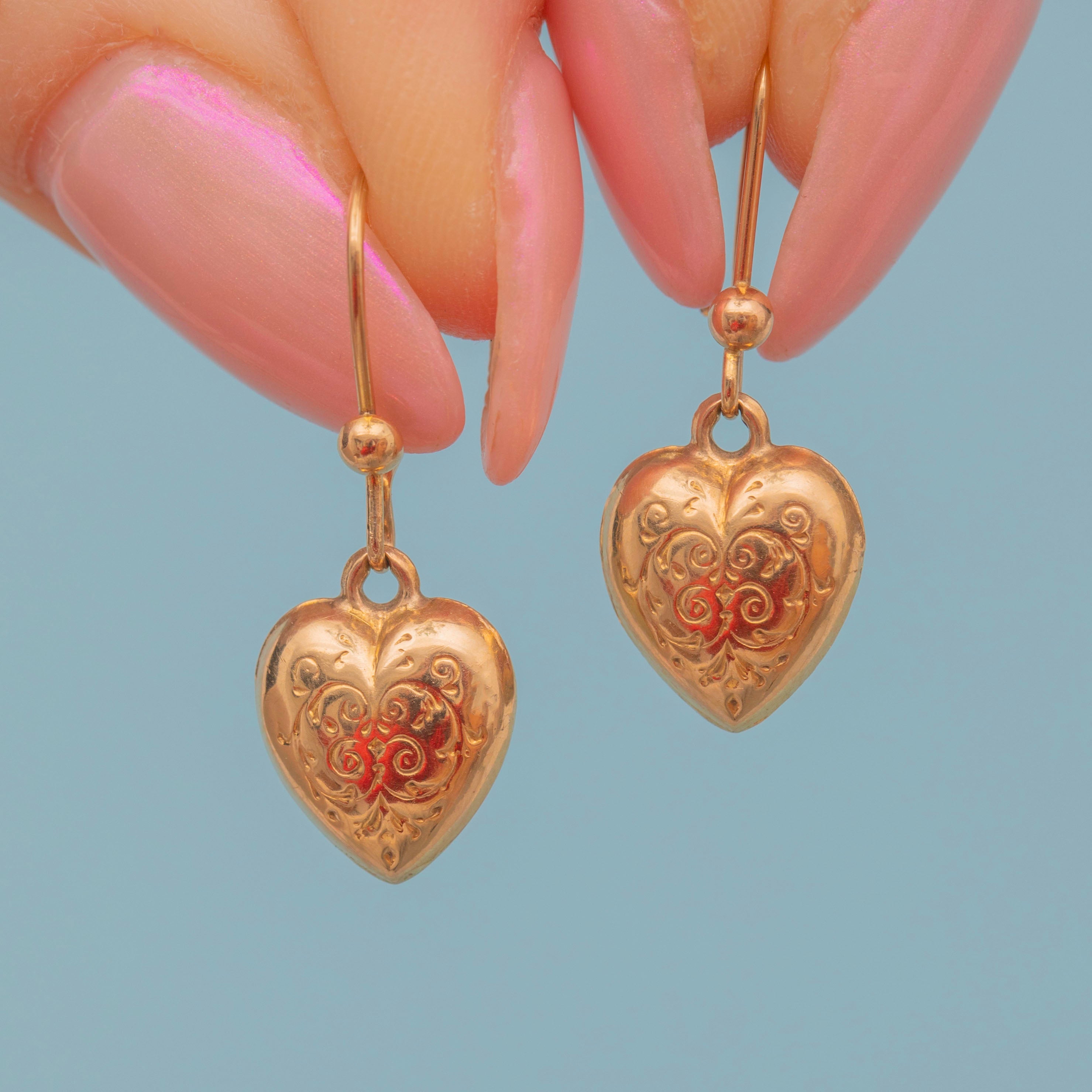 These vintage 9ct Gold engraved puffy heart earrings are delicate delights! An adorable staple pair perfect for everyday wear, each earring is intricately engraved with ornate detail and is crafted from saturated warm 9ct Gold that gleams exuberantly under the light.