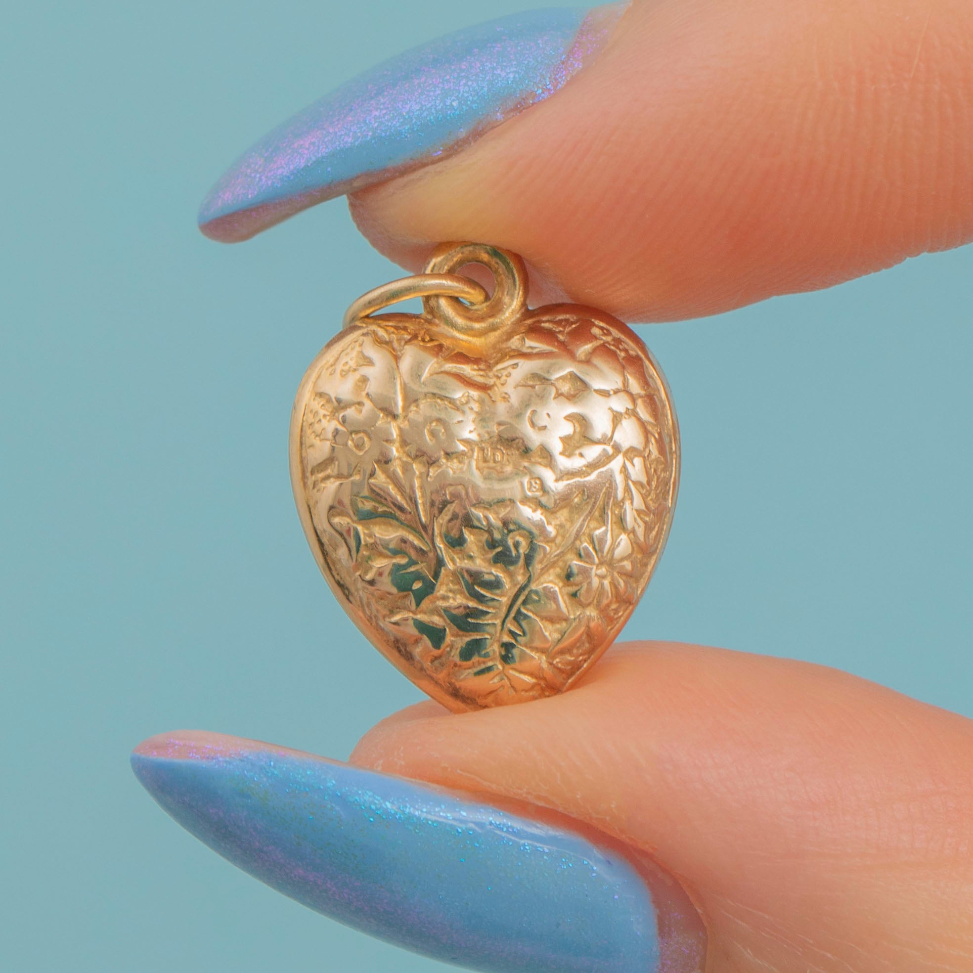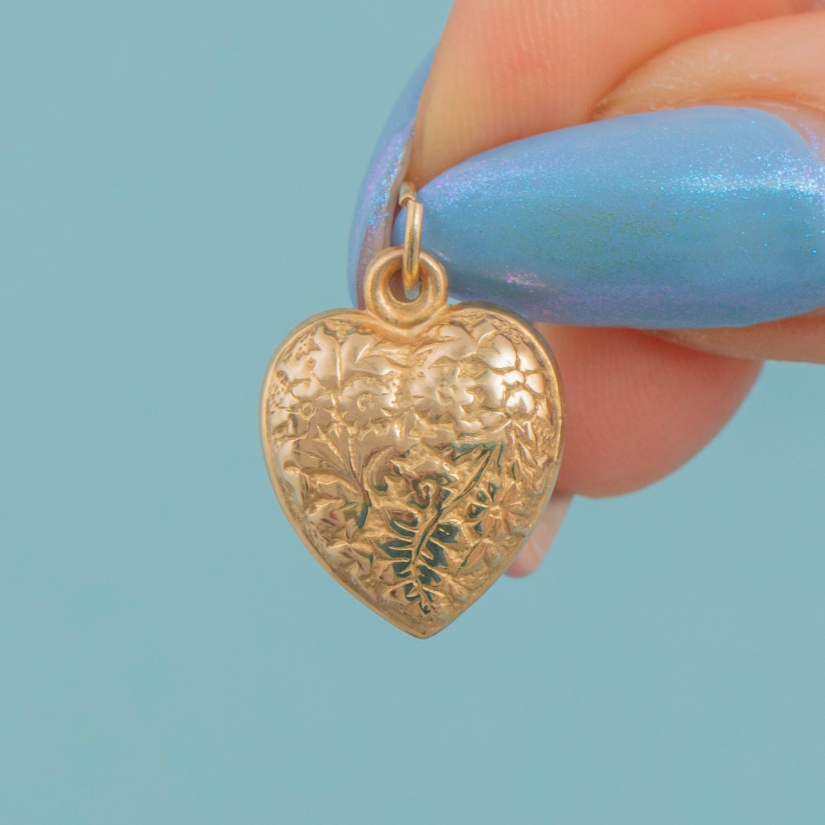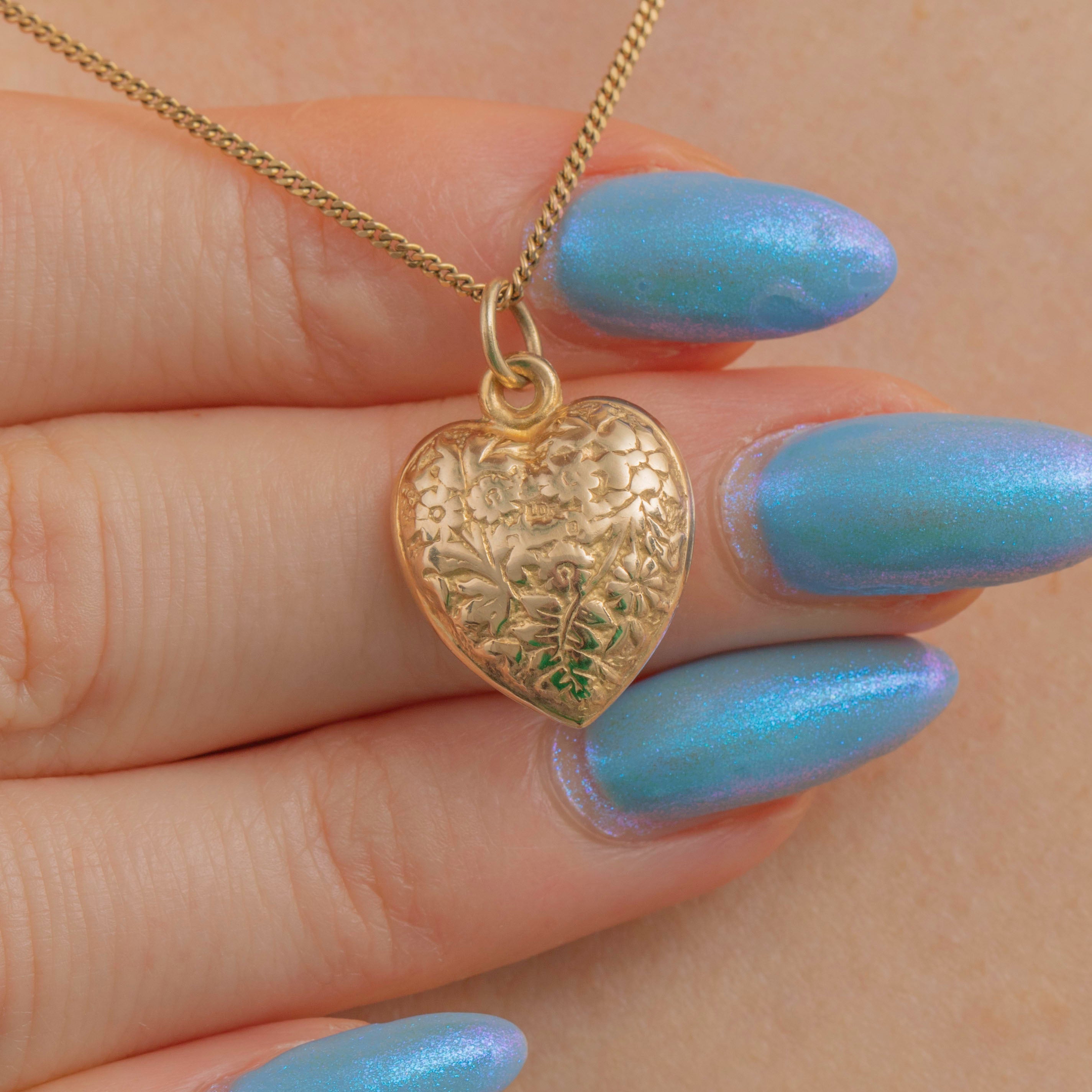EXCELLENT: This 9ct Gold engraved puffy heart pendant is in excellent condition. Her Gold is radiant and free from any visible signs of wear and her engravings are crisp. With a securely soldered jump ring, you can wear her with confidence.
