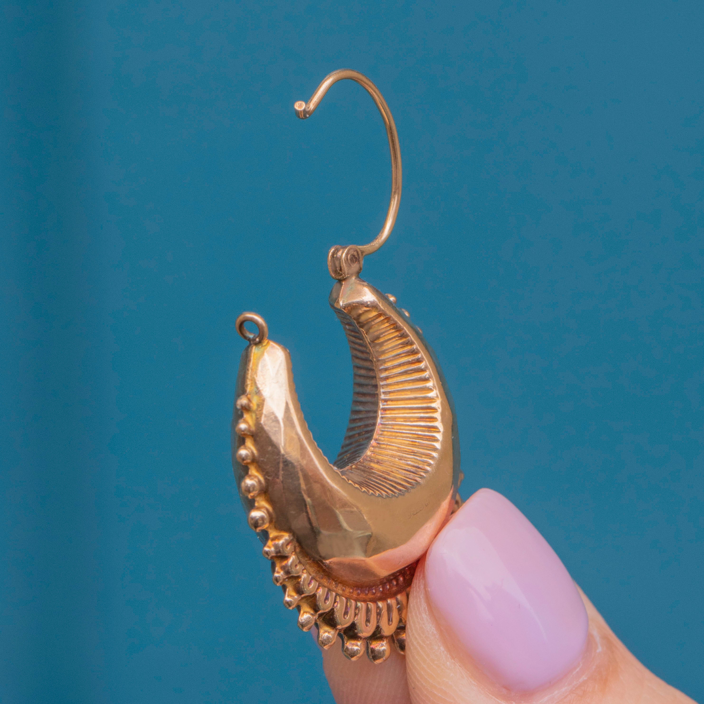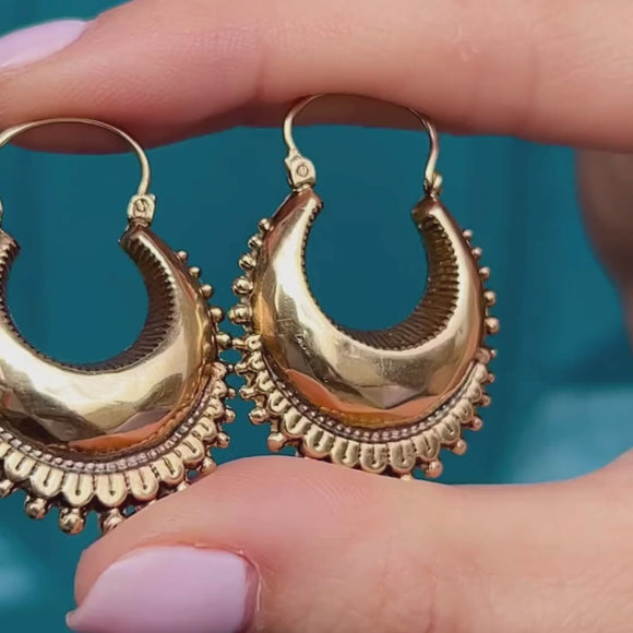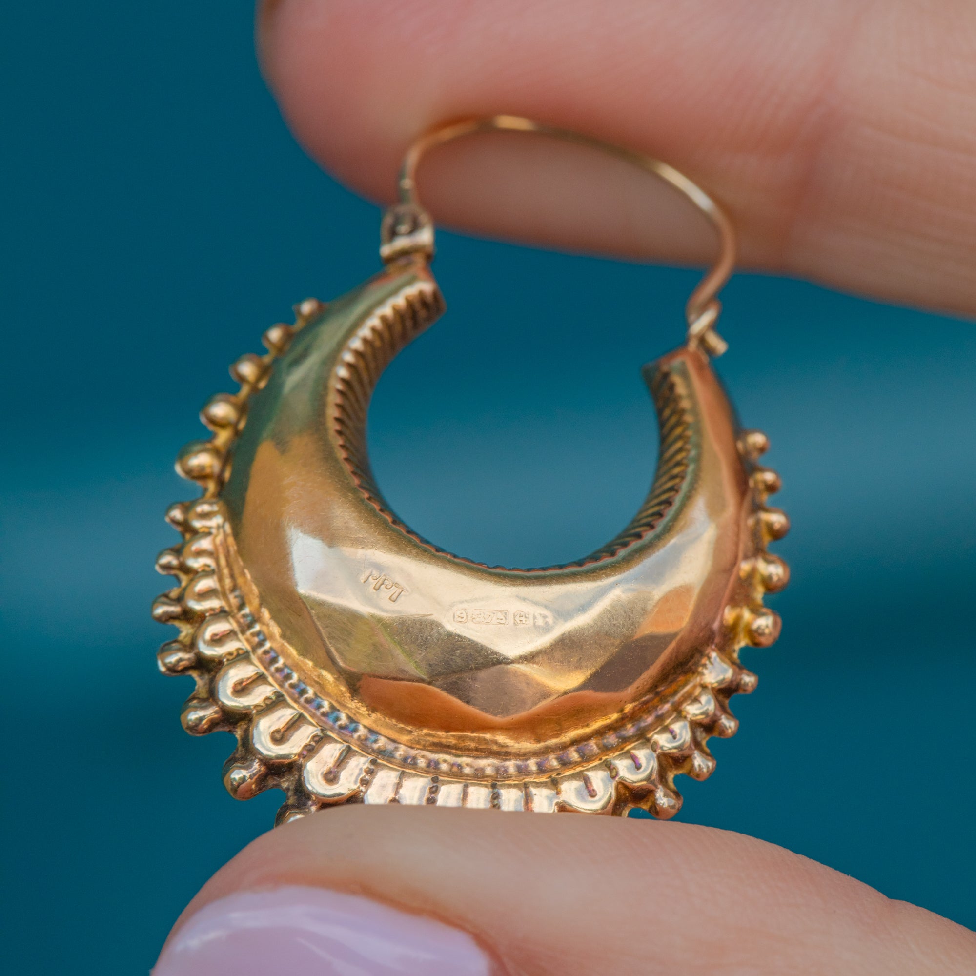 EXCELLENT. These 9ct Gold faceted fancy hoop earrings are in exceptional condition. The Gold is bright with no dings or dents to the body of the earrings. The hooks are sturdy and attach securely making them ready to wear or gift straight away.