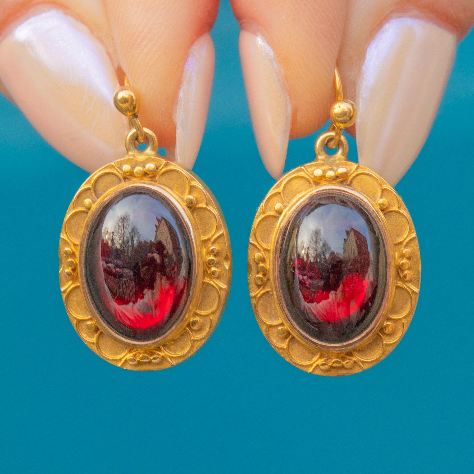 EXCELLENT. We are pleased to present these 9ct Gold Garnet cabochon earrings in excellent condition. The vibrant Garnets are free from any scuffs or nibbles and sit securely within their 9ct Gold settings. The earrings have a lovely swing and with little wear to note, promise many more years of enjoyment. The bottom of the earrings are fully hallmarked for the year 1999.