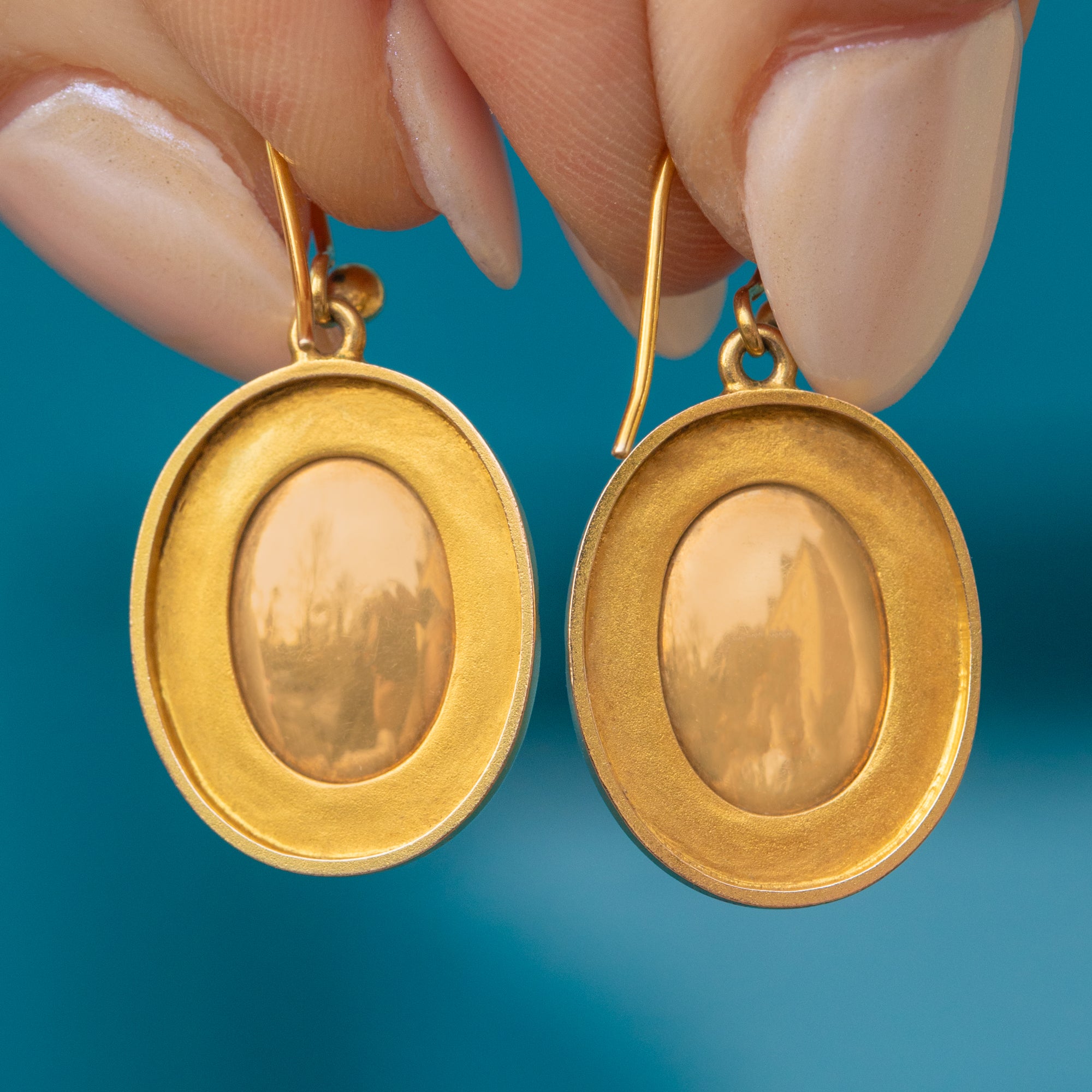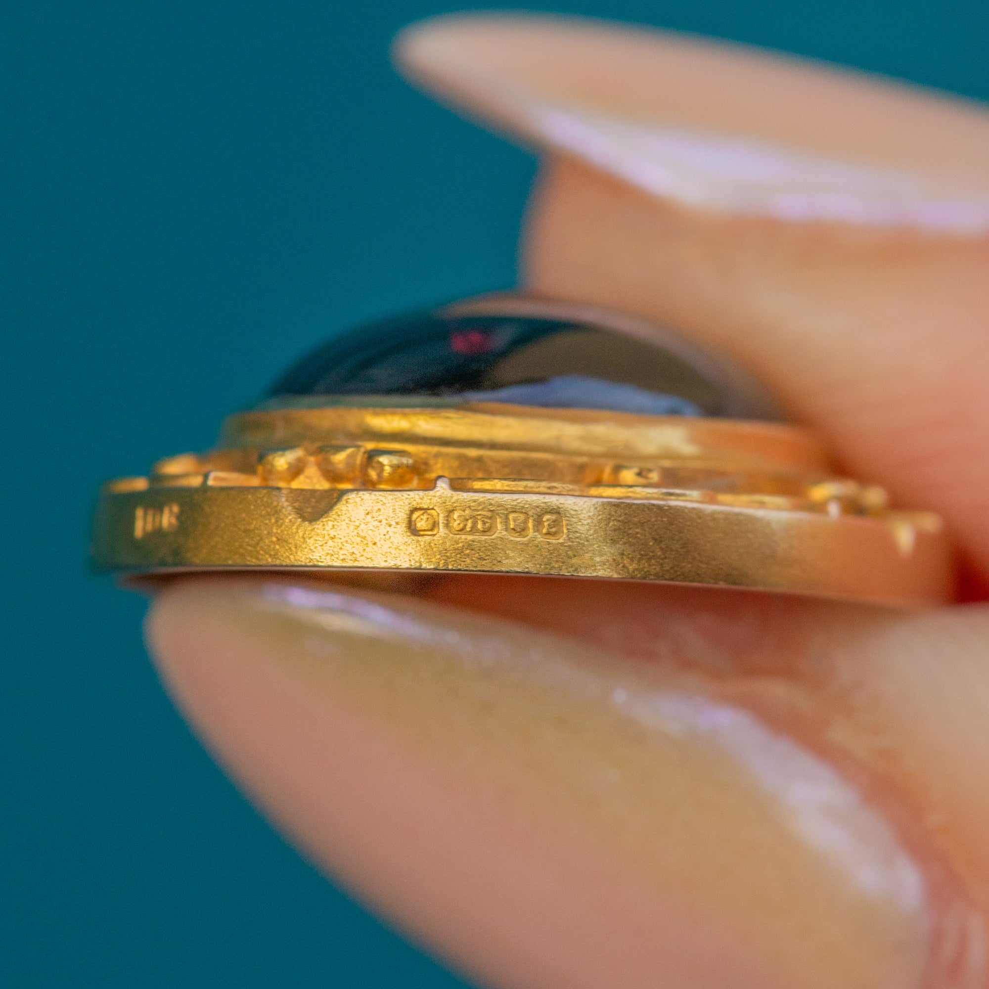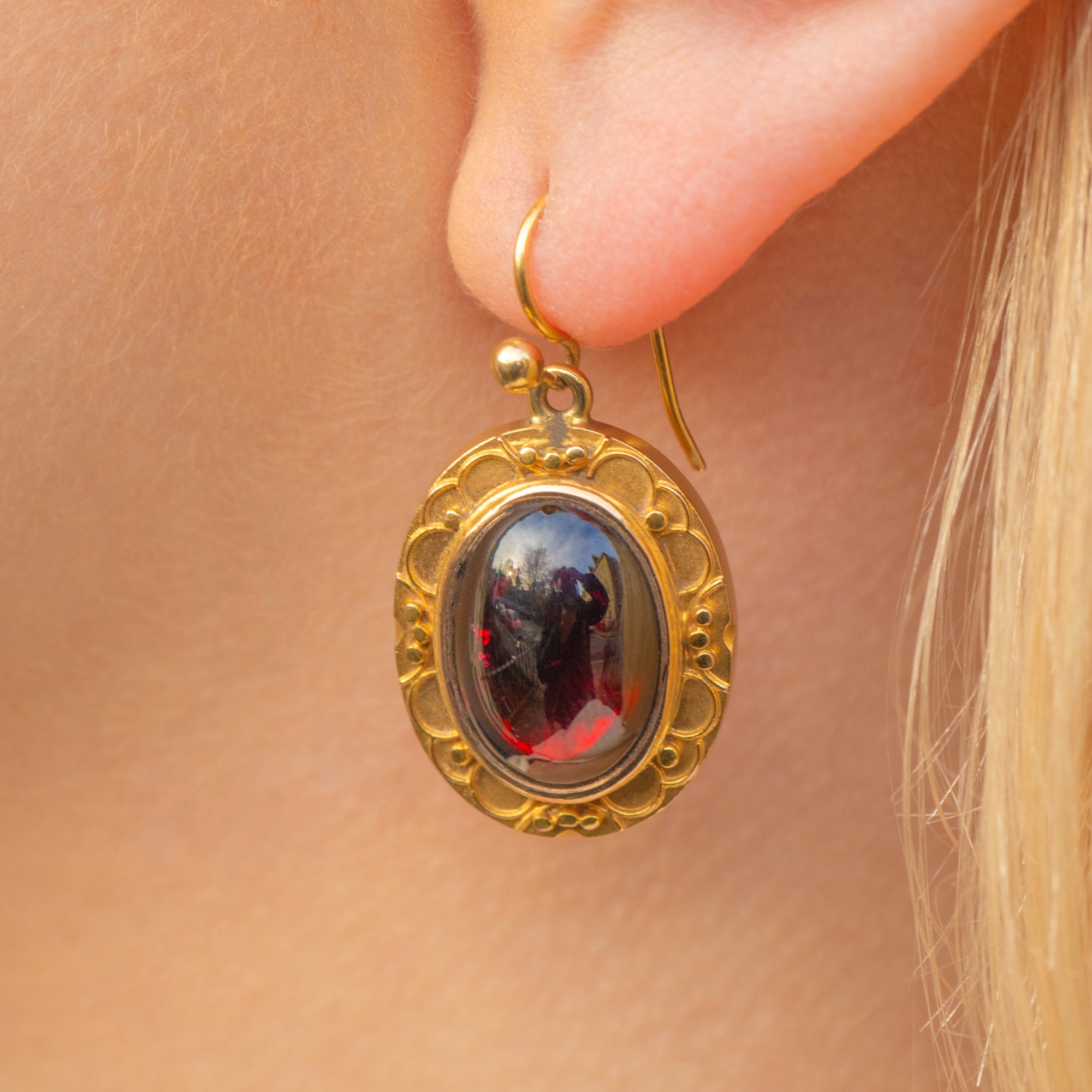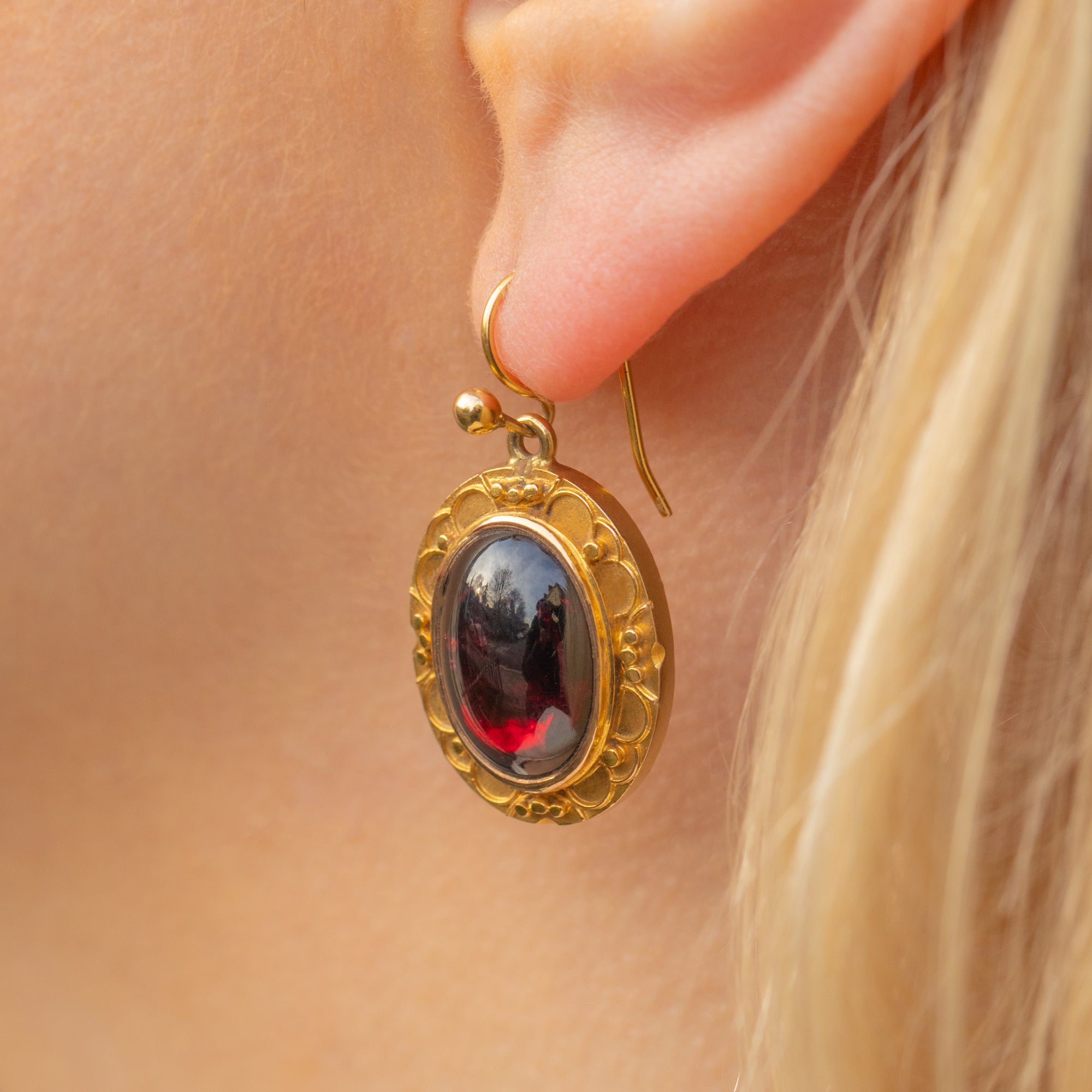 Crafted from buttery warm 9ct Gold, these vintage earrings each hold a gorgeous Garnet cabochon, exuding sophistication and timeless chic. Boasting a combined weight of 11.50 carats, the plump Garnets glow in the light, radiating deep cherry-red hues. They are effortlessly complimented by the warmth of their intricately detailed 9ct Gold settings, and have a gorgeous movement when worn.