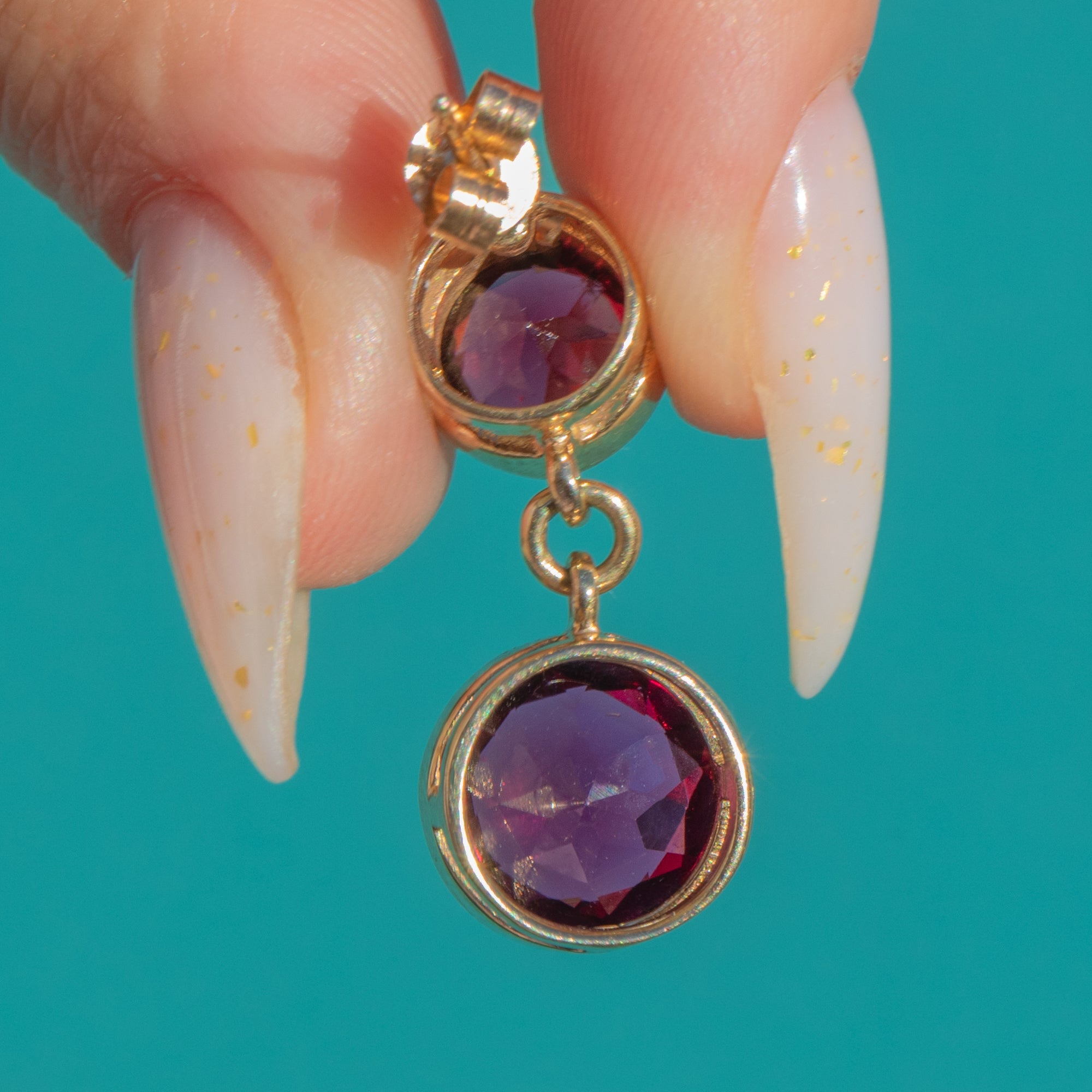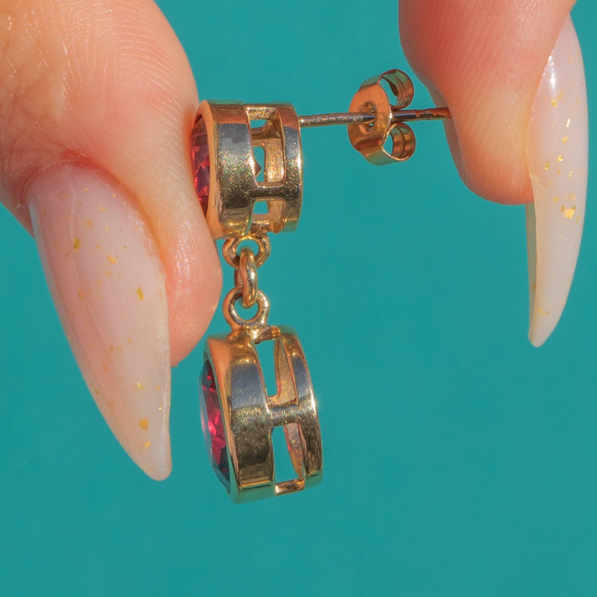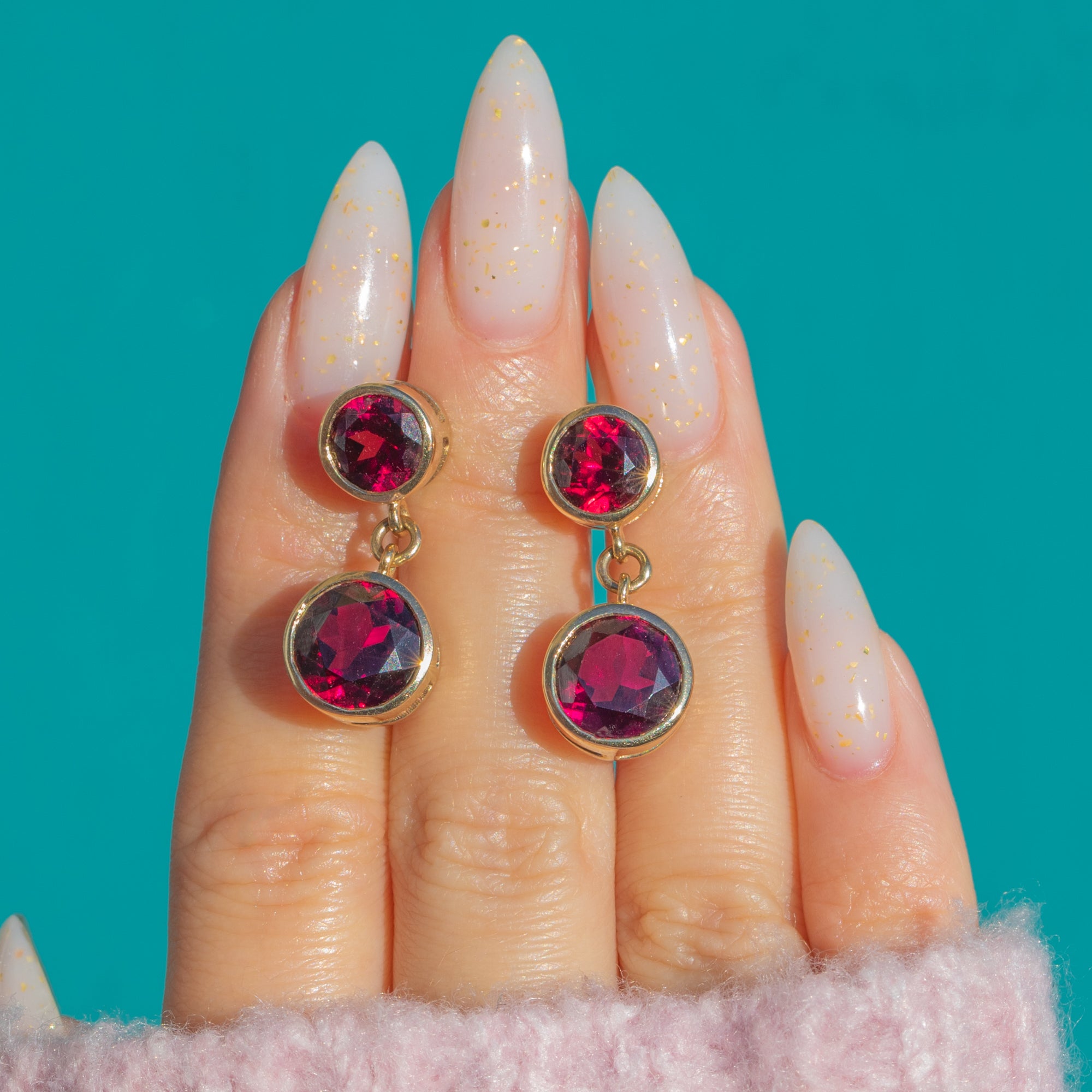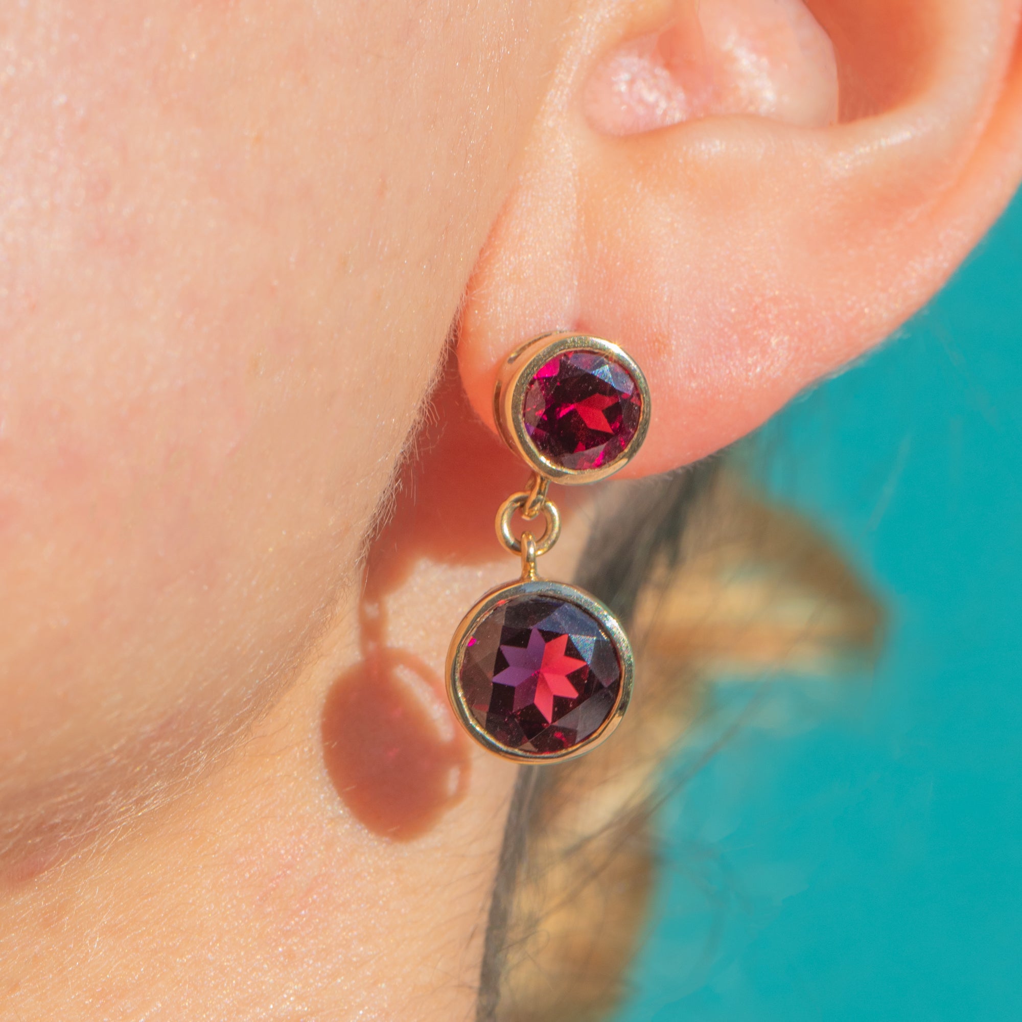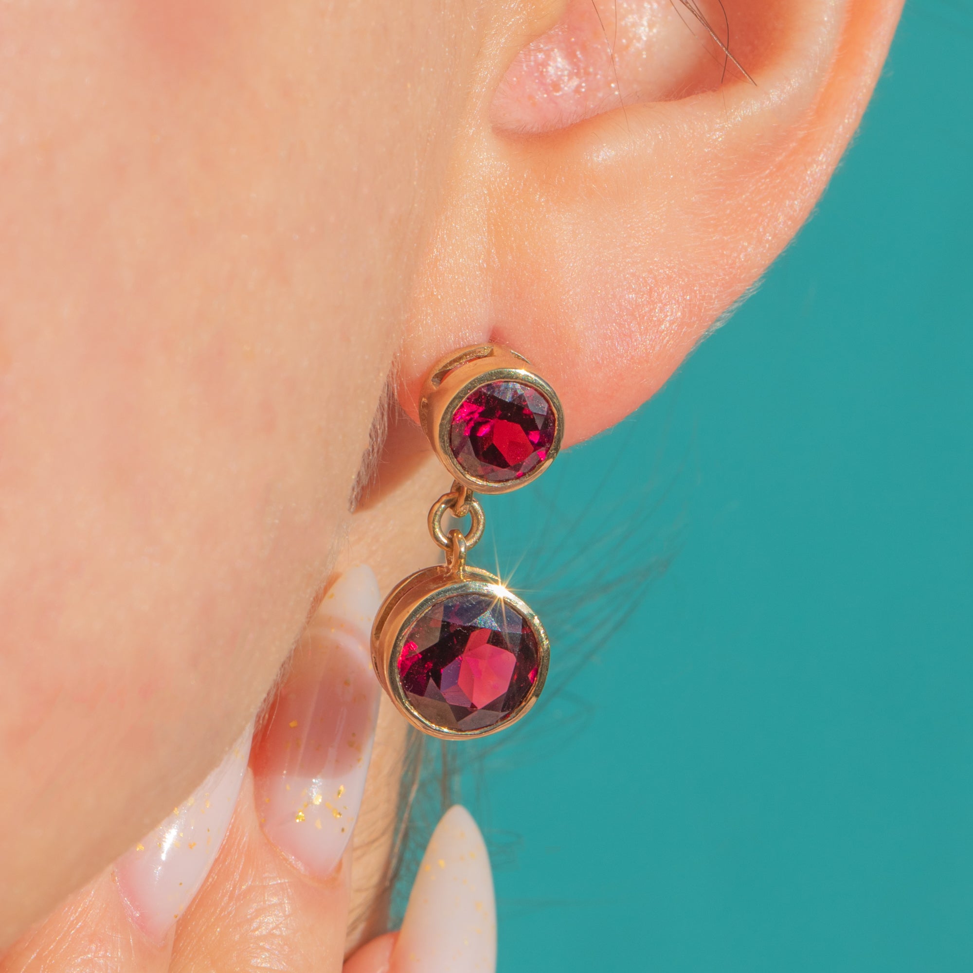 A richly coloured pair of Garnet drop earrings, each set with two glowing Garnets, 5.10ct in total, in sleek bezel settings. The design is wonderfully balanced: a neat round stud above, followed by a swinging larger Garnet drop that catches the light with every turn of the head.